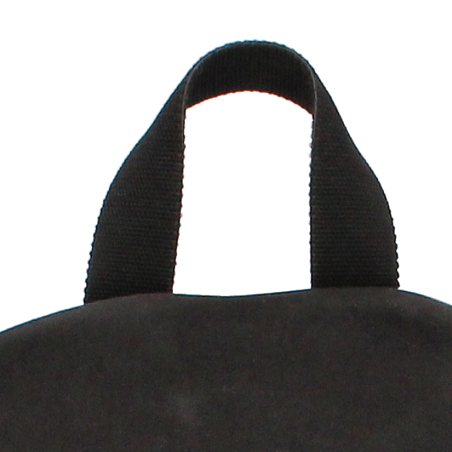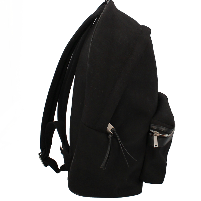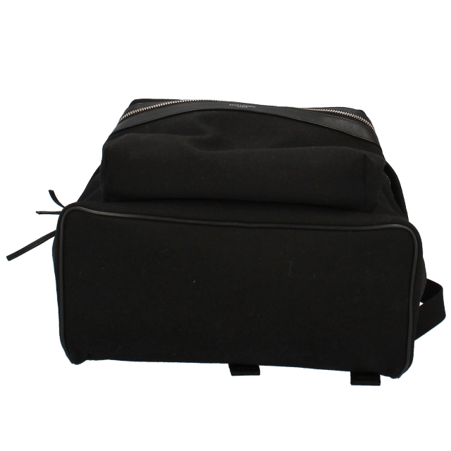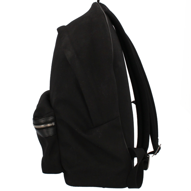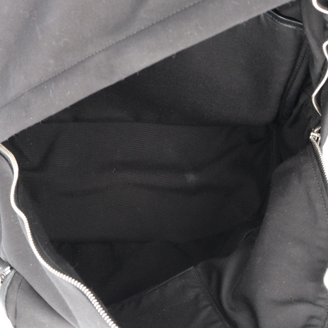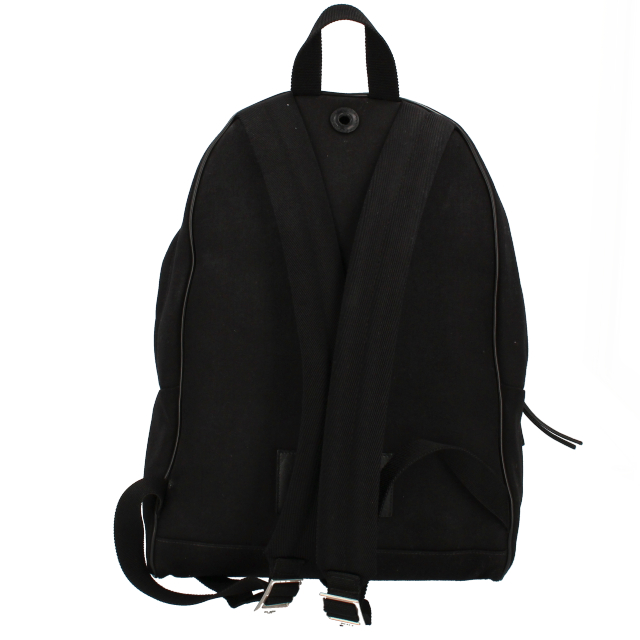 USED品。ブラックキャンバスのバックパック。アウターポケットにはレザートリムに箔押しが輝いており、上部にはロゴ刻印付きIDプレートやヘッドフォンポートがあしらわれています。背面には定期などを入れるレザーパッチ。ショルダーストラップは長さ調節可能です。