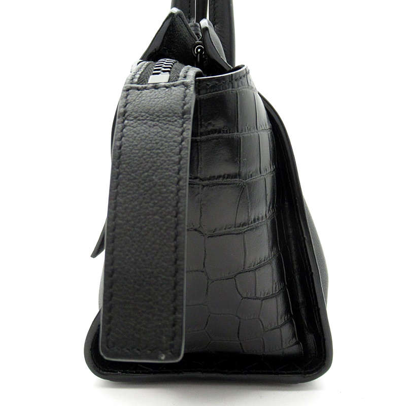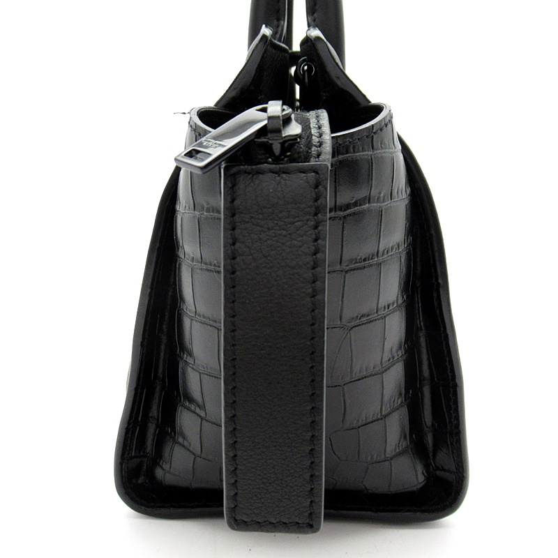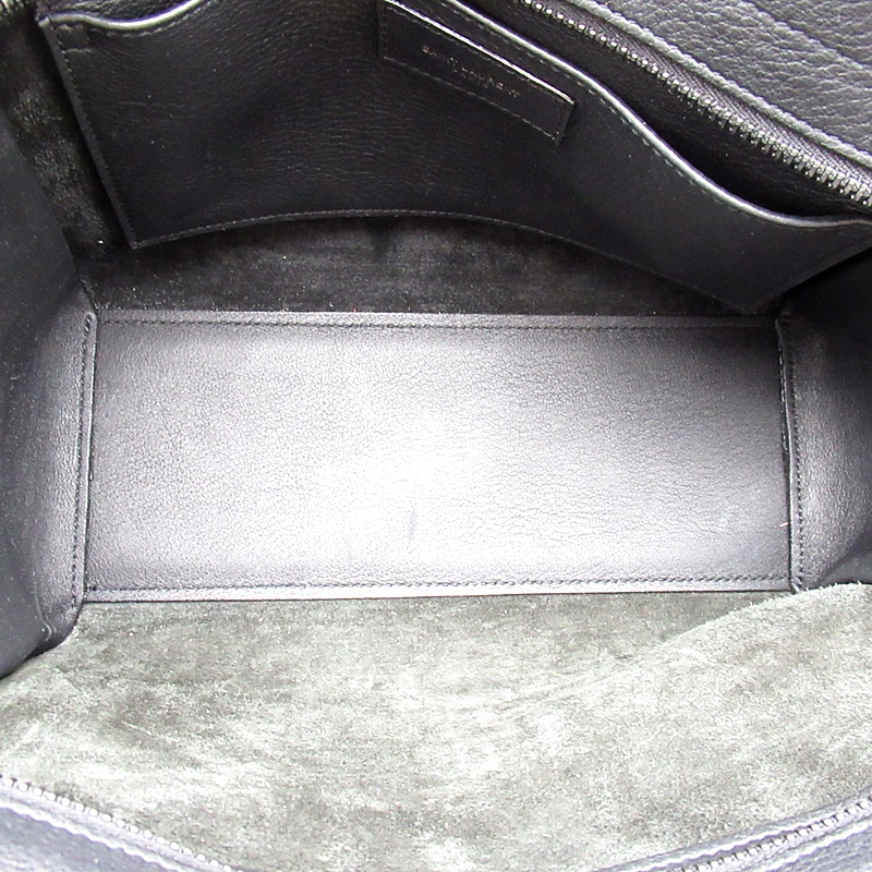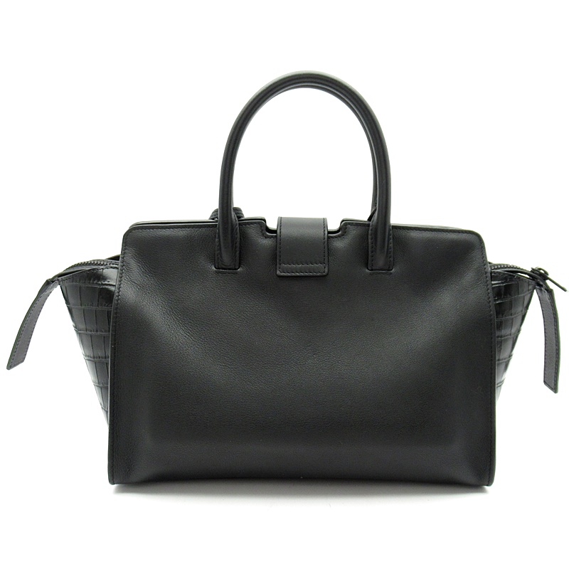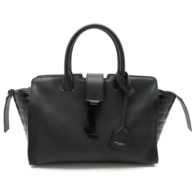 USED品。レザーハンドルと取り外し可能なショルダーストラップが付いたトートバッグ。ブラックのYSLロゴと取り外し可能なレザーで覆われたキーチェーンチャームがあしらわれています。
