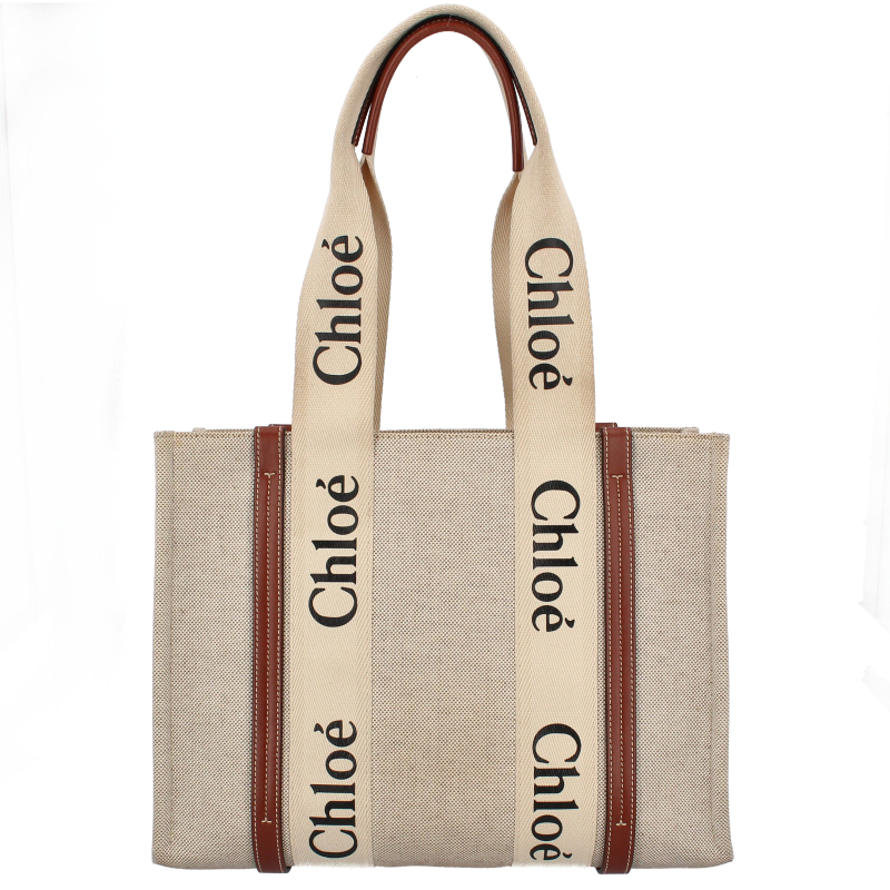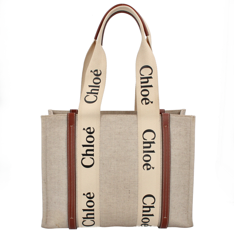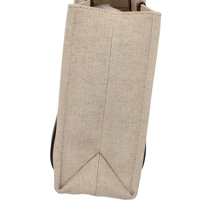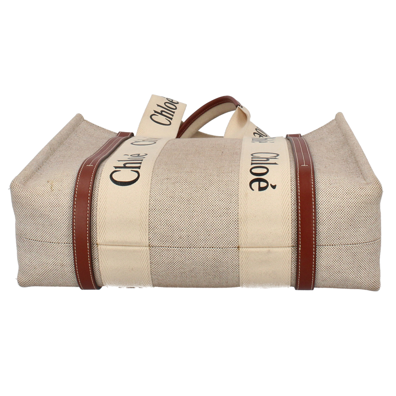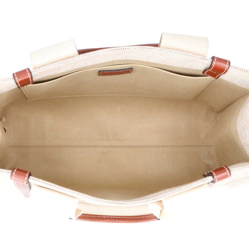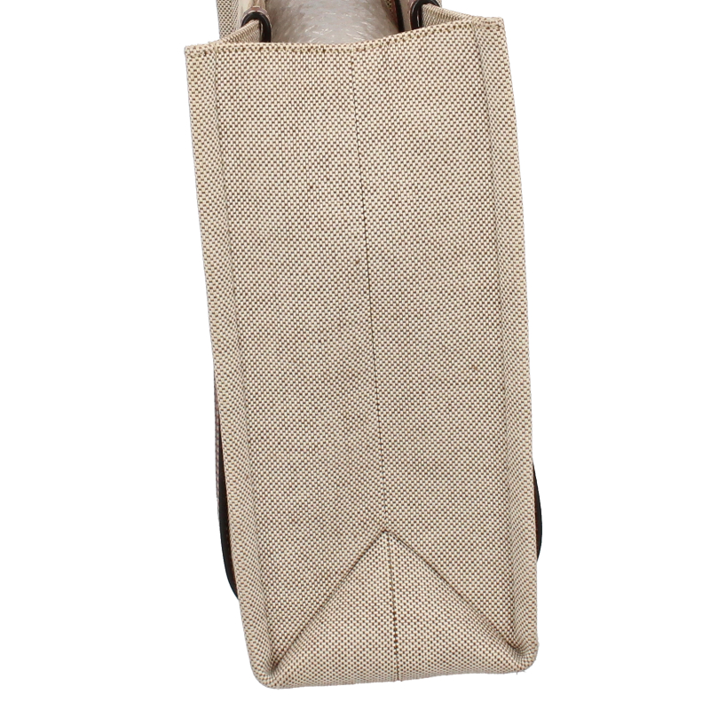 USED品。より環境に優しいリネンキャンバスにシャイニーカーフスキンの飾り紐をあしらった「Woody」ミディアムトートバッグ。力強い夏のムードを放つ収納力のあるバッグです。大きな内側のコンパートメントには、実用的なフラットポケットが備えられています。