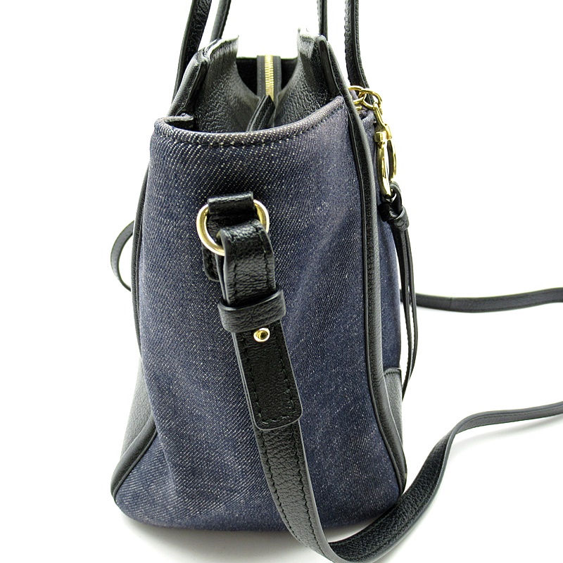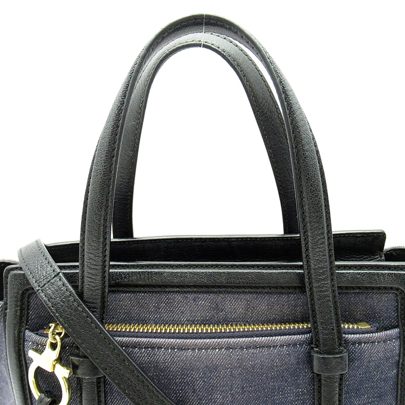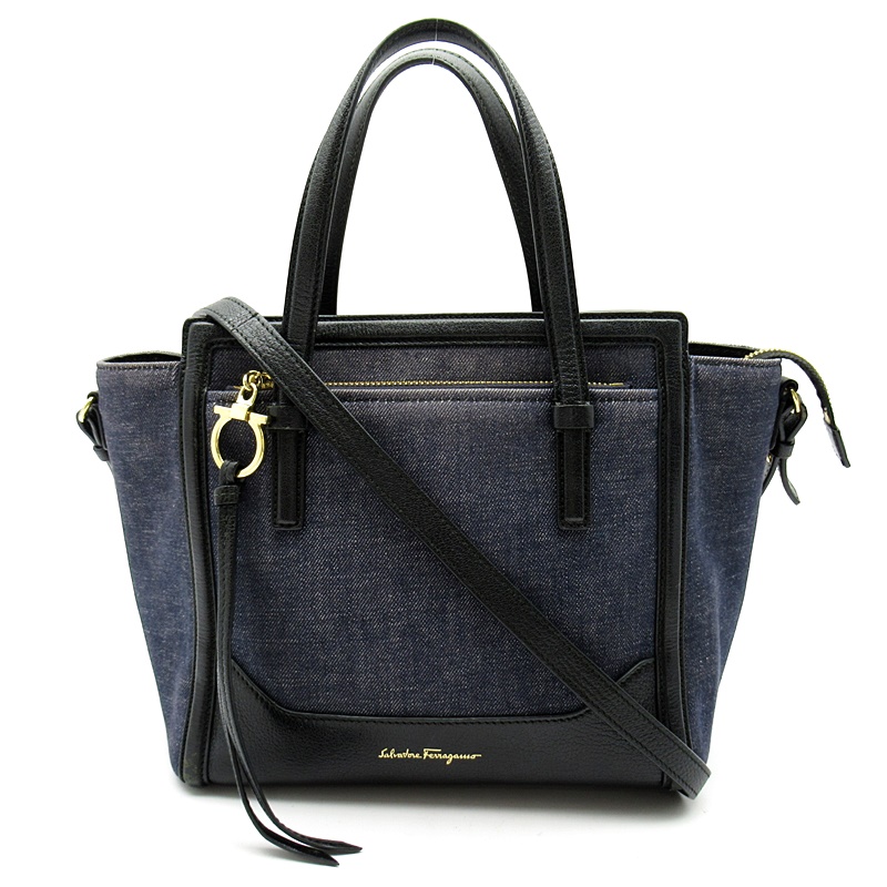 USED品。フェラガモのデニム生地にワンポイントロゴがオシャレなトートバッグです。マチも広く収納力抜群で荷物が多い方にもおすすめのアイテムです。