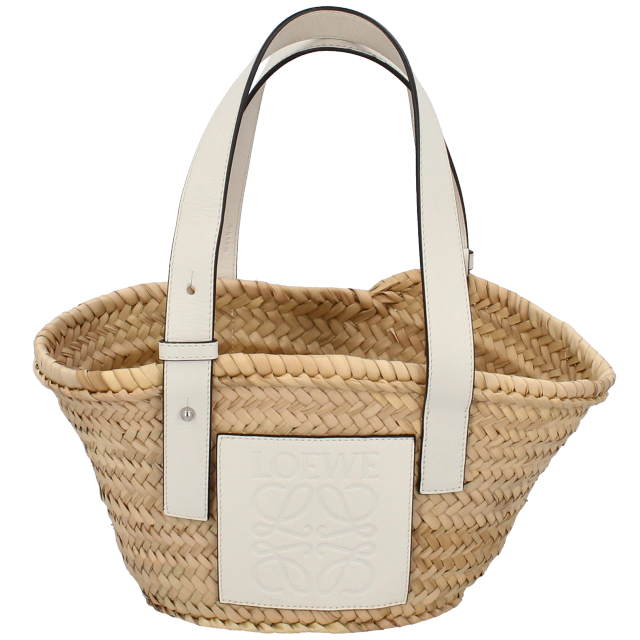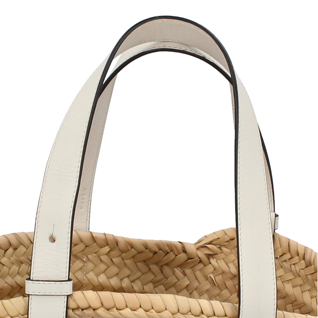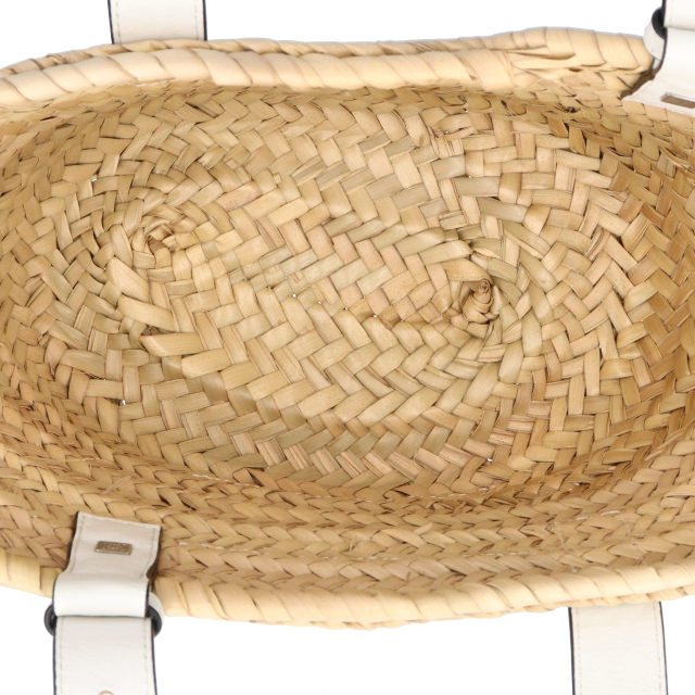 USED品。アイコンロゴが印象的なラフィア素材のバスケットトートバッグ。シンプルでモダンなアナグラムが上品な雰囲気を漂わせます。