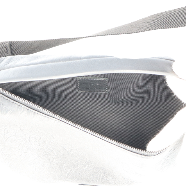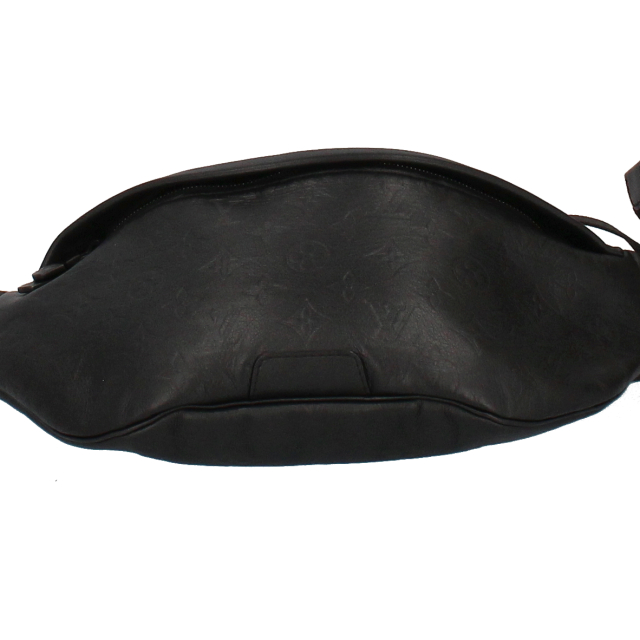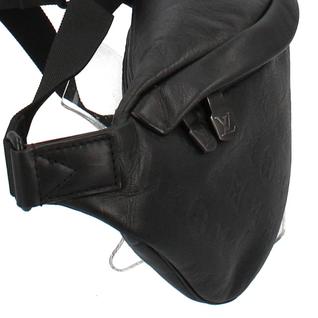 USED品。モノグラムシャドーレザーを使用した「ディスカバリー・バムバッグ」。前面と背面には、スマートフォンやカード、鍵を簡単に取り出せるファスナー付きポケットを備えています。