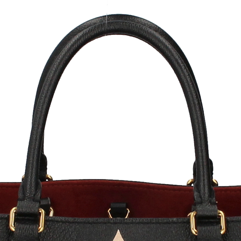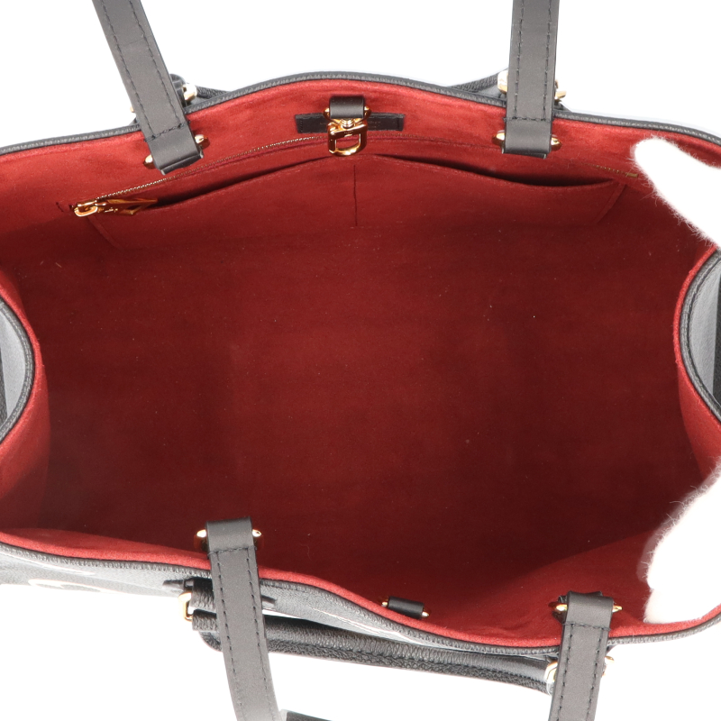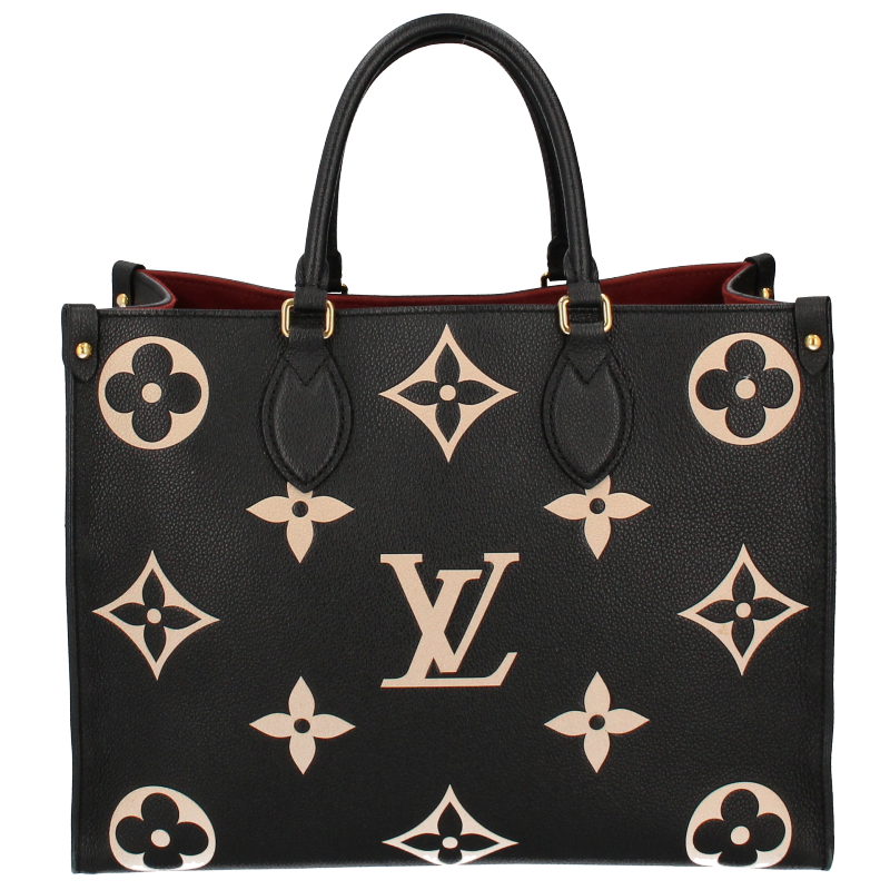 USED品。長短2種類のハンドルで、手持ちやショルダーバッグとしてもお楽しみいただけるミディアムサイズの「オンザゴー MM」。しなやかなグレインカーフレザーに、ミディアムサイズのモノグラム・パターンをプリントとエンボス加工であしらいました。