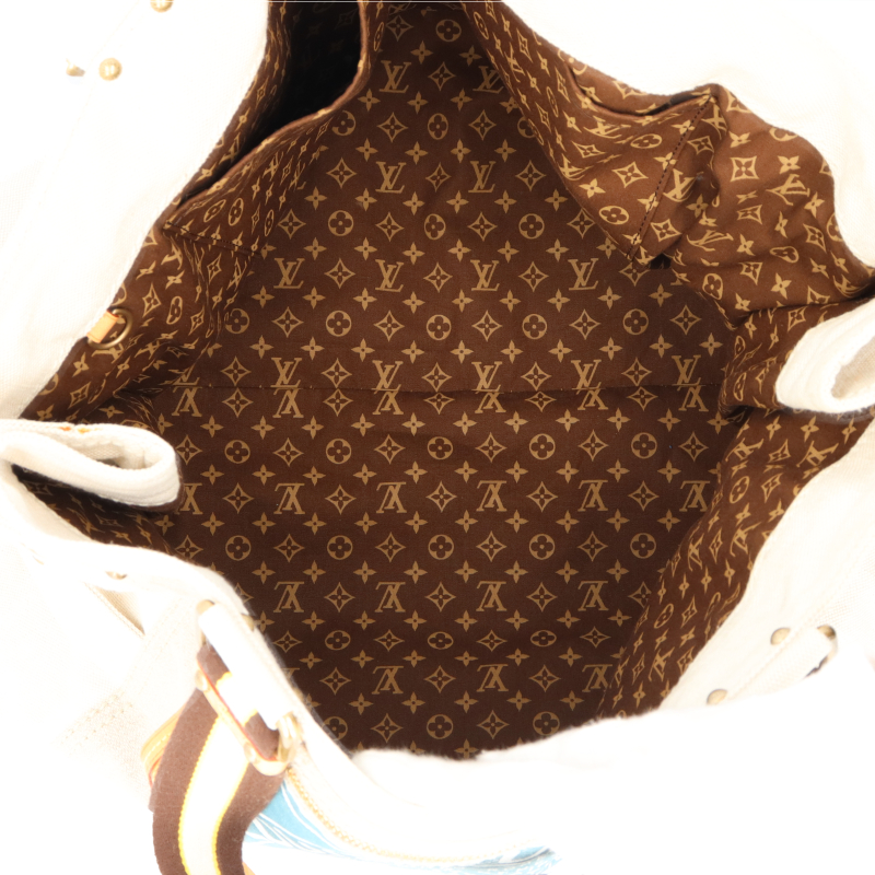 USED品。廃盤品。クルーズラインの人気トートバック「グローブショッパー GM」です。正面ロゴには世界各国のヴィトンの店舗がある都市の名前がデザインされ、ストライプのハンドルなどカジュアルなデザインに仕上がっています。