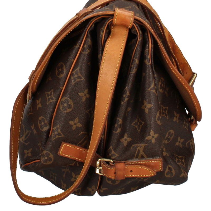 USED品。廃盤品。クラッシックな馬のサドルのモチーフをモダンにアレンジしたバッグです。中央で折れ曲がる両面タイプの定番斜め掛けショルダー付き。大きめサイズで、お出かけ時にも大活躍します。