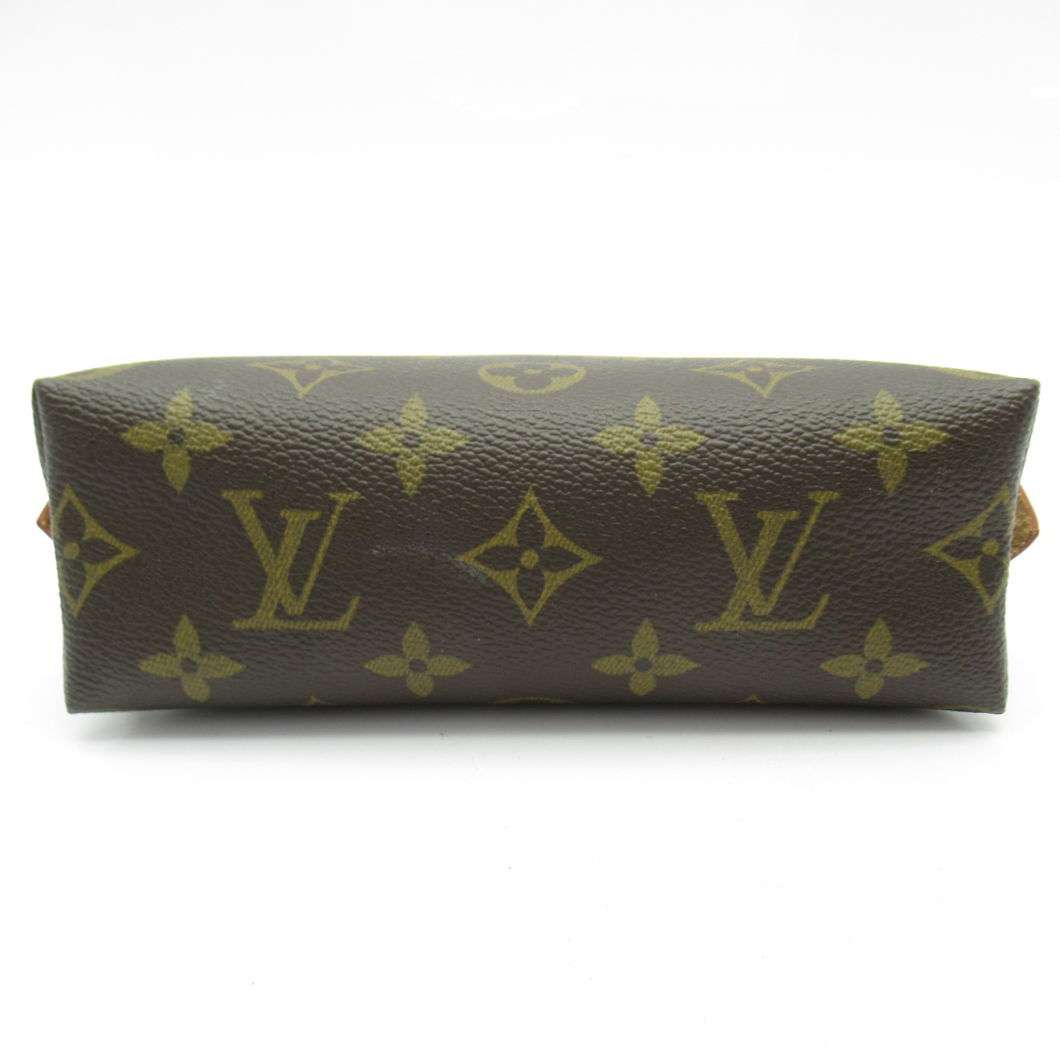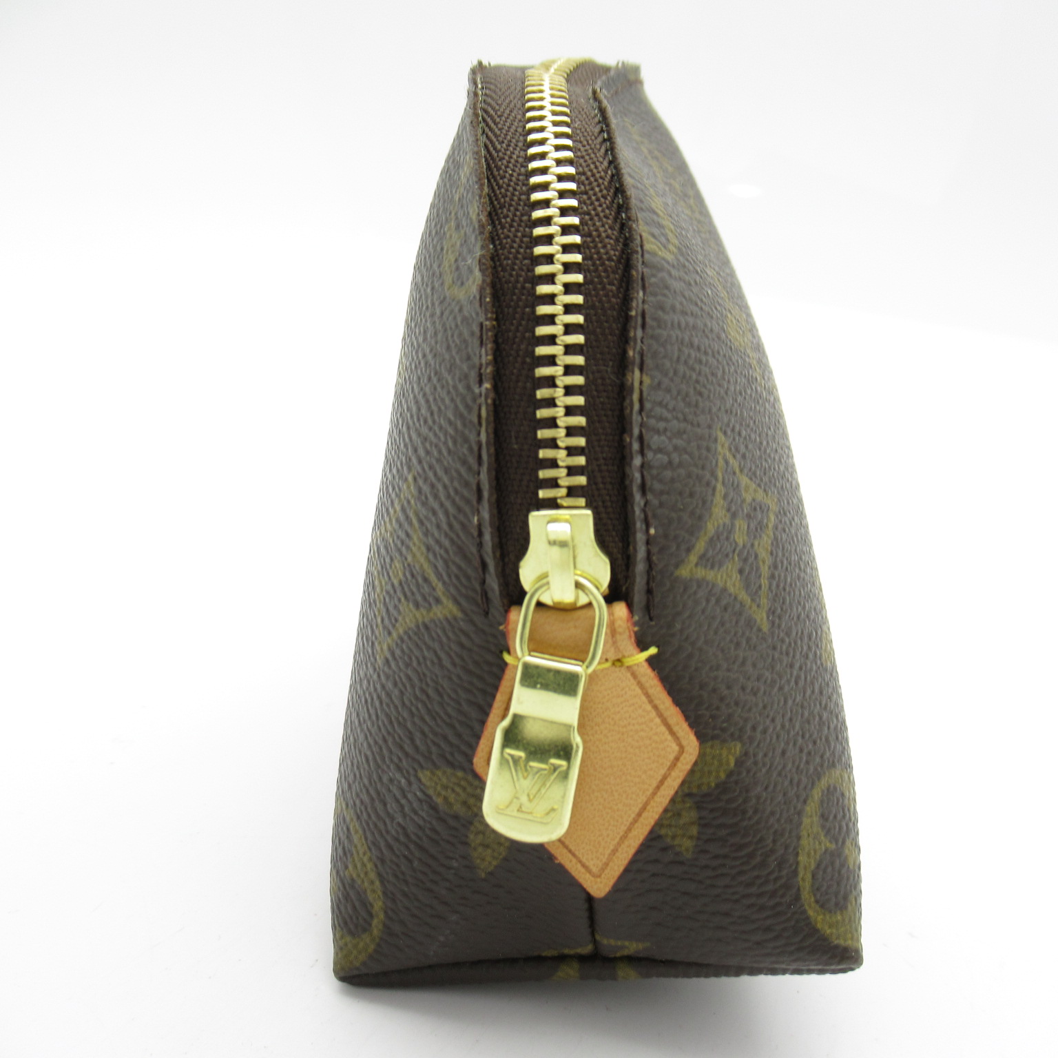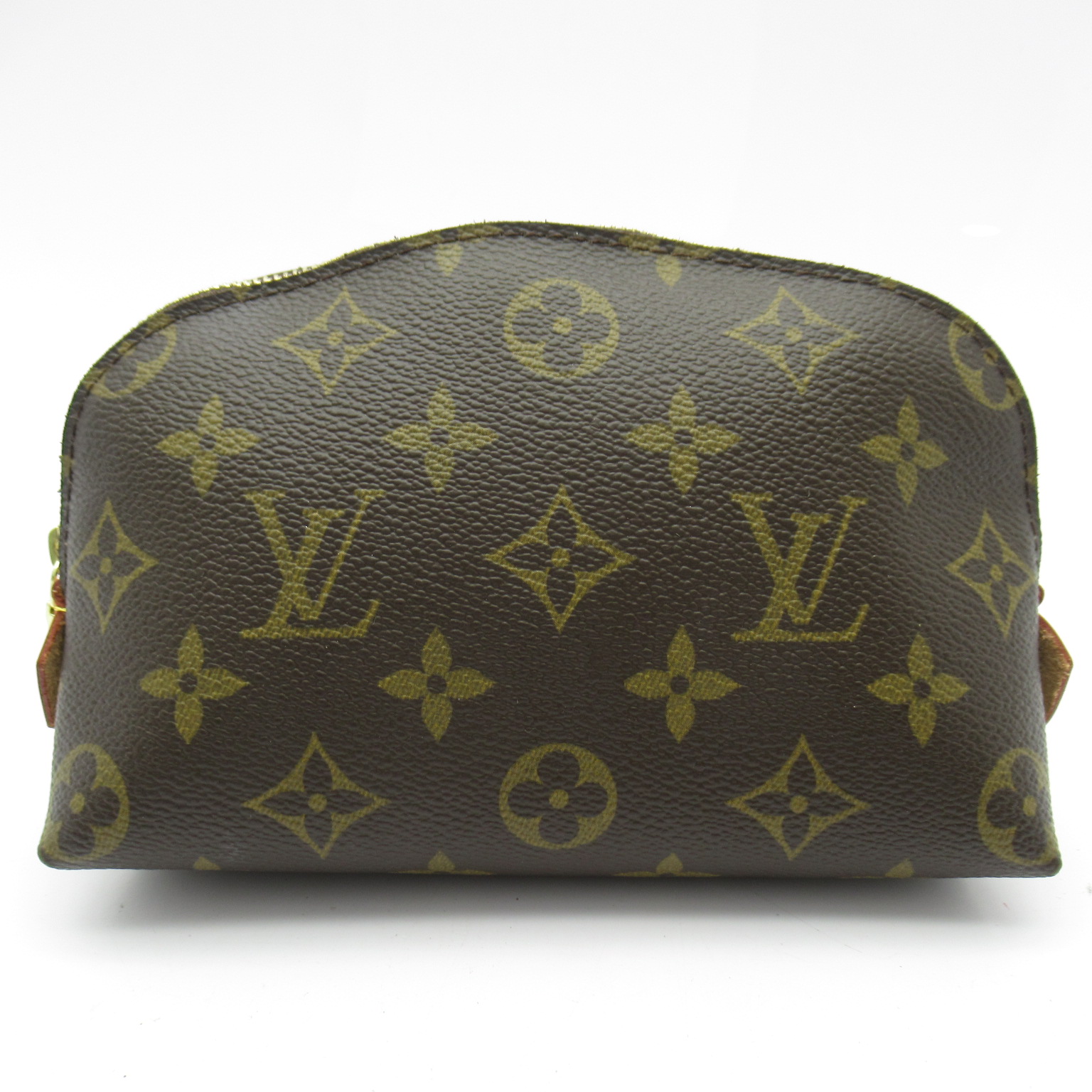 USED品。内側に防水加工が施されているので、化粧水など水気のあるものも安心して入れられます。サイドまで深めに開くファスナー式で物の出し入れもスムーズ。ポケットが付いているのも便利なポイントです。