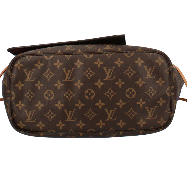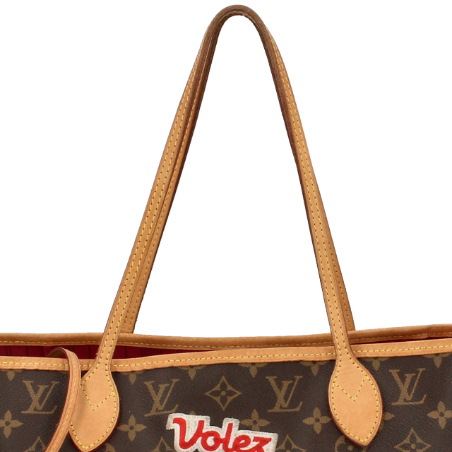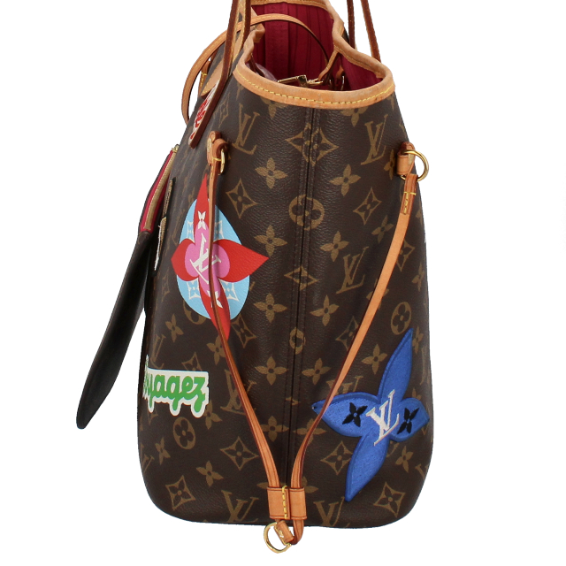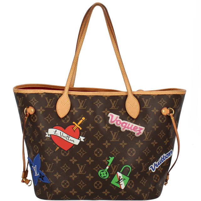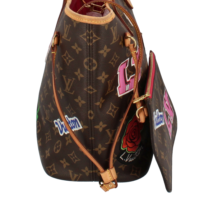 USED品。廃盤品。モノグラムキャンバスにポップなプリントやワッペンがデザインされた『ネヴァーフルMM パッチーズ』。サイドレースを締めれば洗練された印象を放ち、緩めればカジュアルな表情を見せてくれます。取外し可能なポーチは、クラッチやバッグのポケットとしてお使いいただけます。