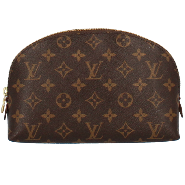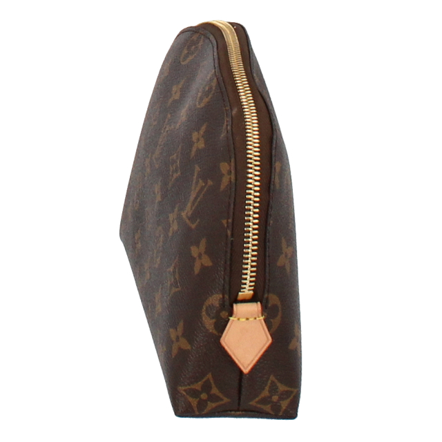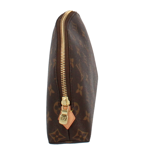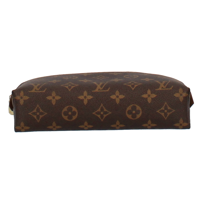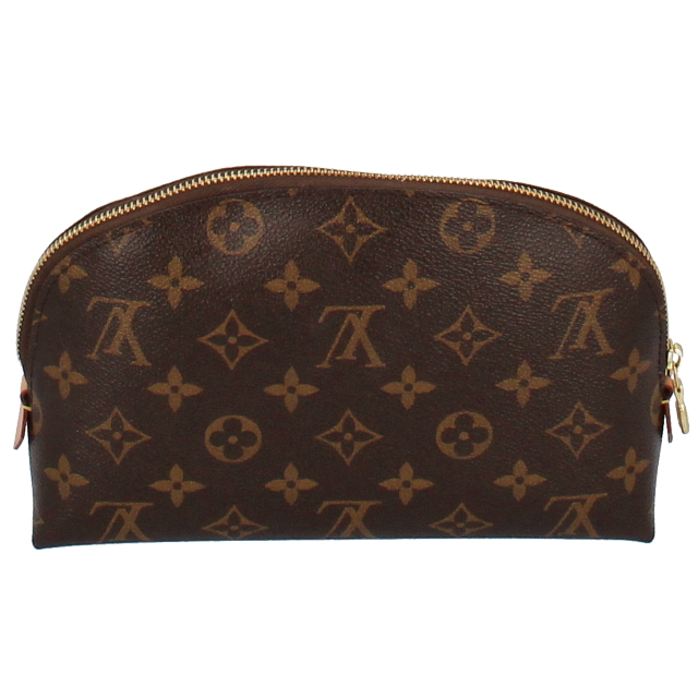 USED品。スタイリッシュなモノグラム・キャンバスで仕立てたラグジュアリーな「ポシェット・コスメティック GM」。光沢感のあるゴールドカラーのメタルパーツのディテールとテキスタイルのライニングが、エレガントな雰囲気を完成させます。
