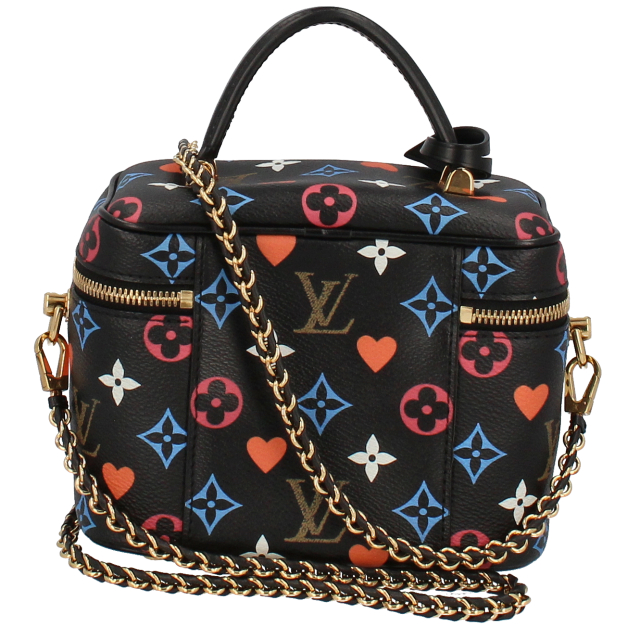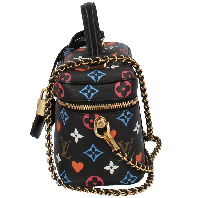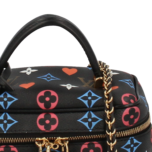 USED品。廃盤品。新たにデザインされたゲーム・オン キャンバスで仕立てた「ヴァニティ PM」。ニコラ・ジェスキエールが手掛けたカプセル・コレクション「ゲーム・オン」のパターンを取入れることで、独特の世界観を描き出しました。鮮やかなブルーとレッドのモノグラム・フラワー モチーフが目を引きます。手持ちでも、ショルダーやクロスボディバッグとしてもお使いいただける、コンパクトでしなやかなバッグです。
