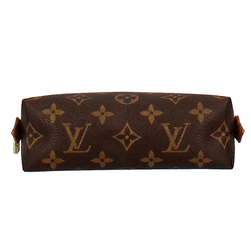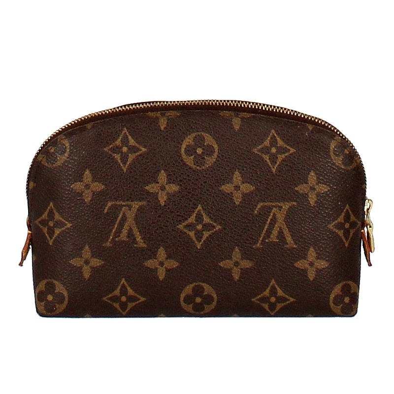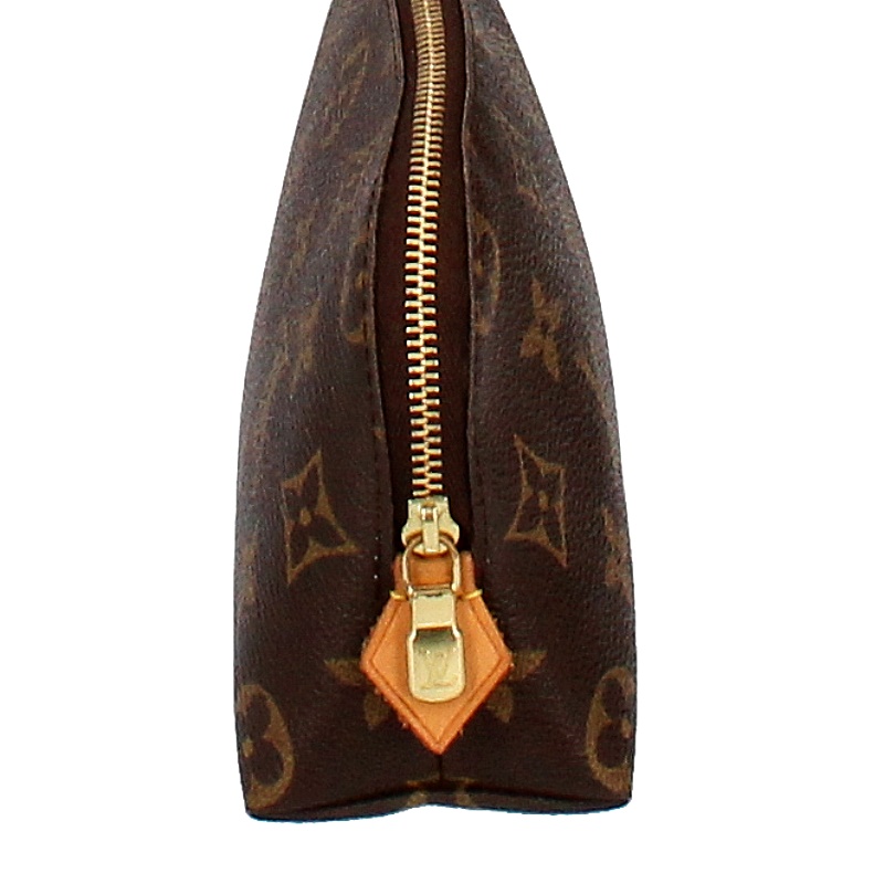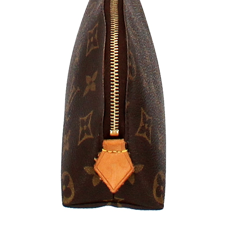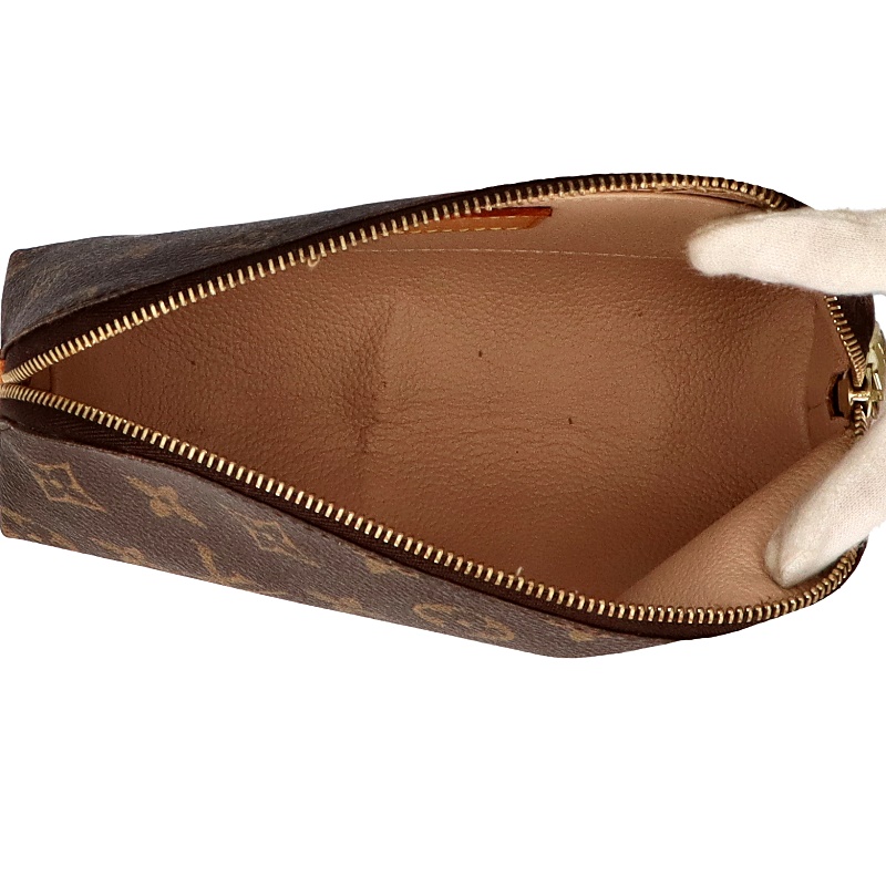 USED品。内側に防水加工が施されているので、化粧水など水気のあるものも安心して入れられます。サイドまで深めに開くファスナー式で物の出し入れもスムーズ。ポケットが付いているのも便利なポイントです。