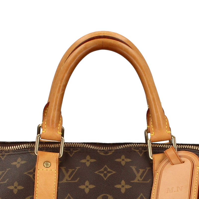 多少使用感有。ヌメ革に色焼け、黒ずみ、シミがあります。内部に少々の汚れがあります。角擦れがあります。ハンドル糸にほつれがあります。ネームタグイニシャル入(M.N)。