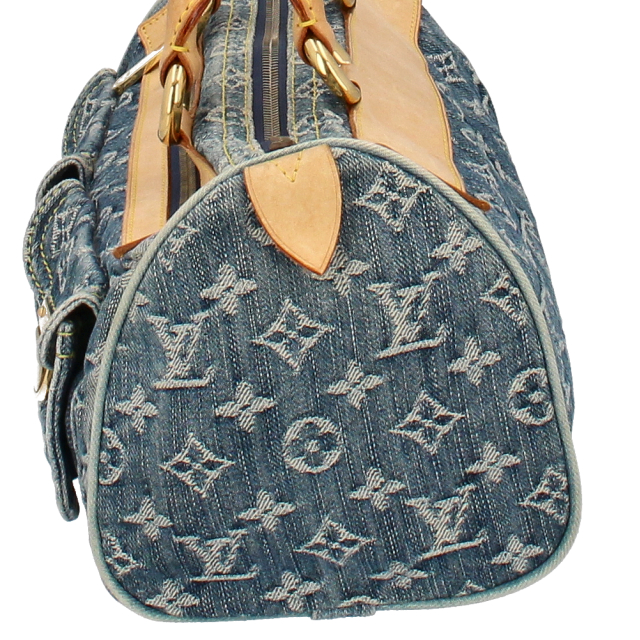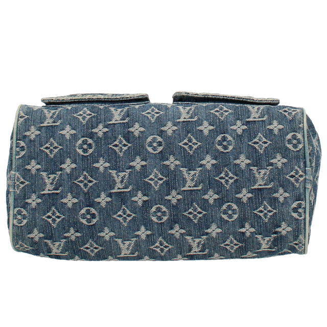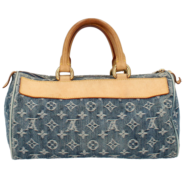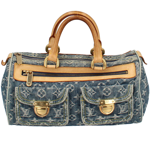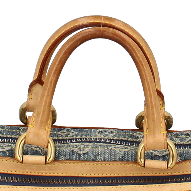 多少使用感有。ヌメ革にシミがあります。ハンドルに黒ずみと傷があります。ファスナー金具に変色があります。デニムに色褪せがあります。