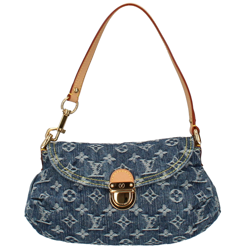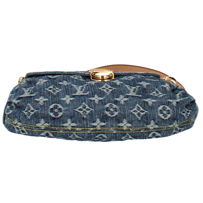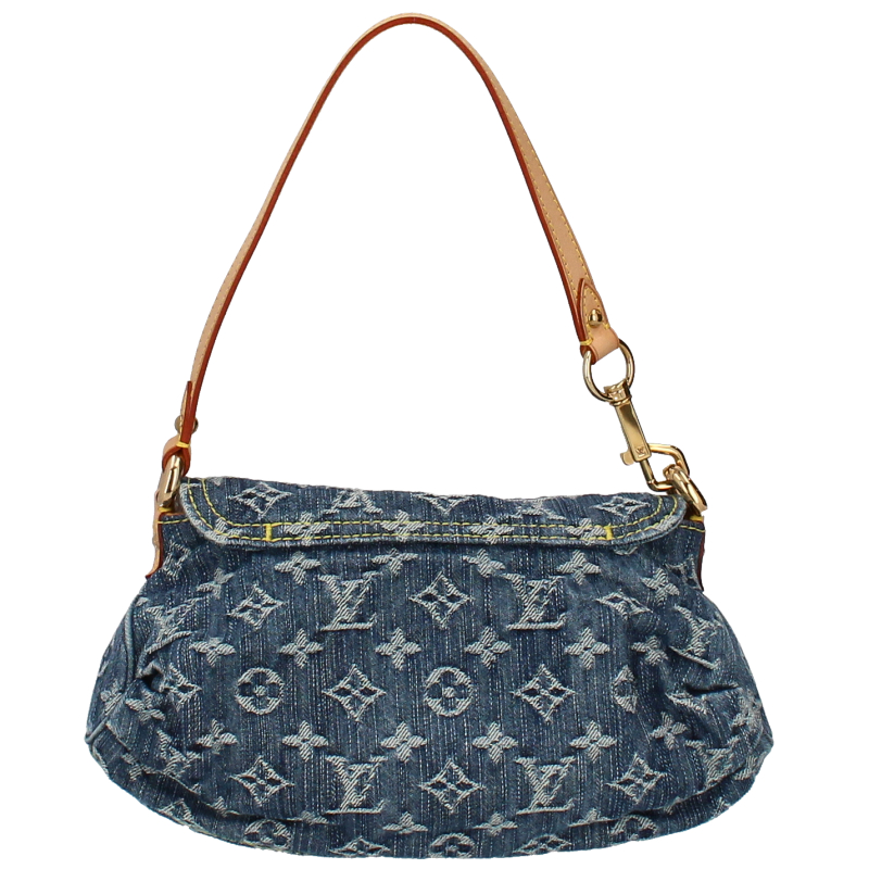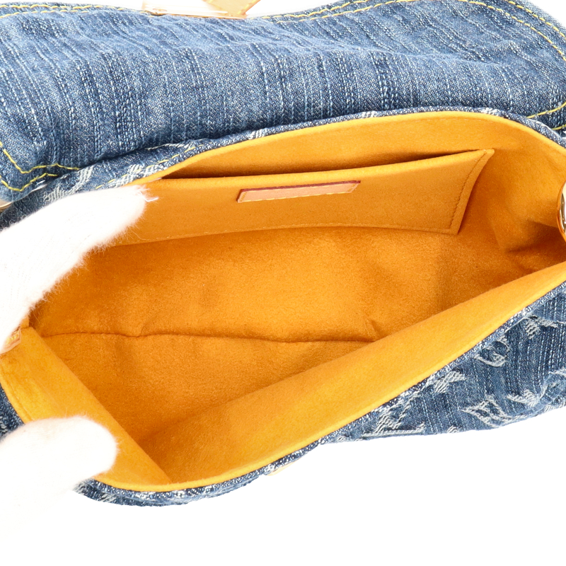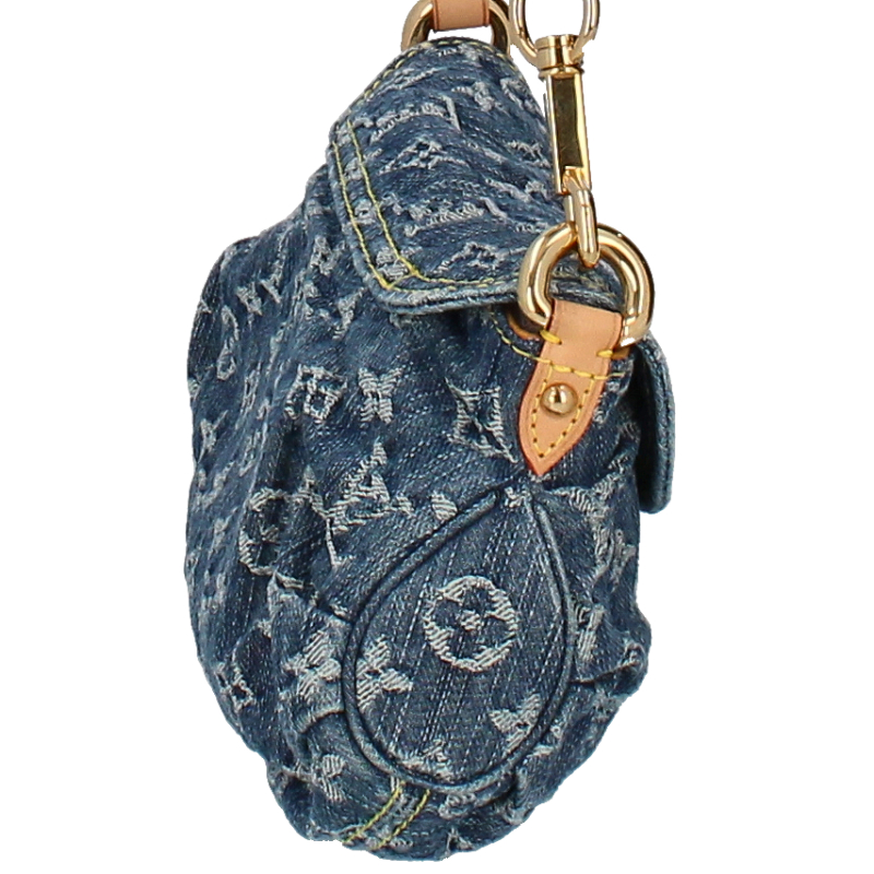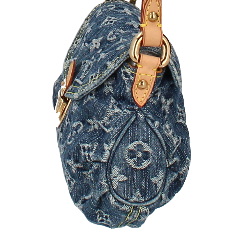 USED品。廃番品。近年流行のデニム地にモノグラム柄が織り込まれたデザインとなっています。コンパクトサイズでちょっとしたお出かけに最適です。