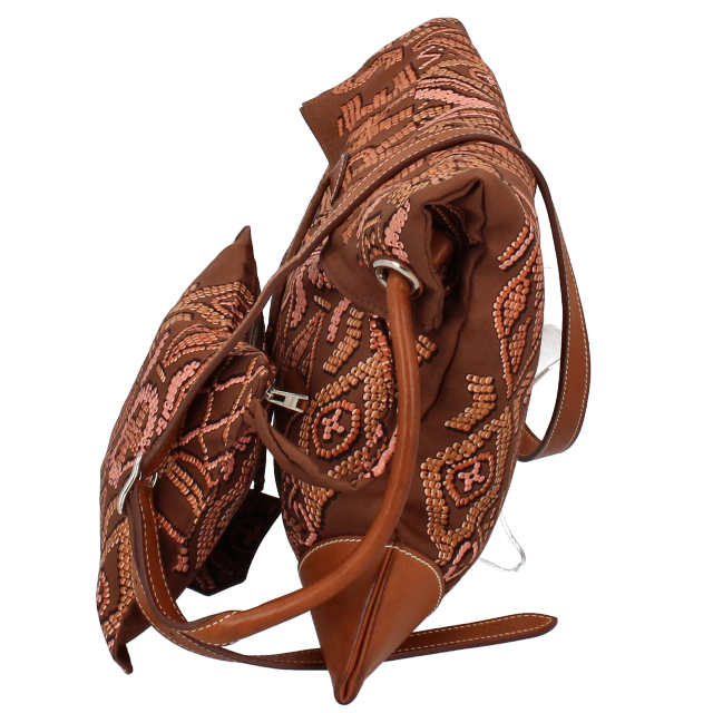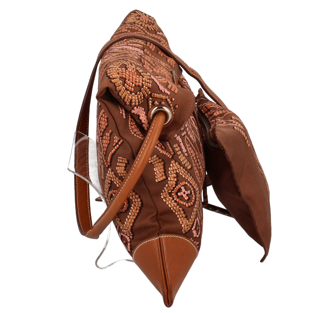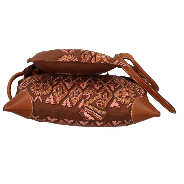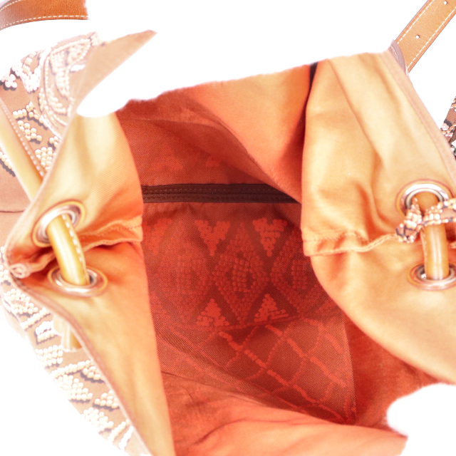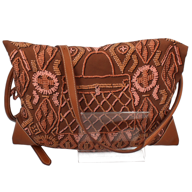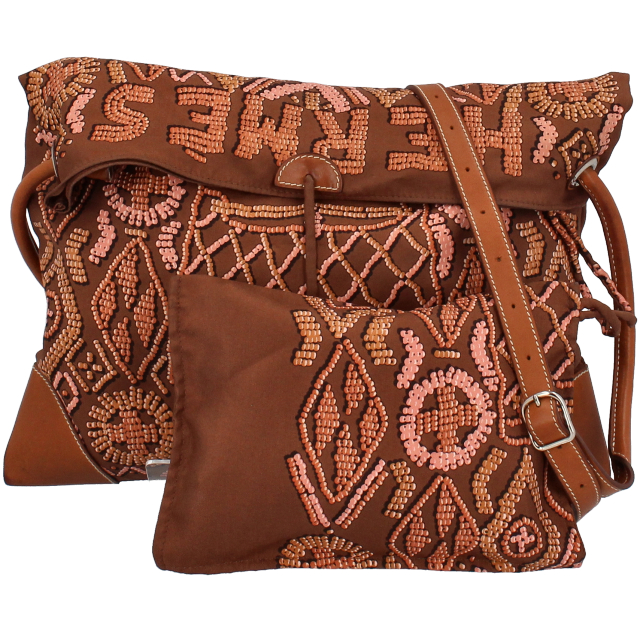 USED品。□P刻印(2012年製)。素材にエルメスのスカーフと同様のシルクが用いられている、高級感、肌触り共に抜群のショルダーバッグです。