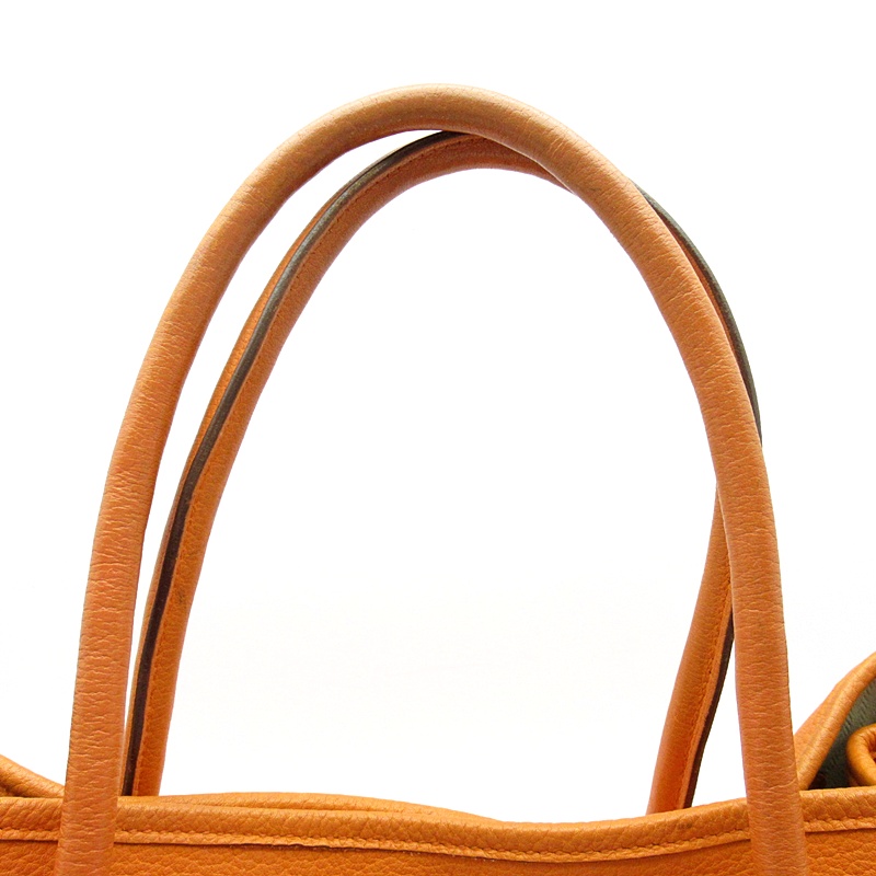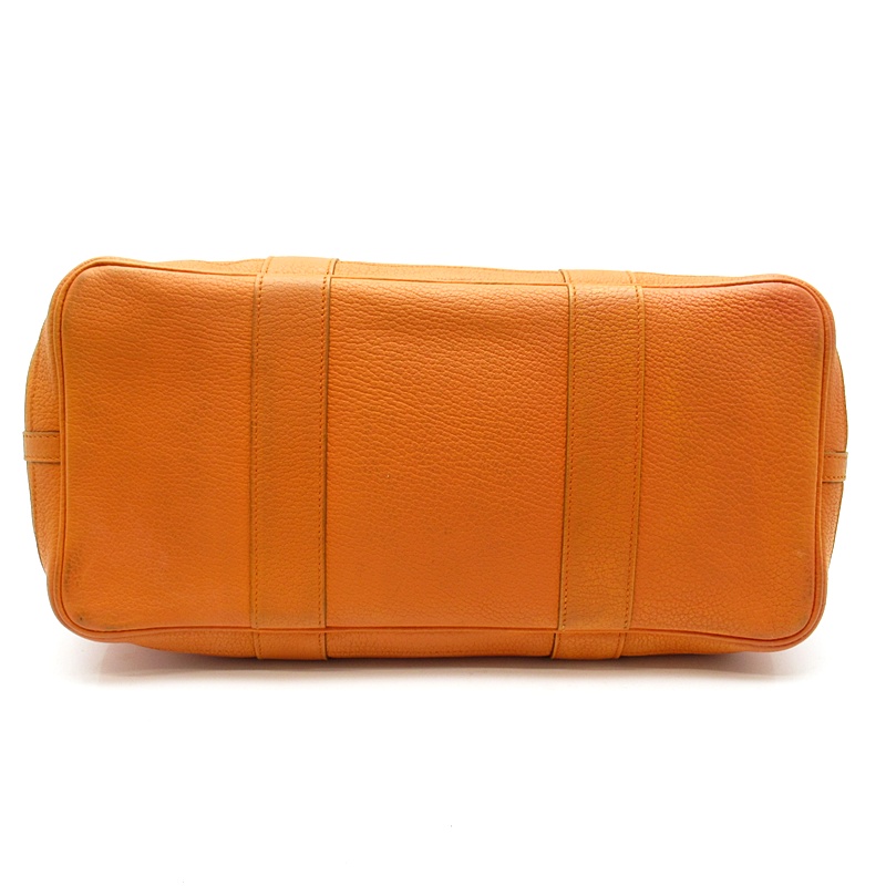 多少使用感有。□M刻印(2009年製)。角擦れと黒ずみがあります。ハンドルに黒ずみがあります。表面や底面レザーにも黒ずみがあります。内部底面に汚れがあります。