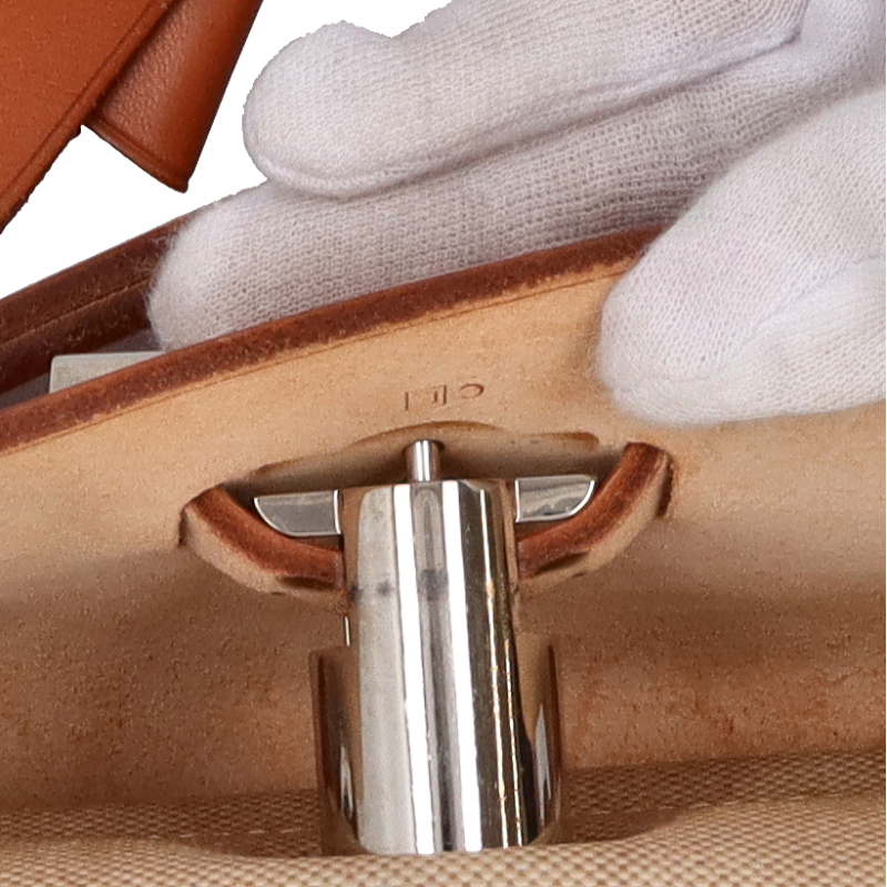 多少使用感有。□E刻印(2001年製)。レザー部分に色焼け、擦り傷、シミがあります。キャンバス部分に擦れ、シミ、黒ずみがあります。金具に小傷があります。※ストッパー欠品