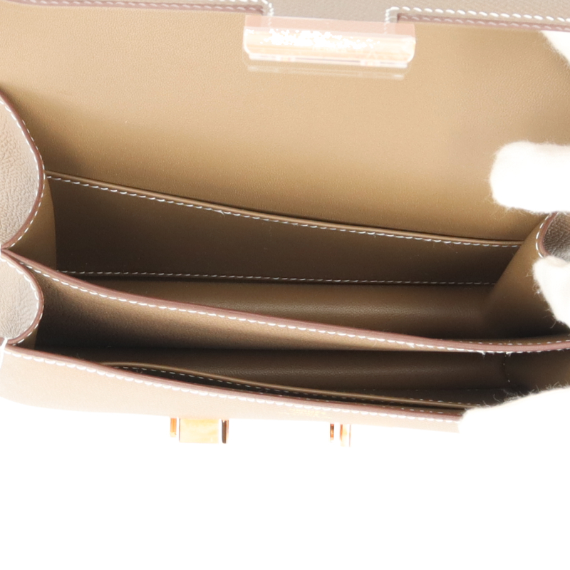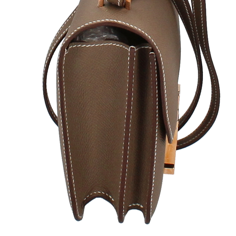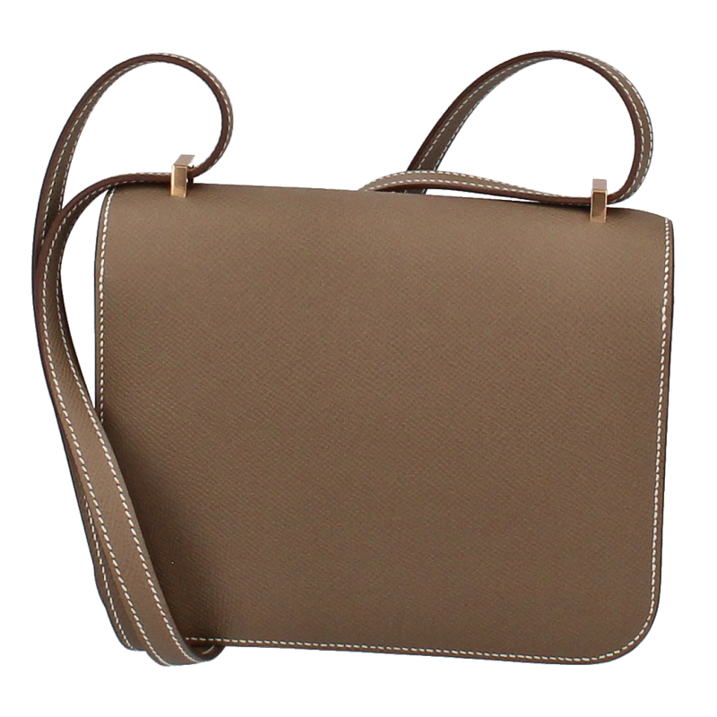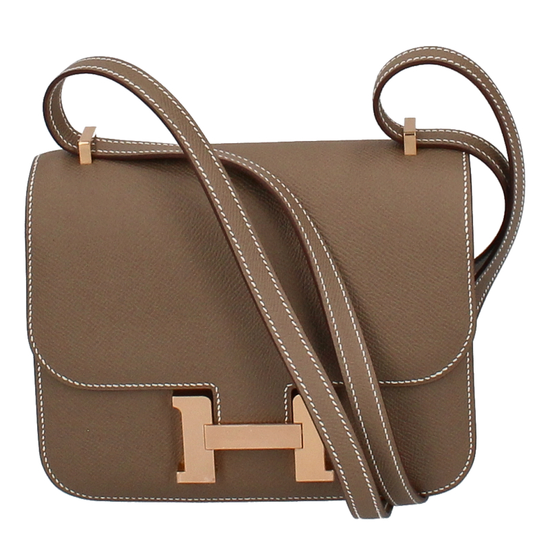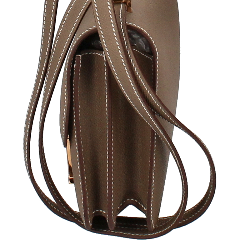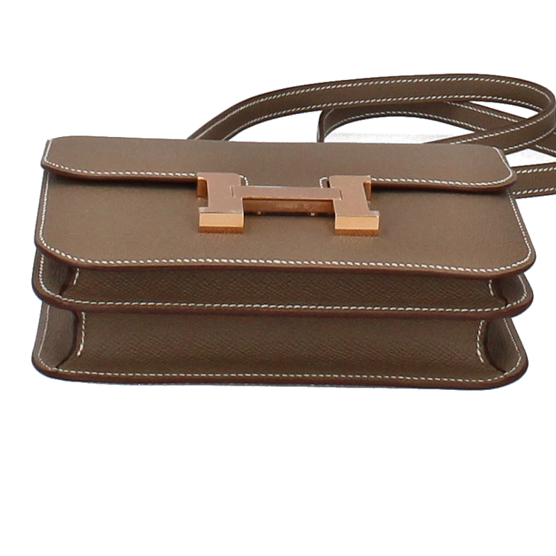 未使用品。ピンクゴールド金具。U刻印(2022年製)。フロントのHのバックルが印象的なコンスタンスミニサイズ。美しいフォルムをいつまでも存分に味わえるエプソンは、硬い質感が魅力の非常に人気の高いレザー。しっかりとしたカーフの感触を楽しめるエルメスならではの上質で繊細な凹凸のある仕上がりなので、デイリーにお使いいただいてもキズや汚れが気になりにくい素材です。
