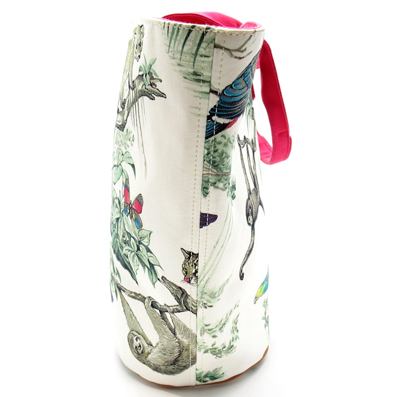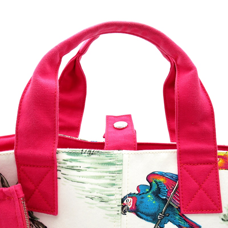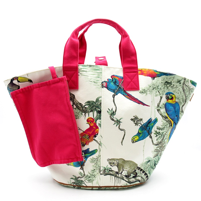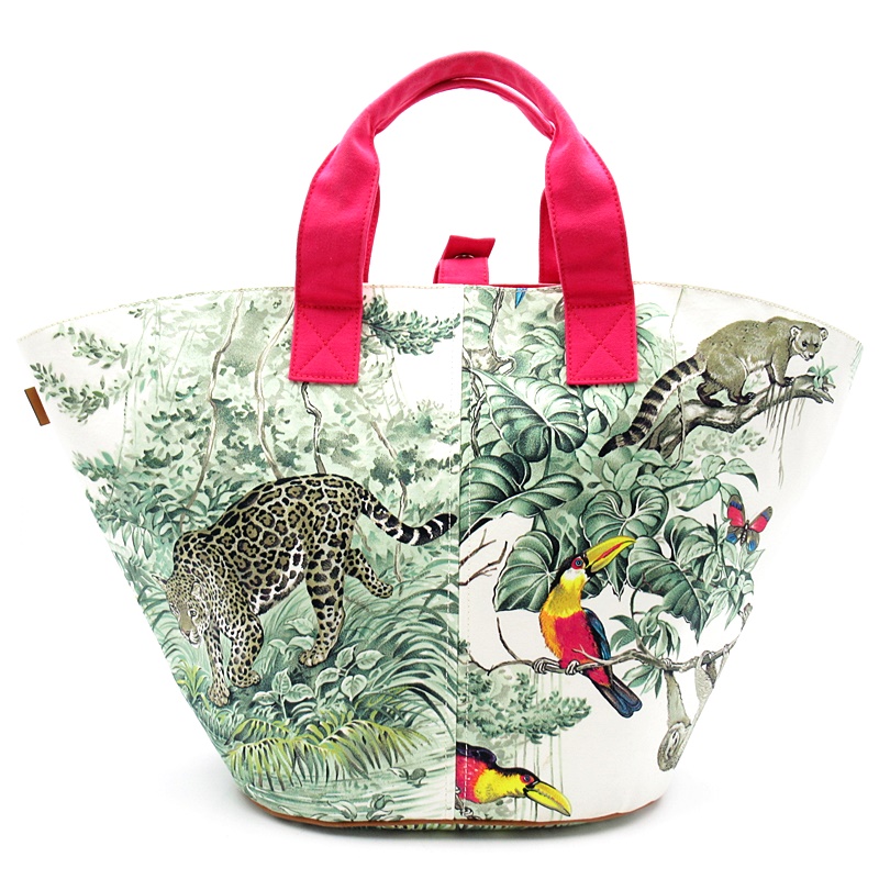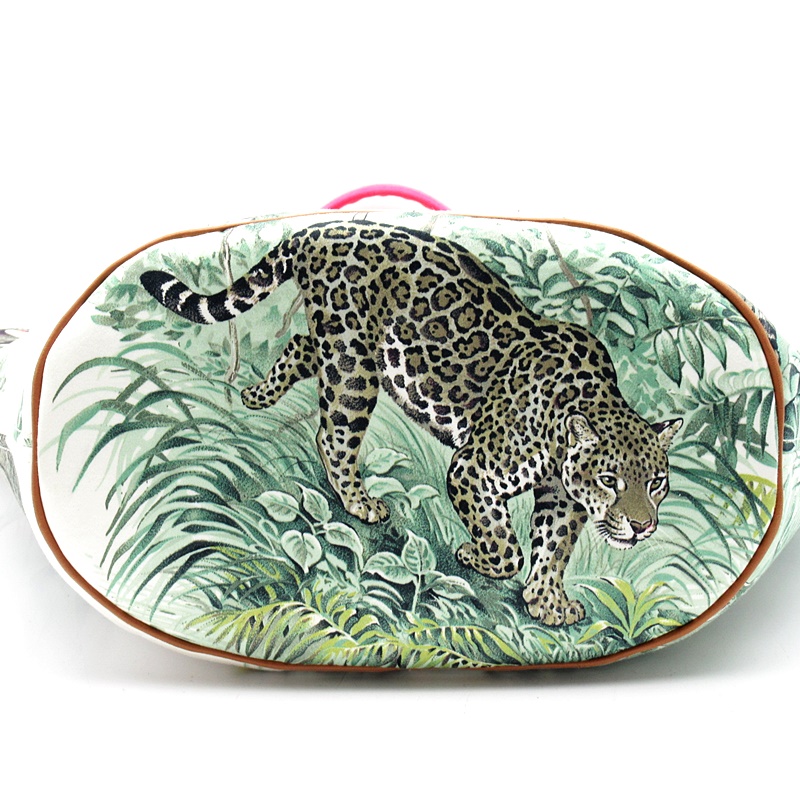 USED品。シルバー金具。熱帯の動物たちが描かれた美しいテキスタイル。軽量で持ち運びしやすく、内容量も大きいのでお荷物が多い方でも安心です。