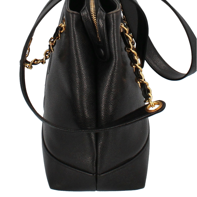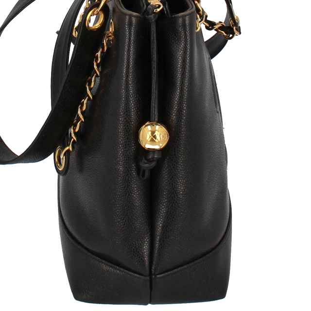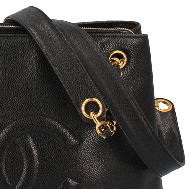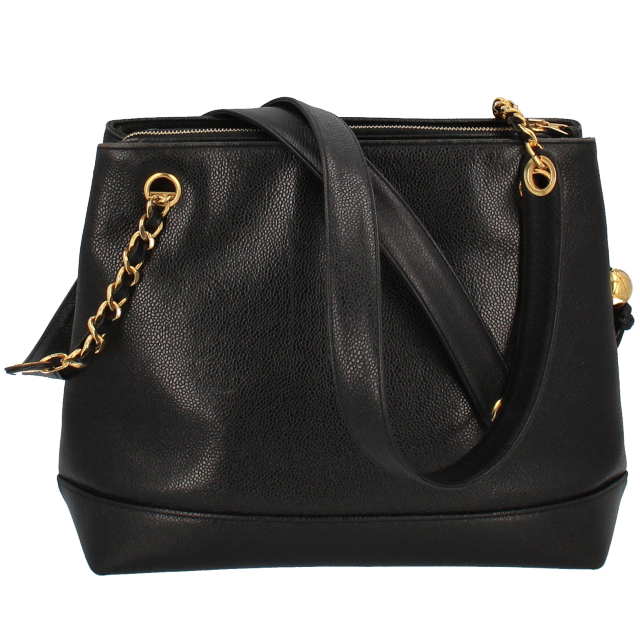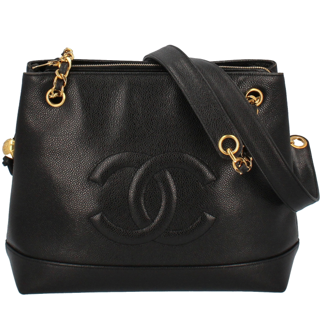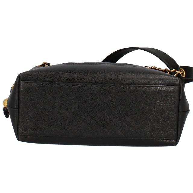 USED品。ゴールド金具。収納箇所も多く、比較的軽くてソフトなキャビアスキンを使ったバッグとなります。ゴールド金具が高級感を演出してくれます。大きなココマークがとってもキュートなデザインです。
