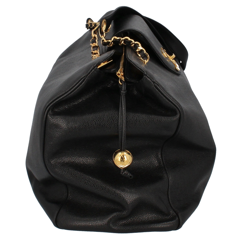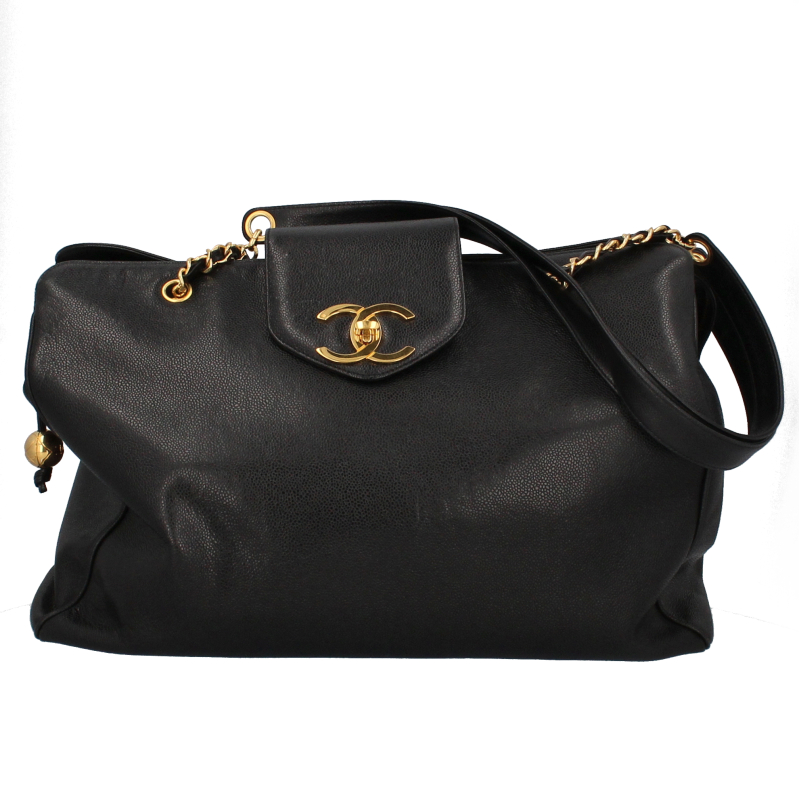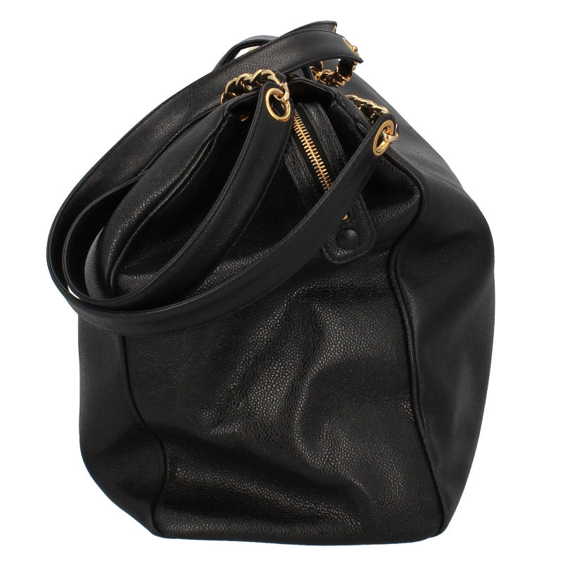 USED品。高級感溢れるゴールド金具とキャビアスキンのチェーンショルダーバッグです。収納性があり、仕分けも3口あり、間口も広く荷物の出し入れも楽々です。大容量で機能的なバッグです。