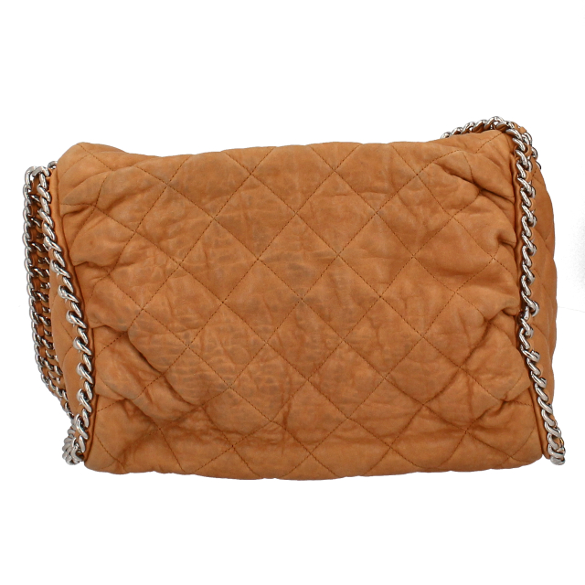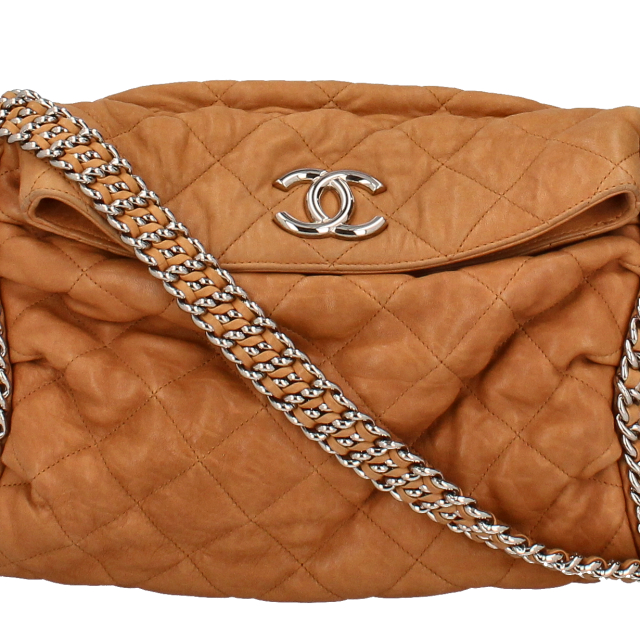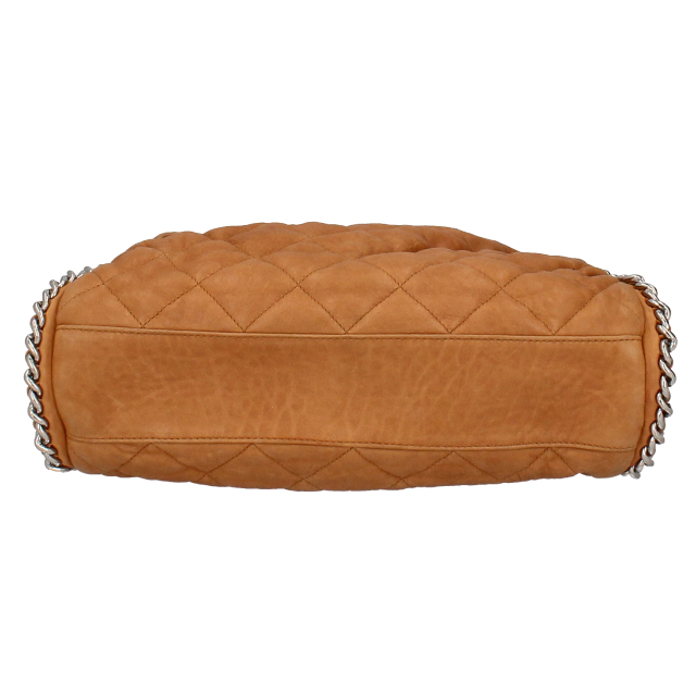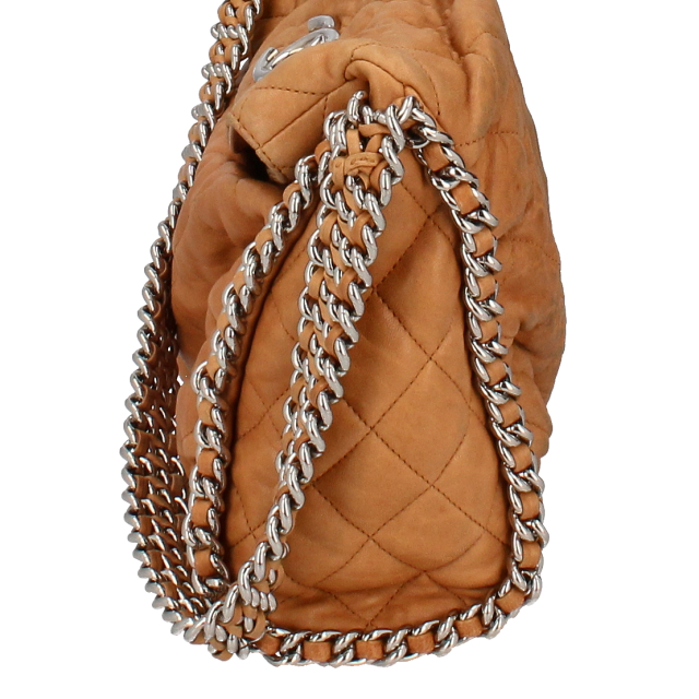 USED品。2011年シーズンのマトラッセステッチが施されたグレーレザーにシルバーチェーンがトリムされた、シャネルらしいラグジュアリーなチェーンバッグ。柔らかなラムスキンとチェーンの相性が抜群。収納力もデザイン性も兼ね備えたバッグです。