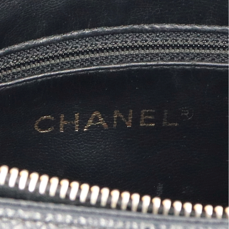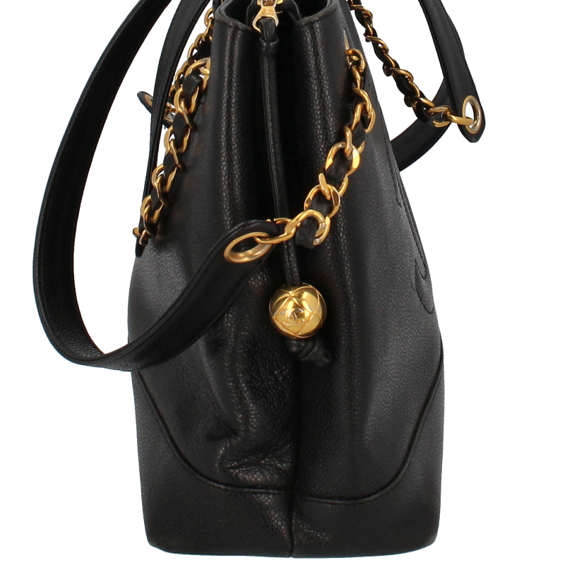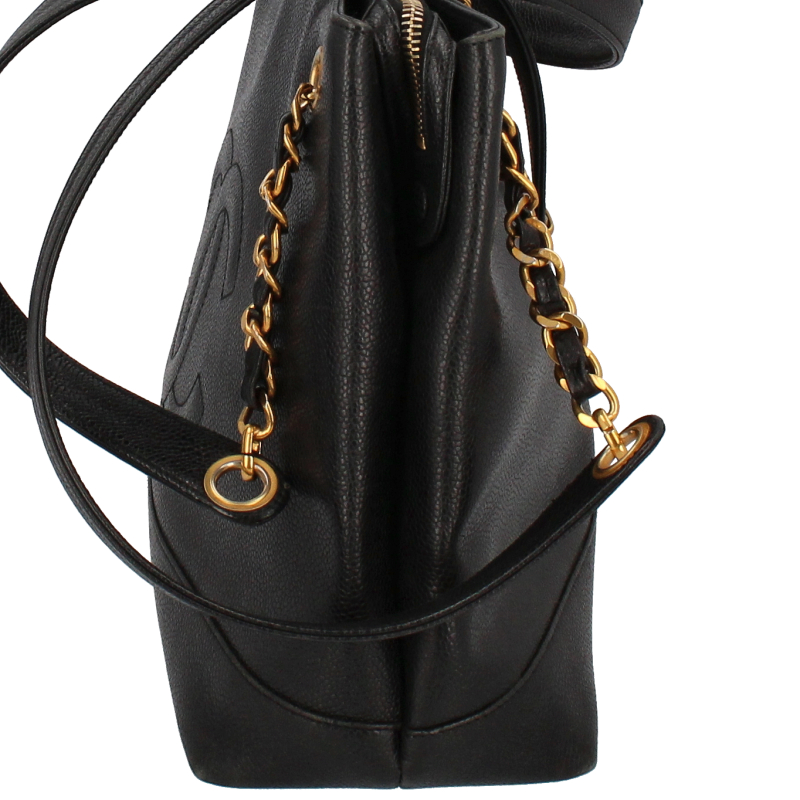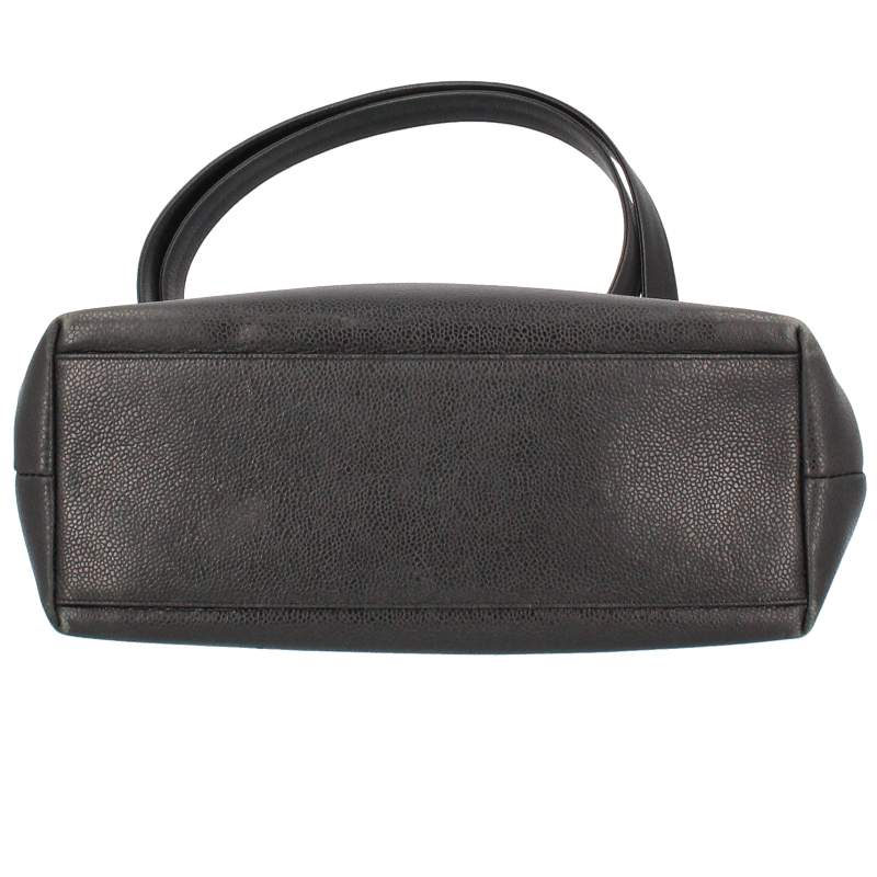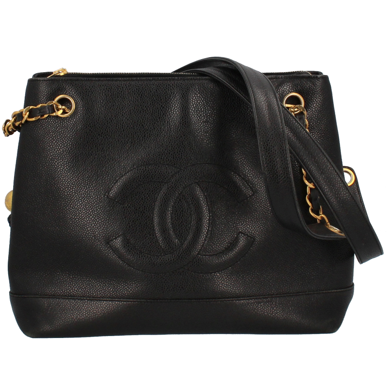 USED品。ゴールド金具。収納箇所も多く、比較的軽くてソフトなキャビアスキンを使ったバッグとなります。ゴールド金具が高級感を演出してくれます。大きなココマークがとってもキュートなデザインです。