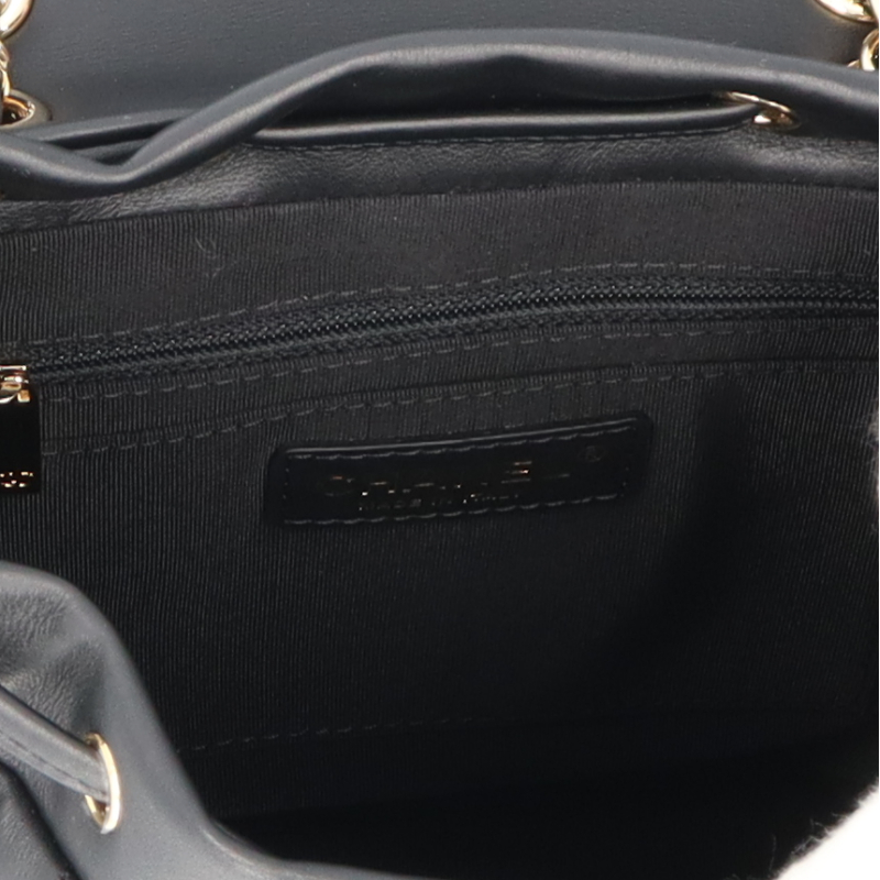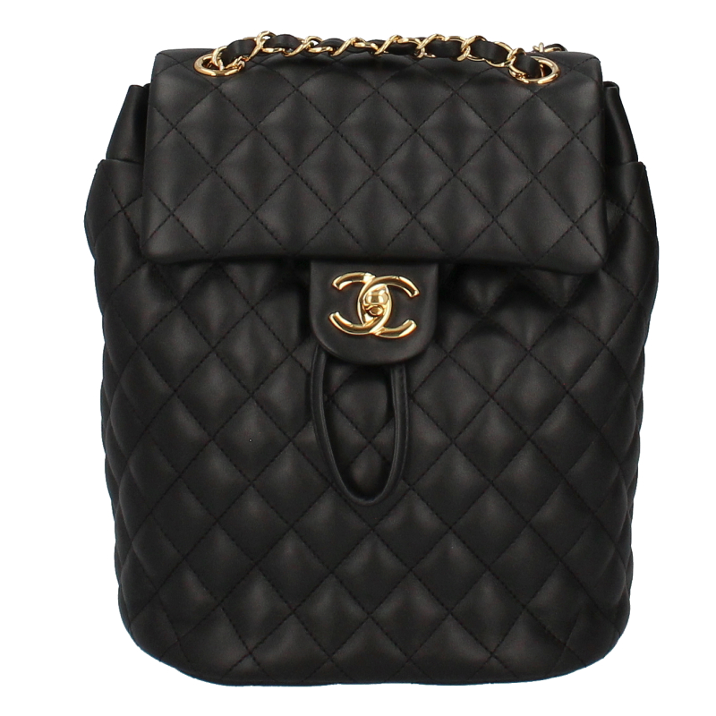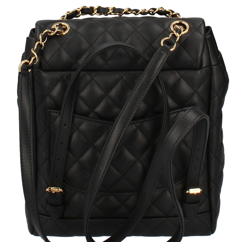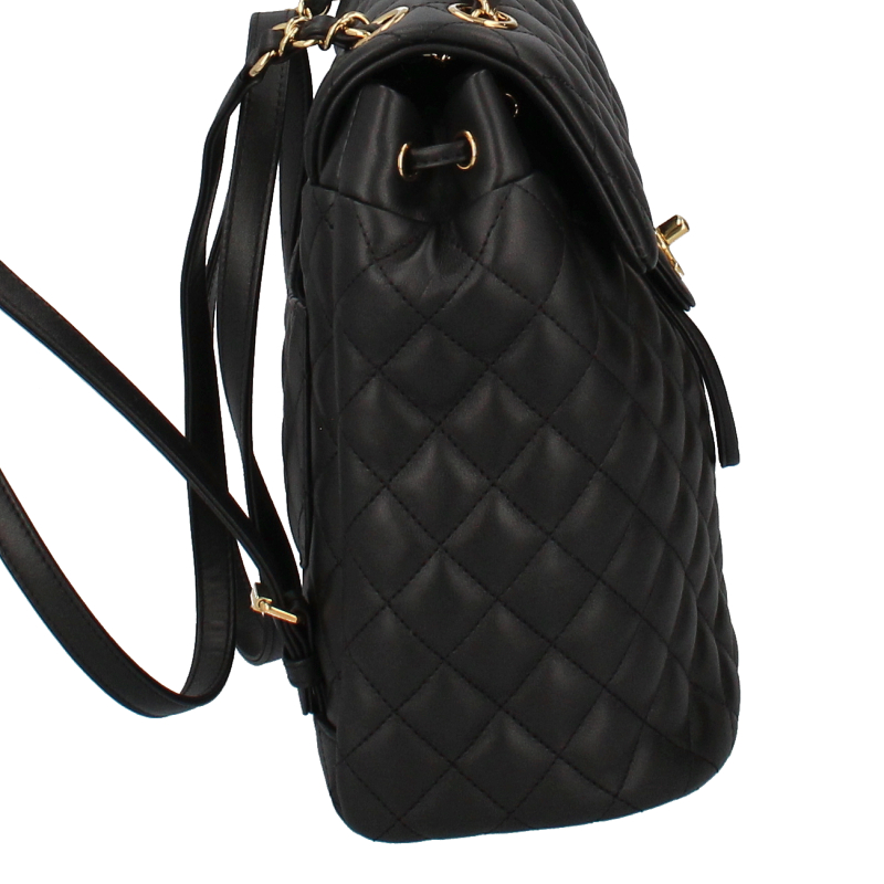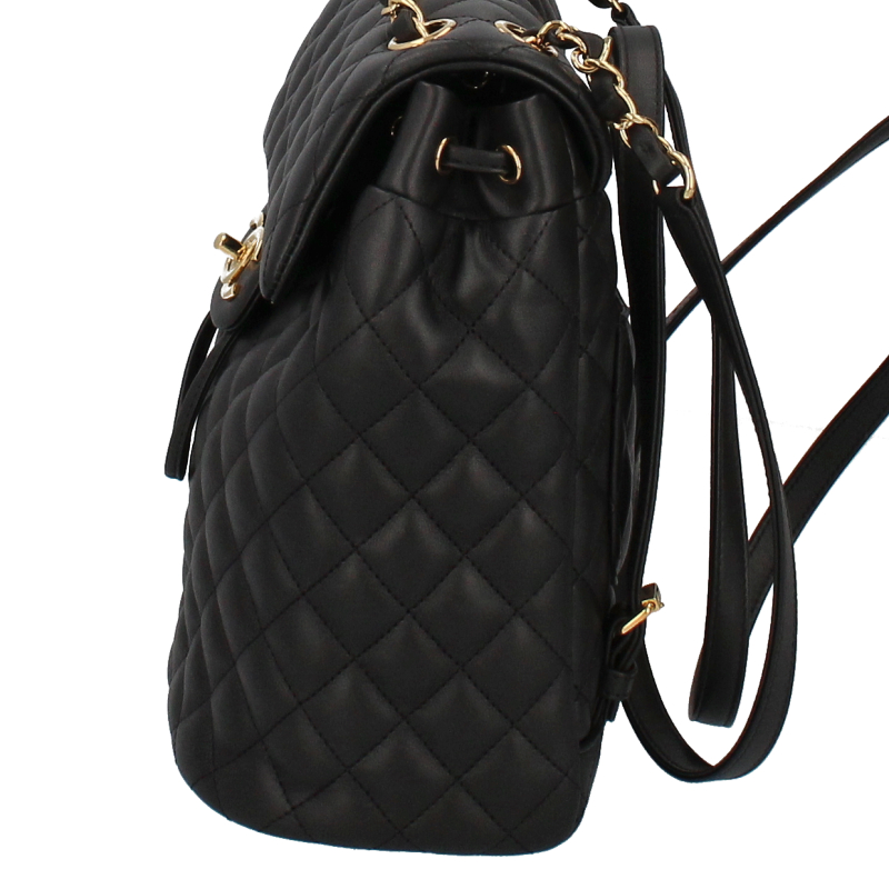 USED品。ゴールド金具。マトラッセが上品で高級感漂うチェーンバックパック。カジュアルになりすぎずファッショナブルな印象を与えるバッグです。