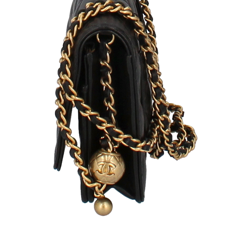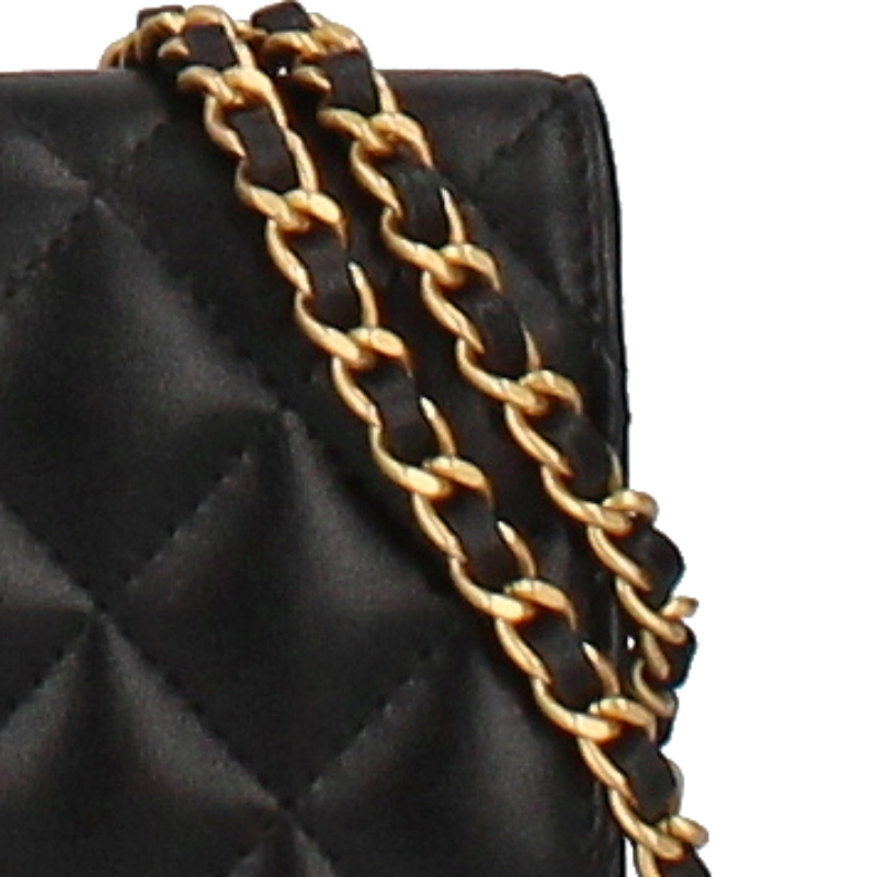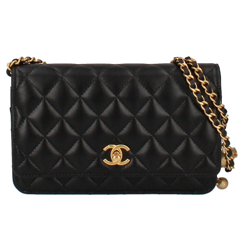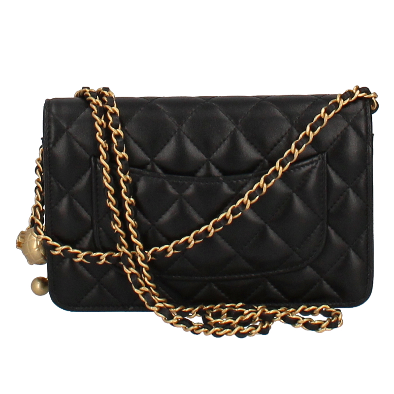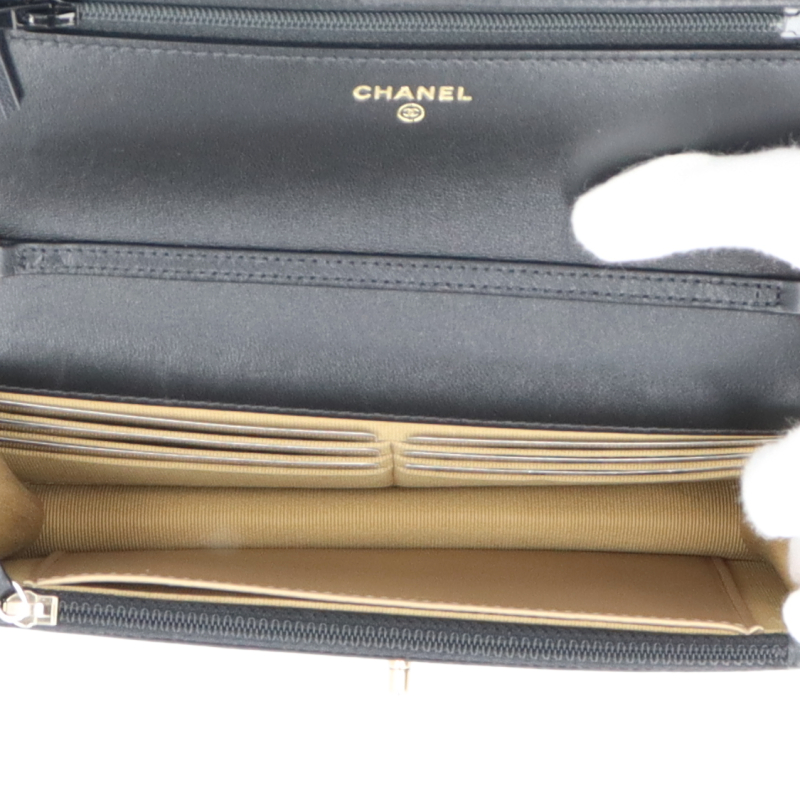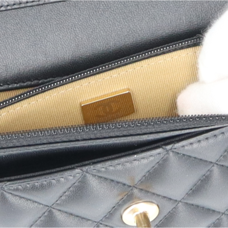 USED品。ゴールド金具。カードポケット・ファスナー小銭入れが内部にある、チェーンショルダー付きのお財布です。斜め掛けにしたり、ショルダーにも出来ます。