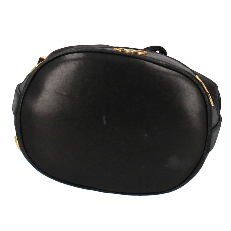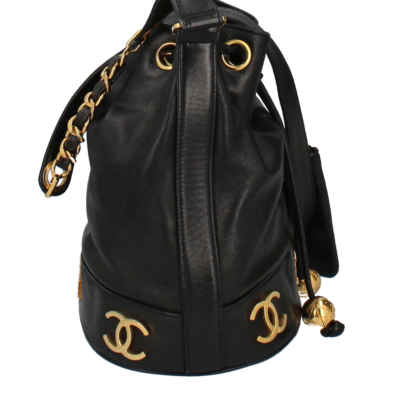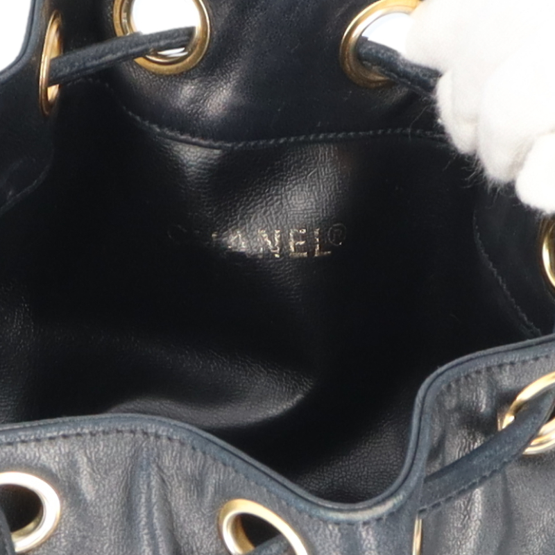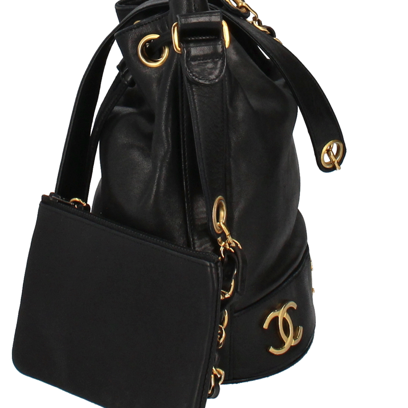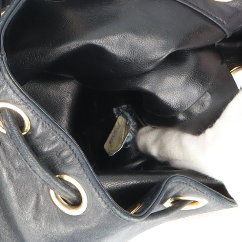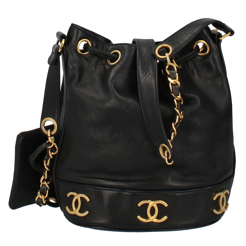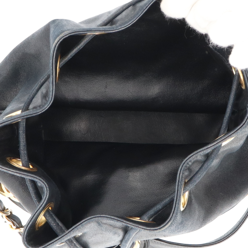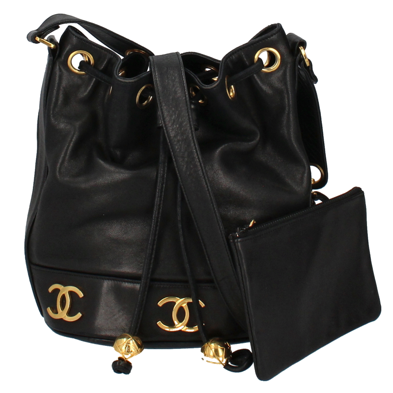 USED品。前後下部に三つのココマークをあしらったバッグです。巾着型ですので、たっぷりと荷物が収納できます。ポーチ付きで利便性も非常に高いです。