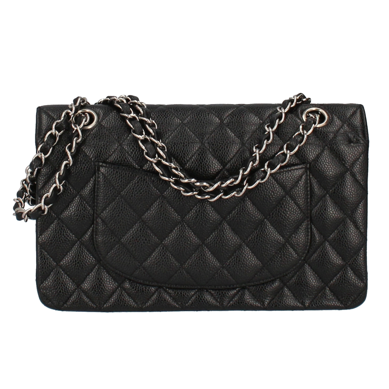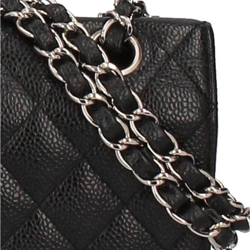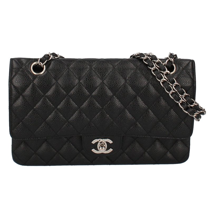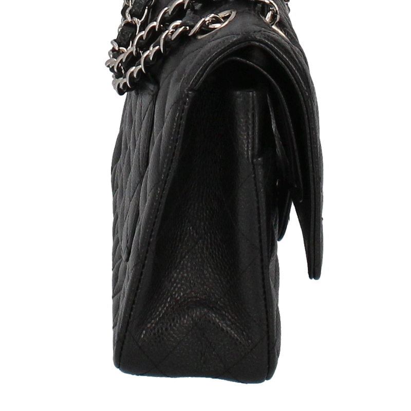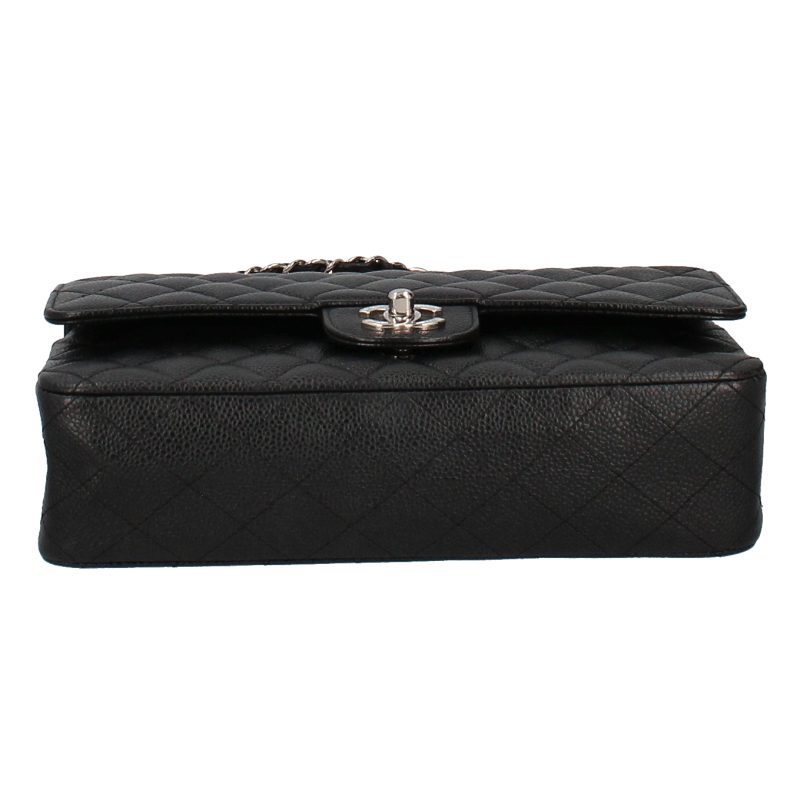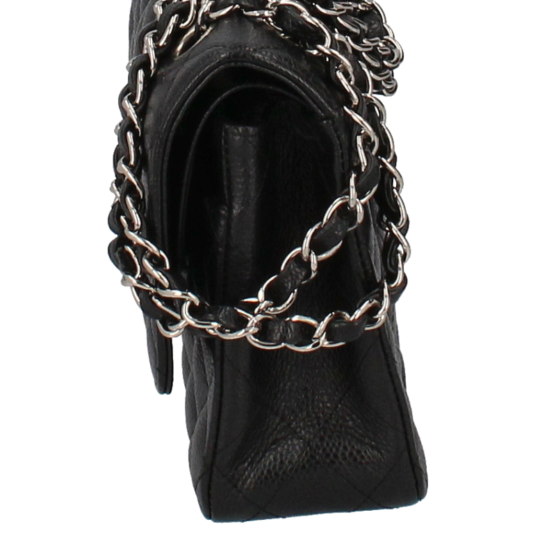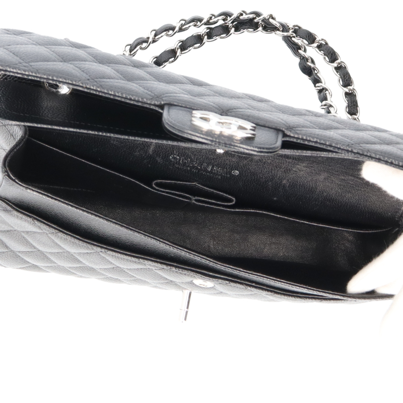 USED品。シルバー金具。大人気の定番アイテム「マトラッセ」。丈夫なキャビアスキン素材にシックなブラックカラー、シルバー金具を合わせたシャネル極上の逸品です。