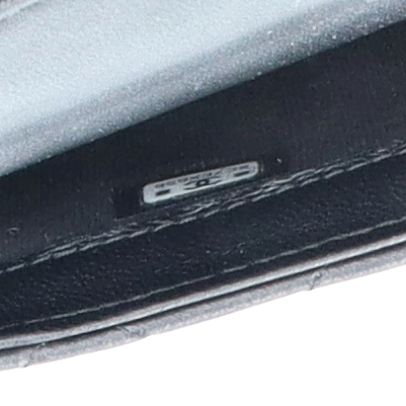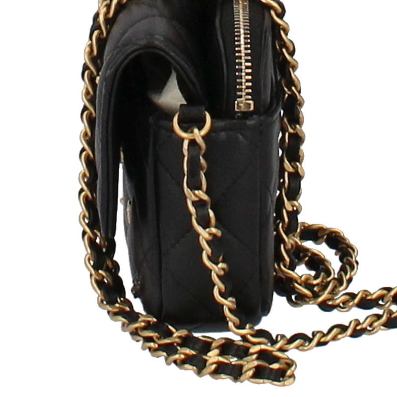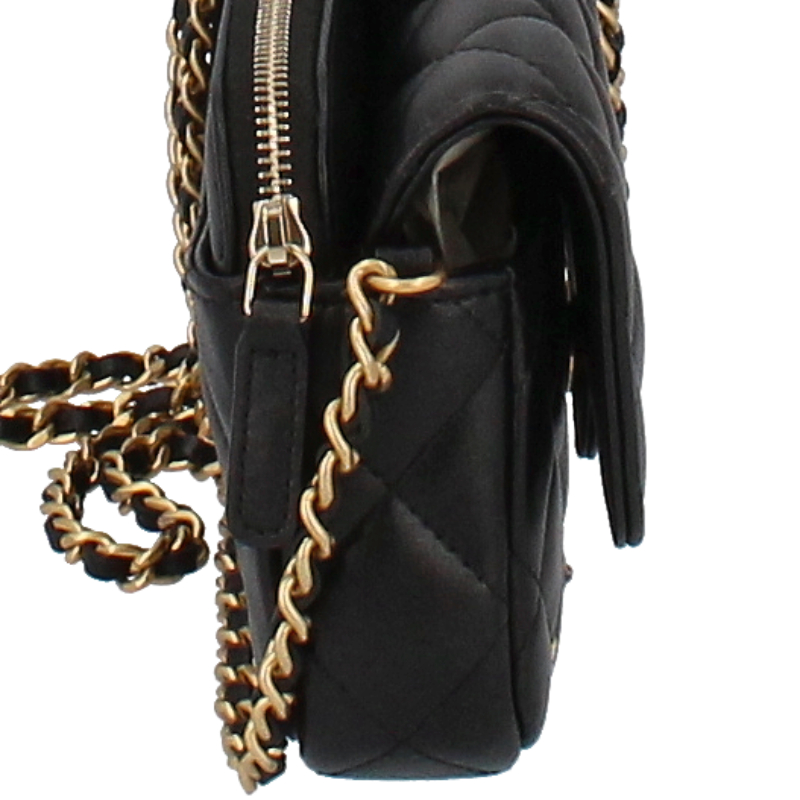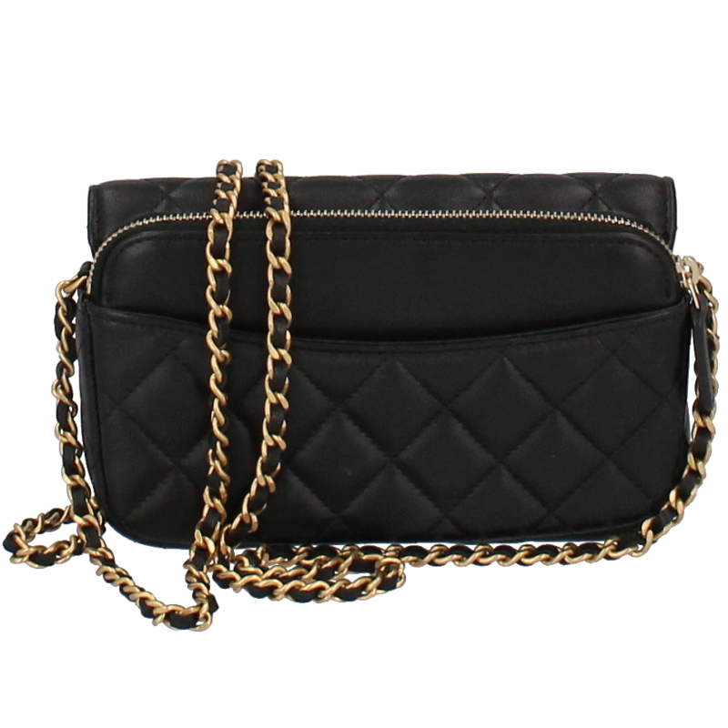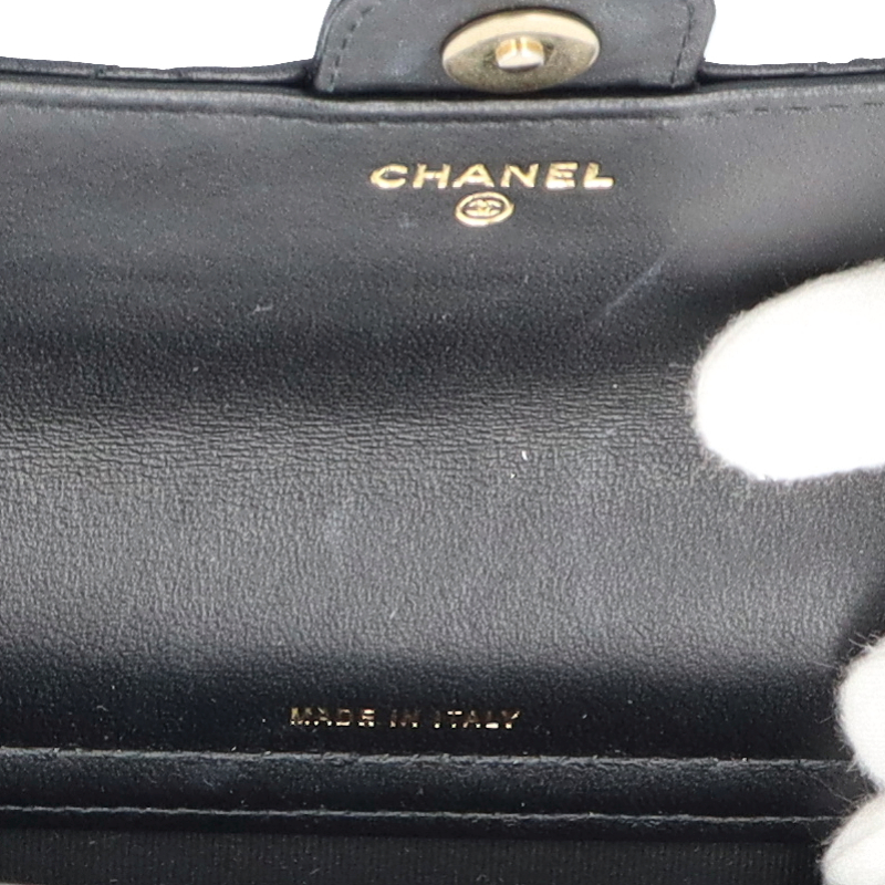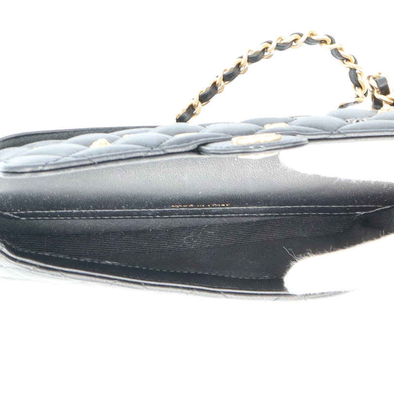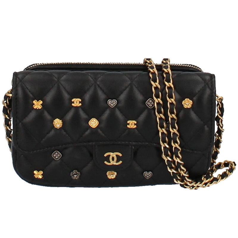 USED品。ゴールド金具。チェーンウォレットとしても活用できるフォンケース。柔らかいラムスキン素材にシックなブラックカラー、様々なデザインのスタッズを合わせたシャネル極上の逸品です。