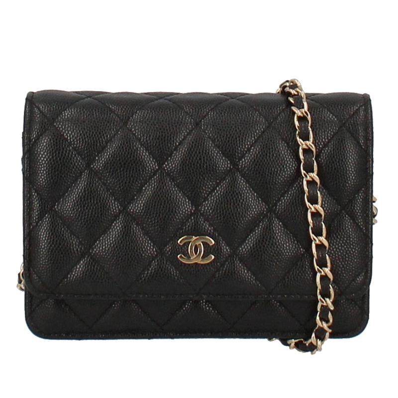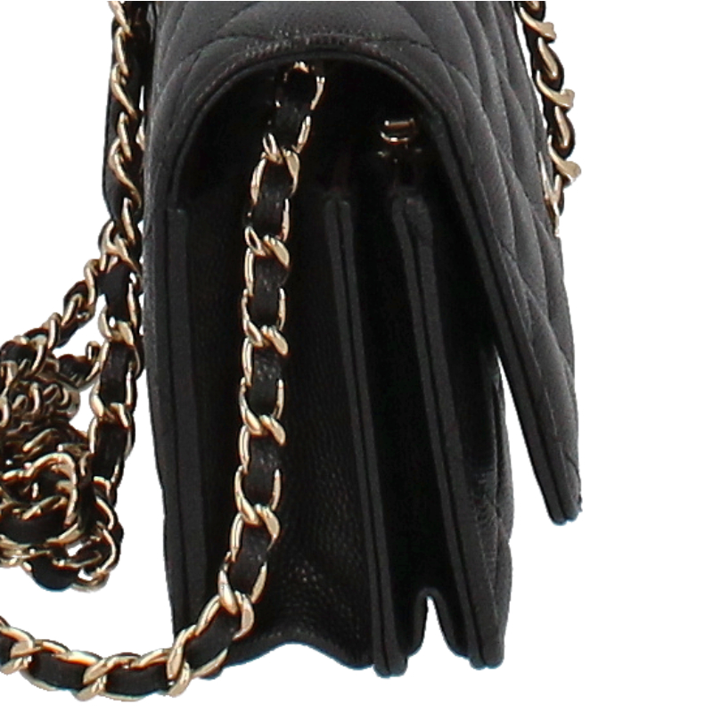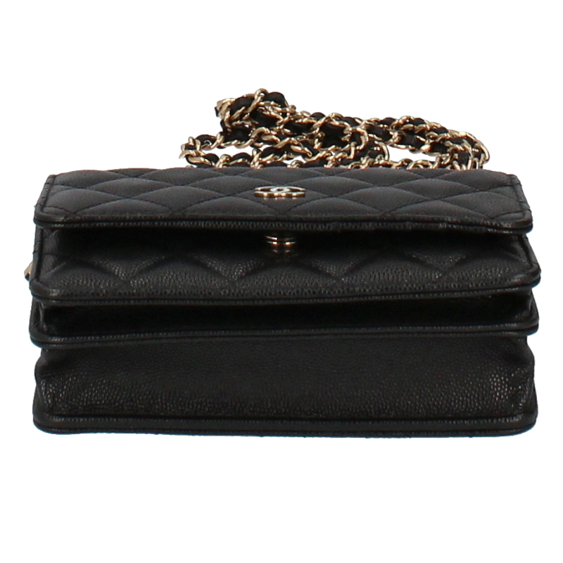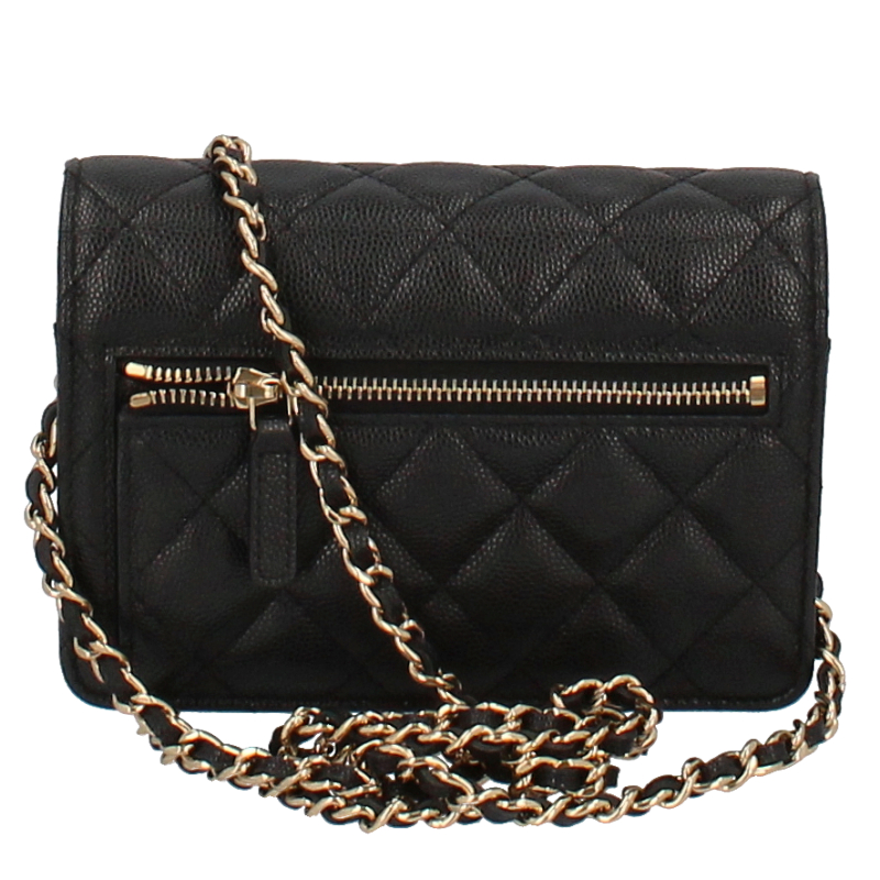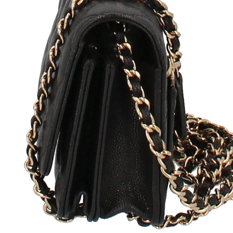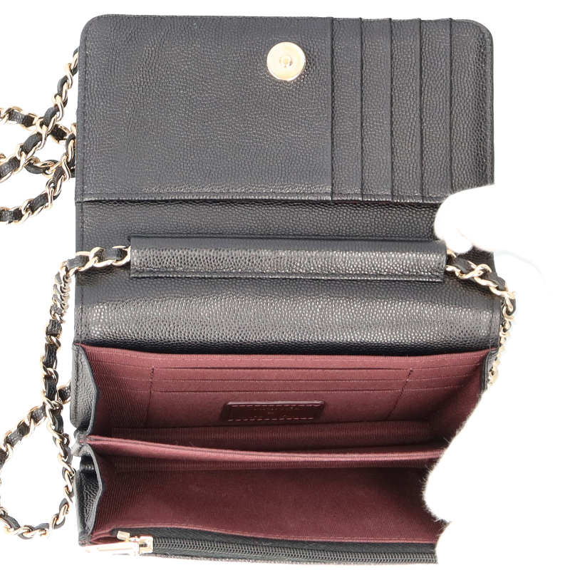 USED品。ゴールド金具。カードポケット・ファスナー小銭入れが内部にある、チェーンショルダー付きのお財布です。斜め掛けにしたり、ショルダーにも出来ます。