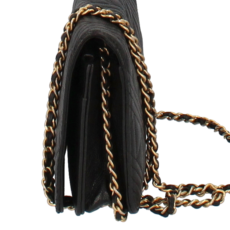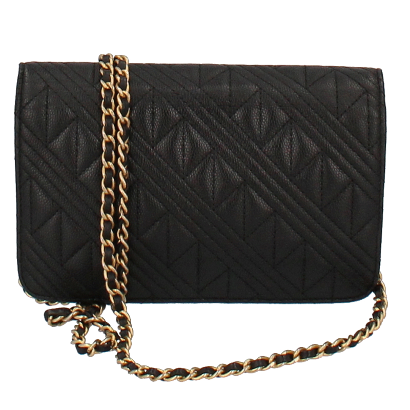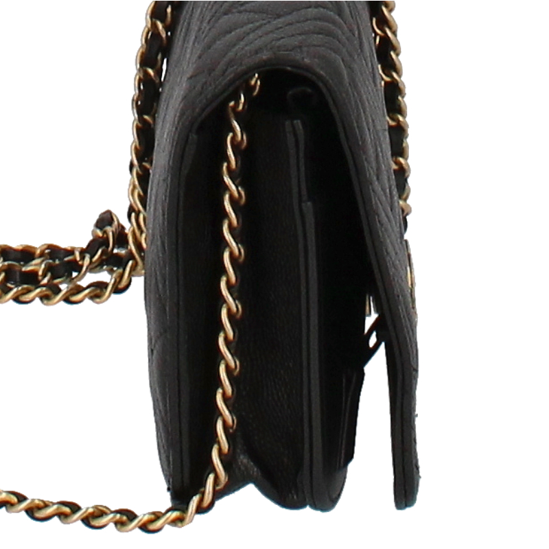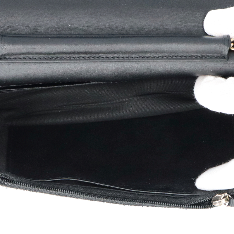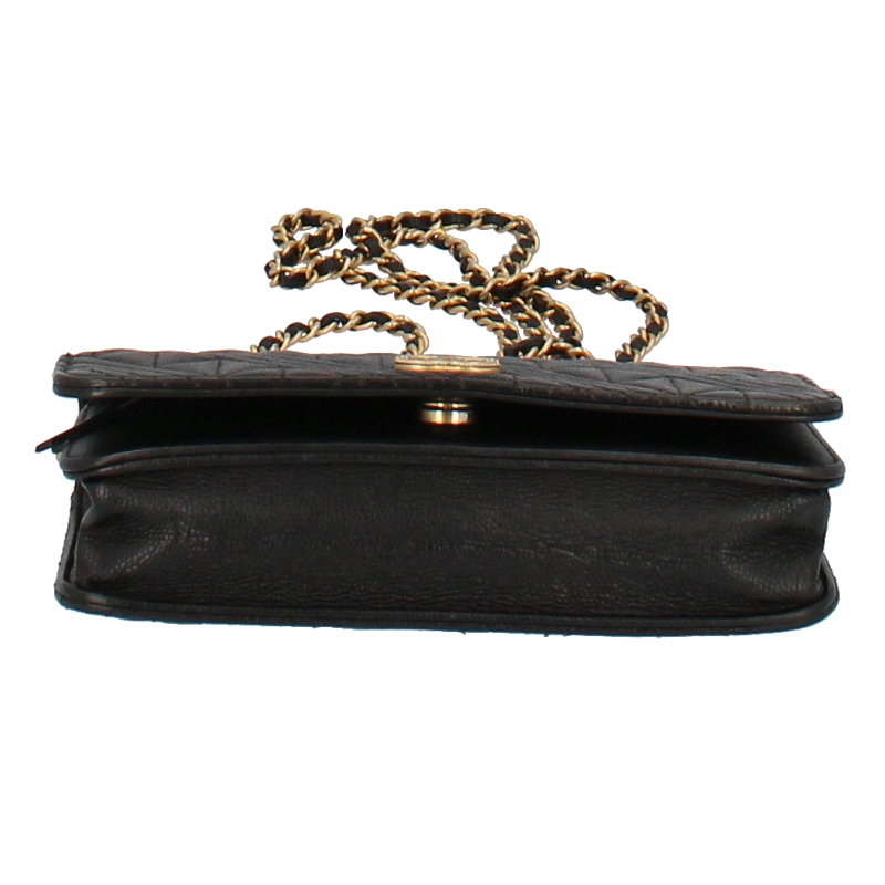 USED品。ゴールド金具。カードポケット・ファスナー小銭入れが内部にある、チェーンショルダー付きのお財布です。斜め掛けにしたり、ショルダーにも出来ます。