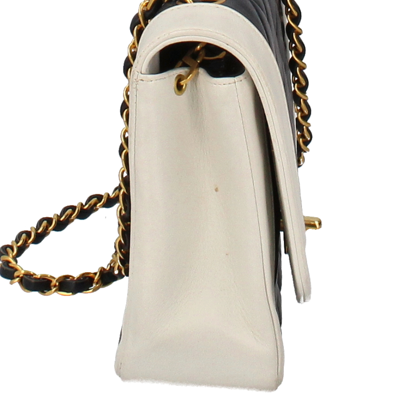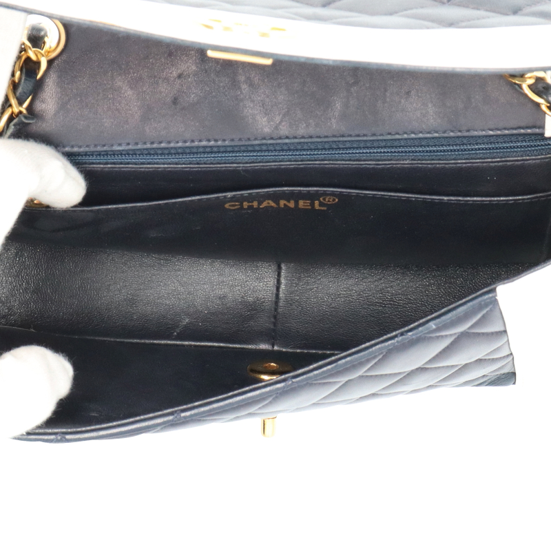 多少使用感有。ゴールド金具。表面や底部に擦れや色褪せ、汚れがあります。フラップ内側に傷、シワがあります。角スレがあります。シール有(2番台)。1993年6月購入のブティックシール有。