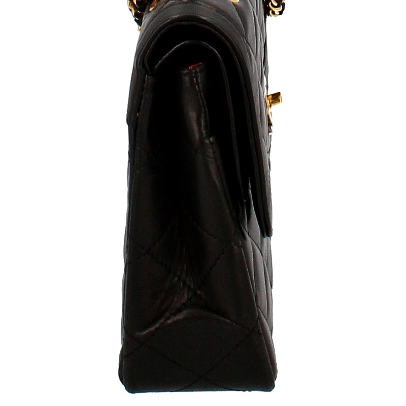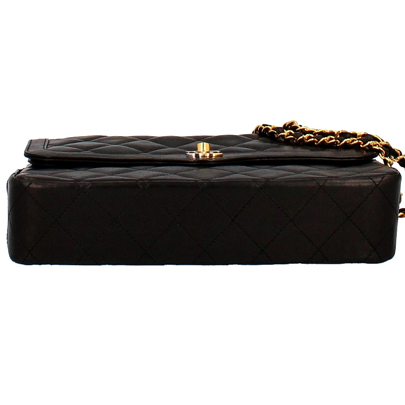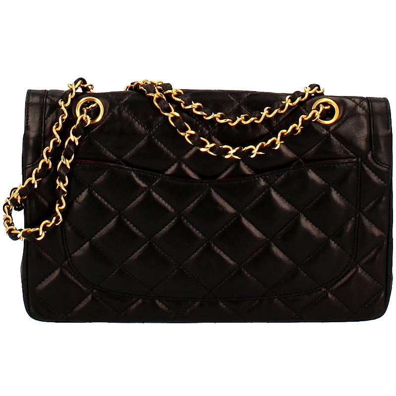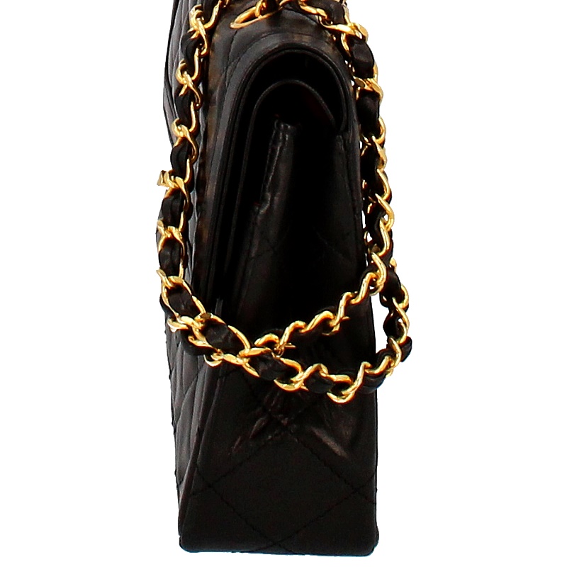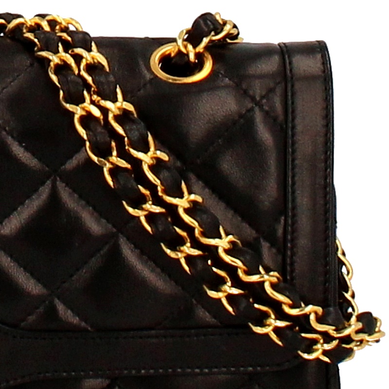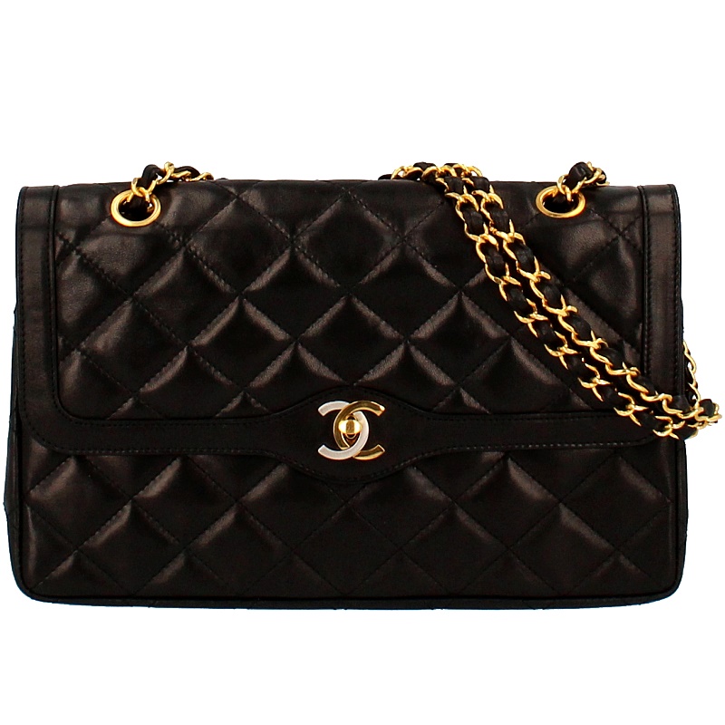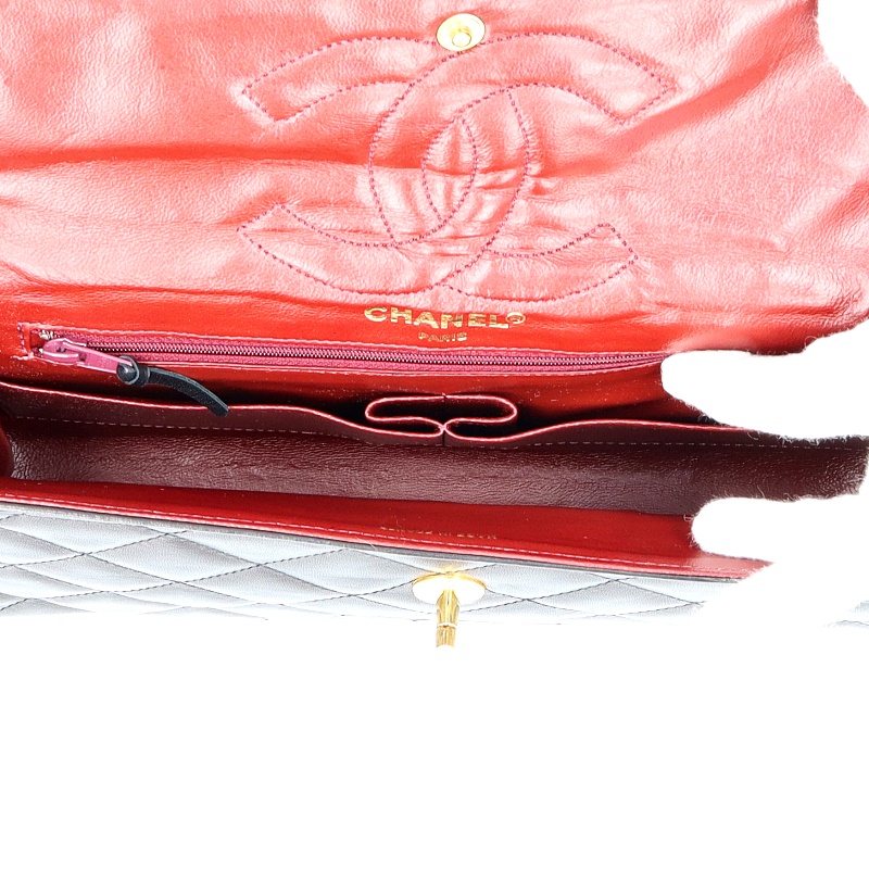 USED品。ゴールド/シルバー金具。パリ本店限定のレア商品です。限定ならではのゴールドとシルバーのコンビカラーのココマークがとってもオシャレなうえ、ラムスキンは手触りも良く高級感があります。人気の高いWチェーン・Wフラップタイプです。