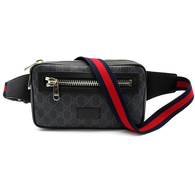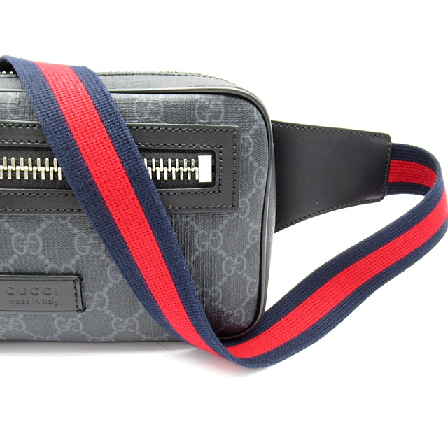 USED品。驚くほどしなやかなソフト GGスプリームのスモールポーチ。調節可能なウェストストラップにはブルー/レッド/ブルーのグッチを象徴するウェブ ストライプがあしらわれています。