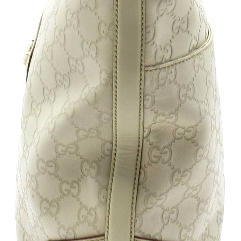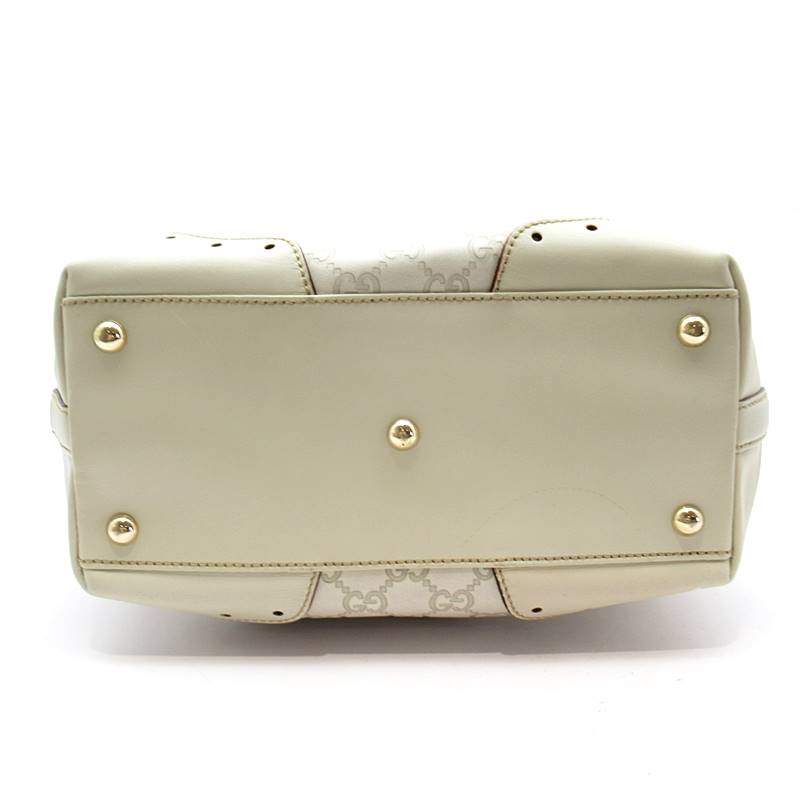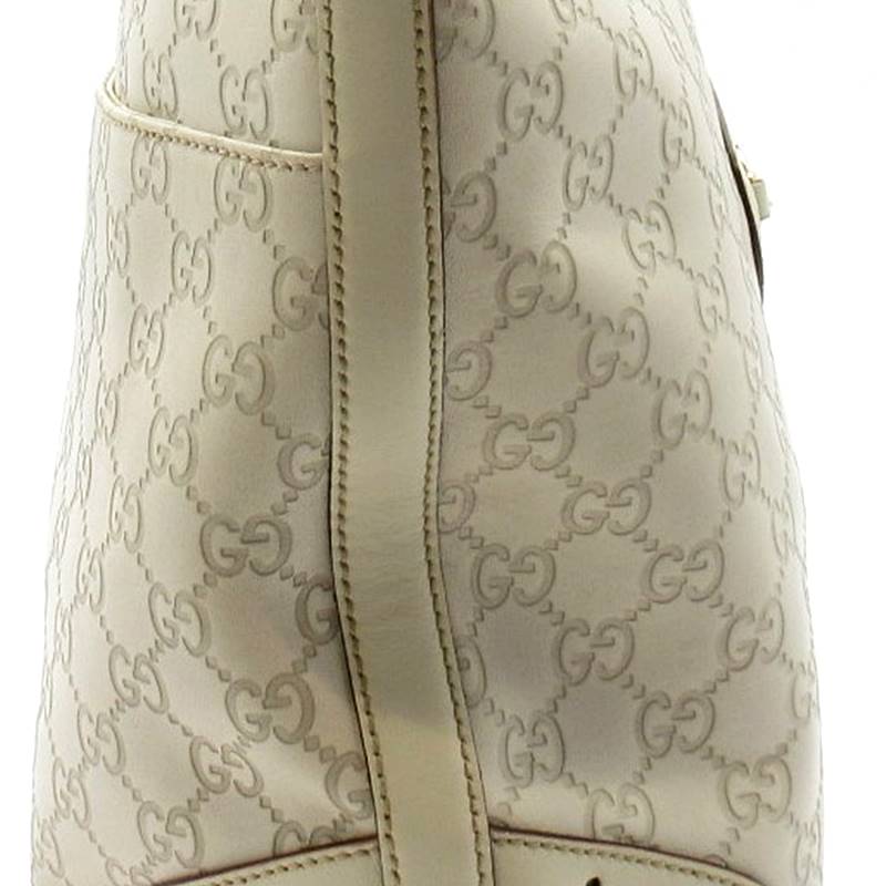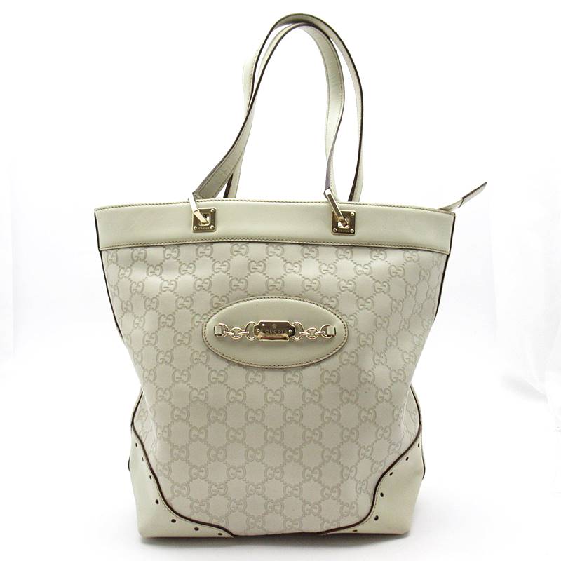 USED品。センター位置にあるグッチのロゴ入りプレートが上品さを感じさせるこちらの商品。グッチシマ素材の手触りも最高です。