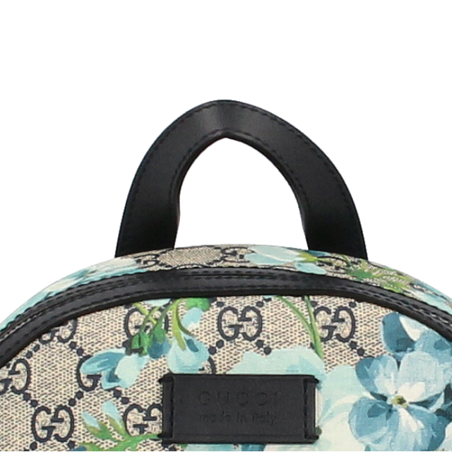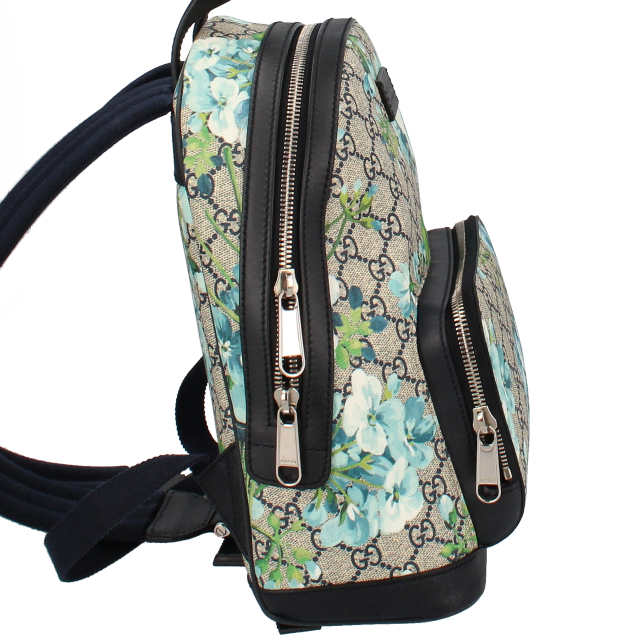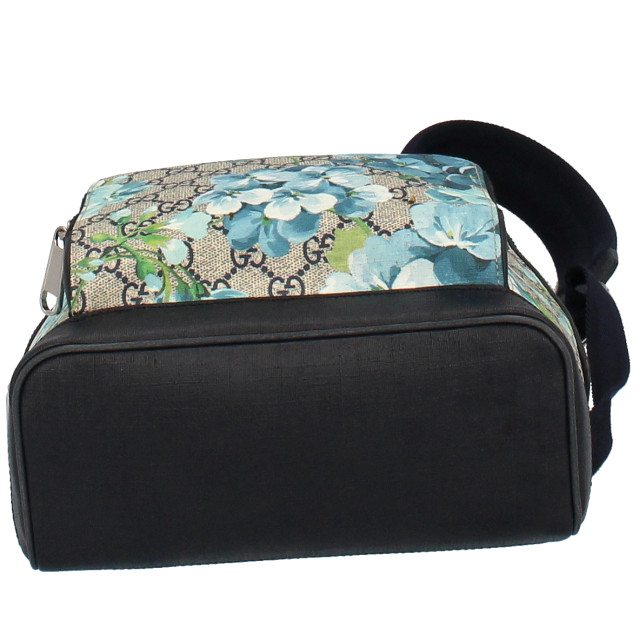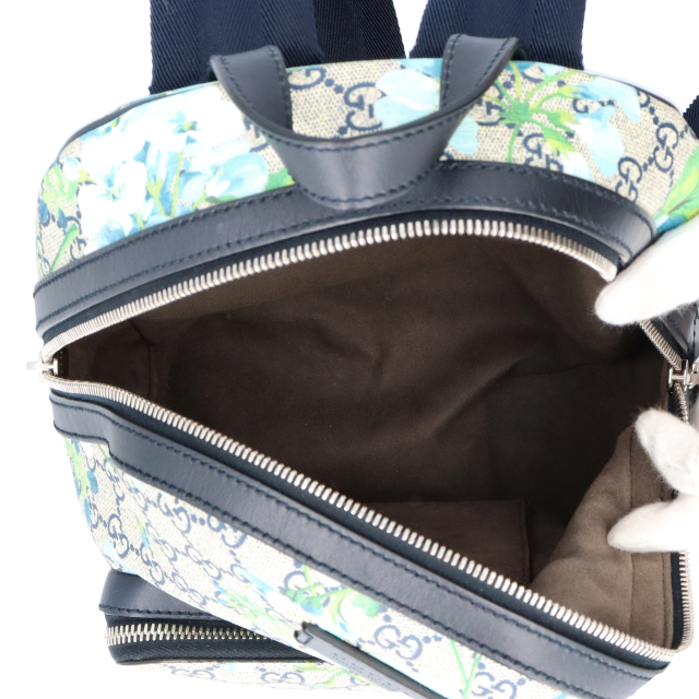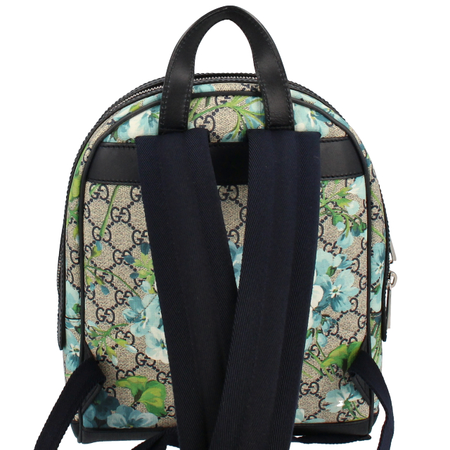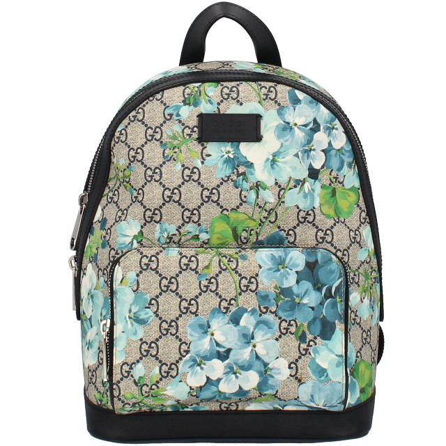 USED品。丈夫で軽いGG柄のコーティングキャンバスに青いフラワーペイントが施された人気のアイテム。程よいサイズで、お出かけや旅行などで大活躍してくれること間違いなしです。