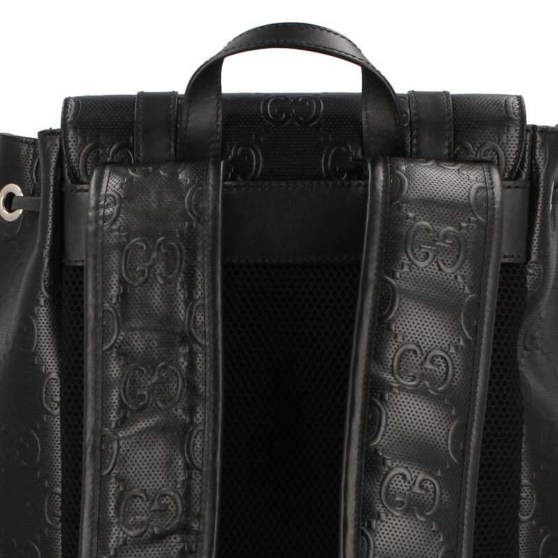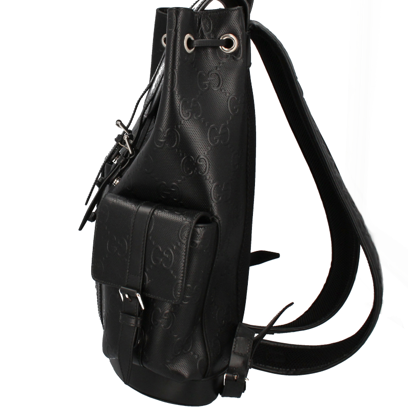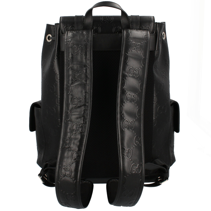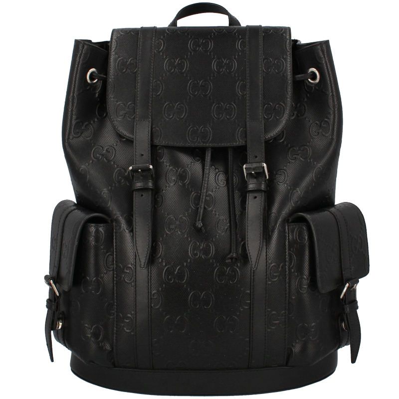 USED品。GGエンボス レザーを使用し、大きいサイズでたっぷりと荷物が収納できるグッチ・バックパック。ポケットは内外に配しており、携帯や定期などが取り出しやすく配慮され使い勝手のいいバッグです。