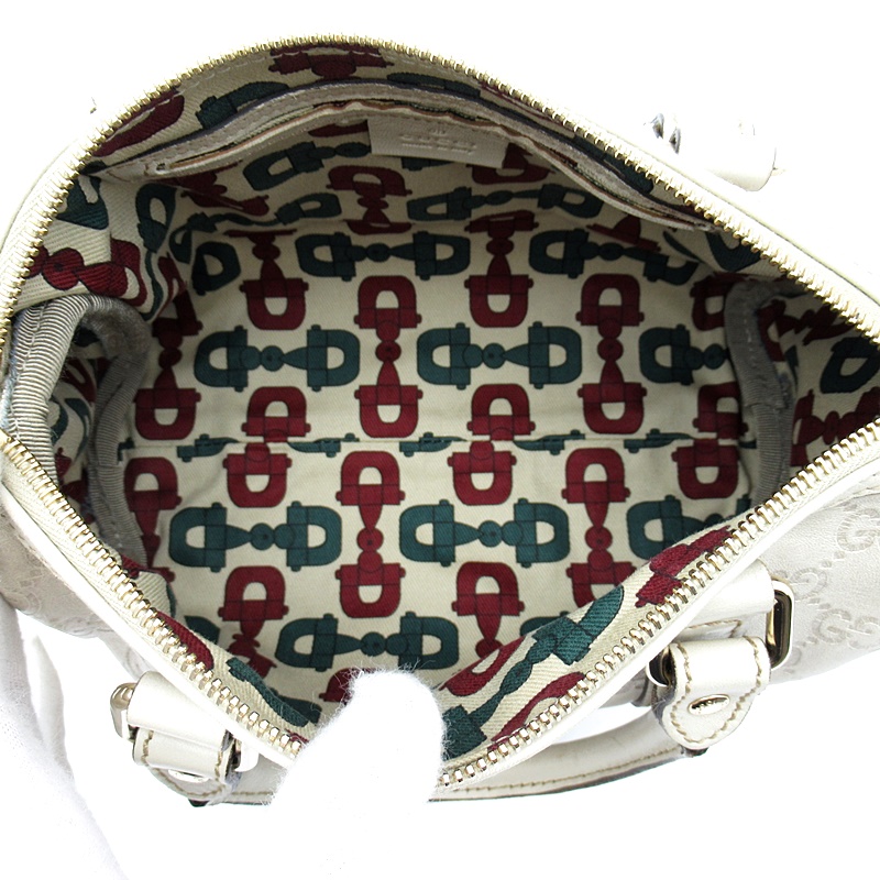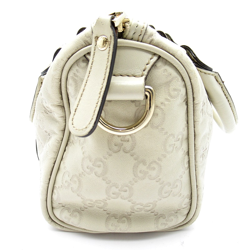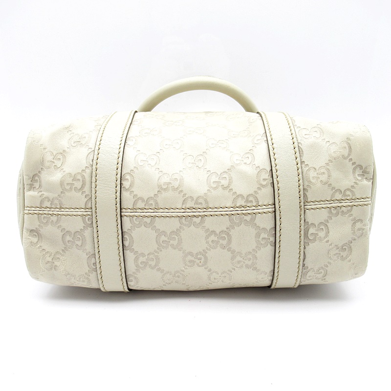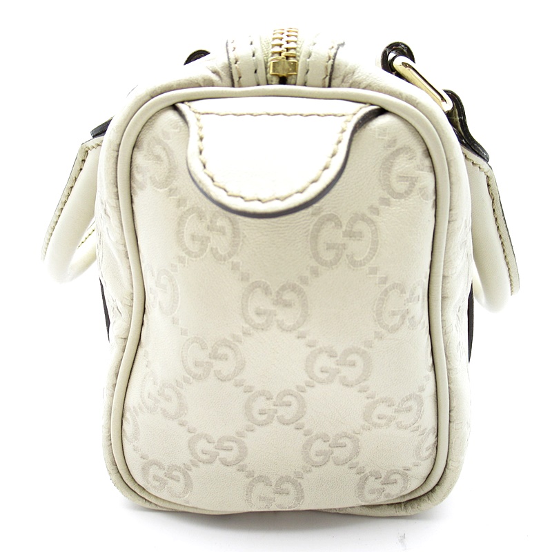 USED品。グッチのミニボストンバッグ。GG柄にレザーが上品なデザイン。コンパクトサイズなので、荷物の少ない時にはショルダーバッグより便利です。