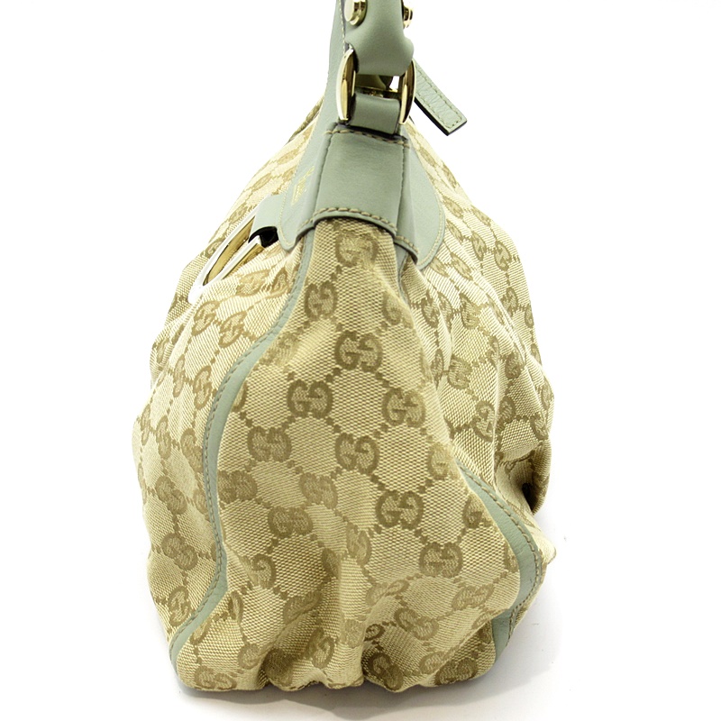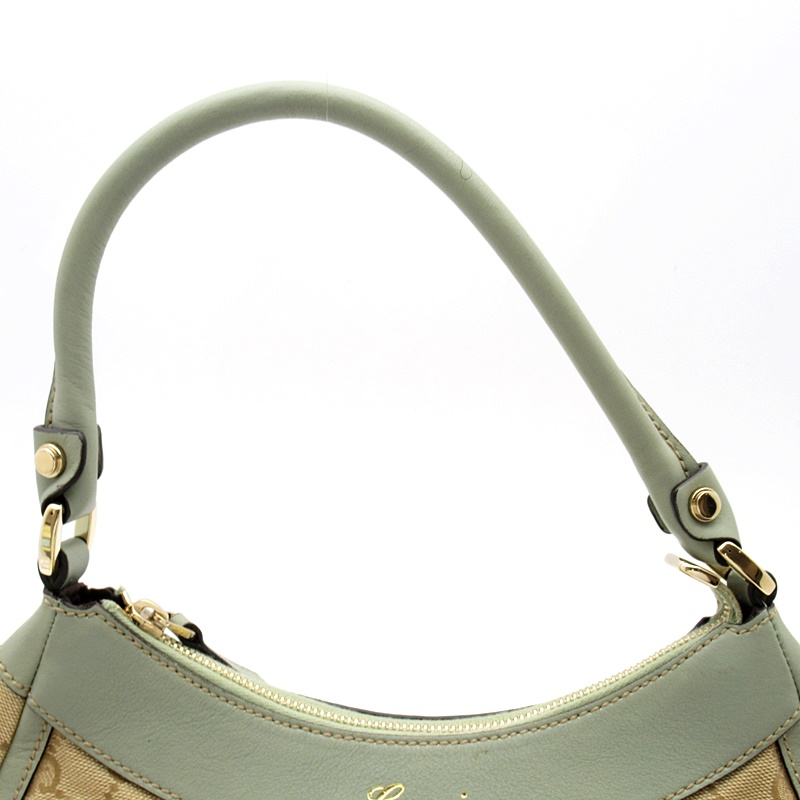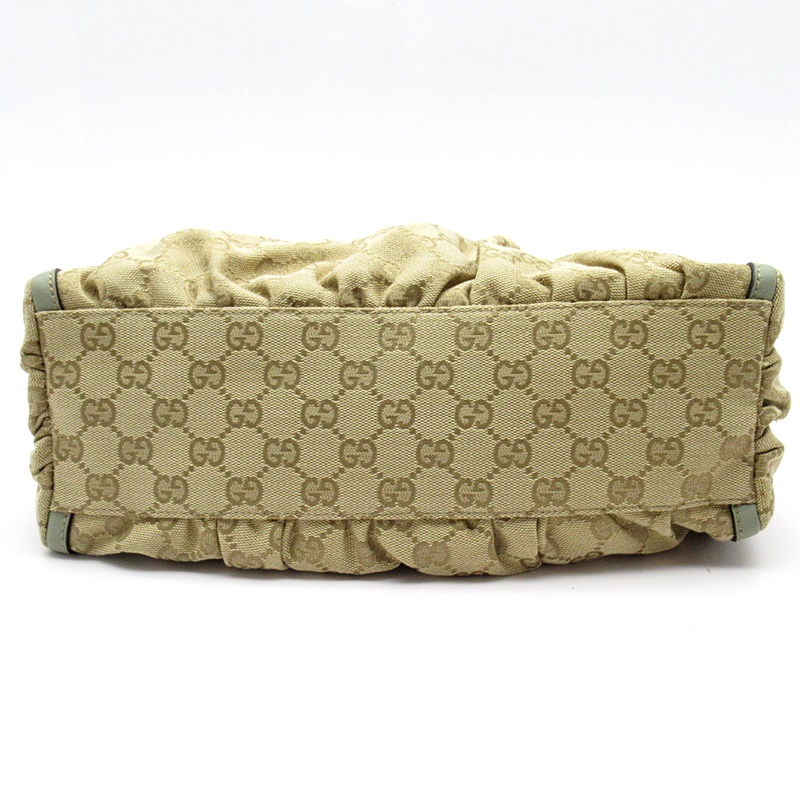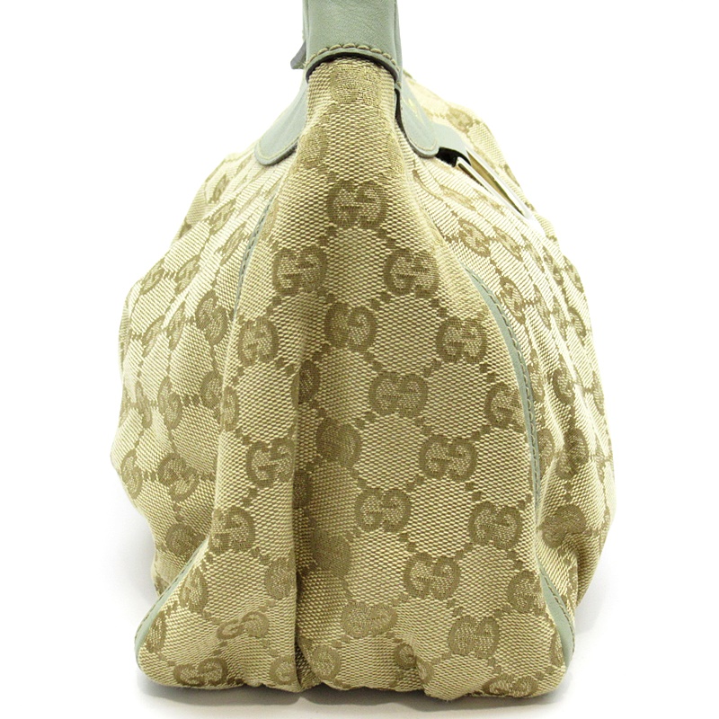 USED品。定番のGG柄が全面に施され、上品で高級感あふれるデザインとなっております。スッキリとしたフォルムにスリムなレザーライン使いがおしゃれなトートバッグです。