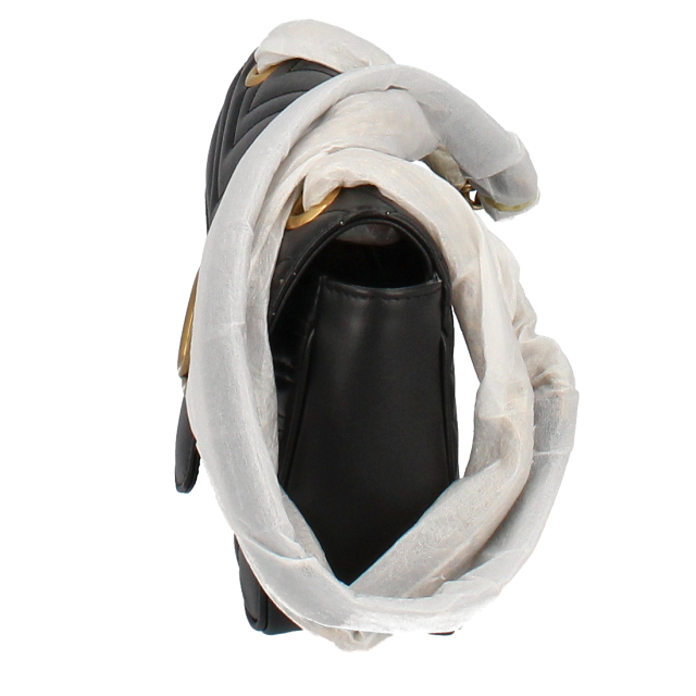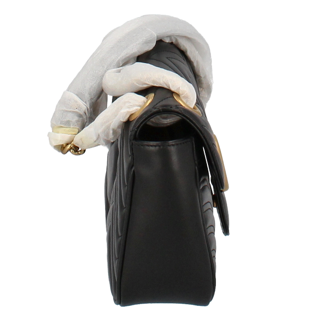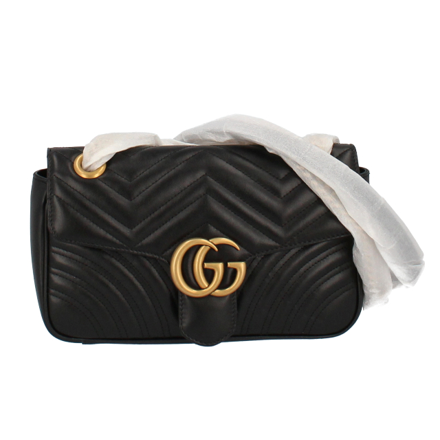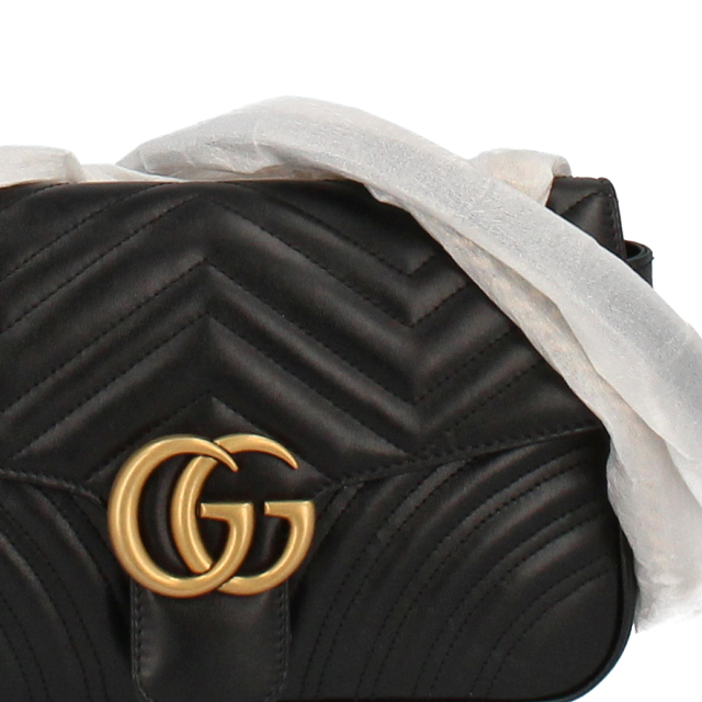 新品。ソフトなストラクチャードシェイプが特徴的なスモールサイズの〔GGマーモント〕 チェーンショルダーバッグ。オーバーサイズのフラップ クロージャーにダブルG ハードウェアがあしらわれています。