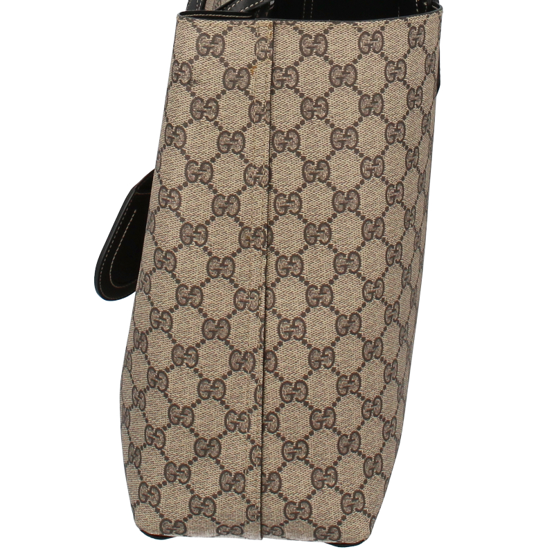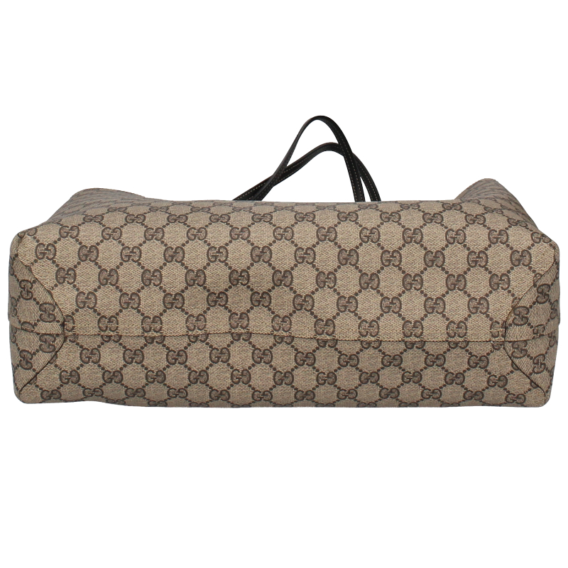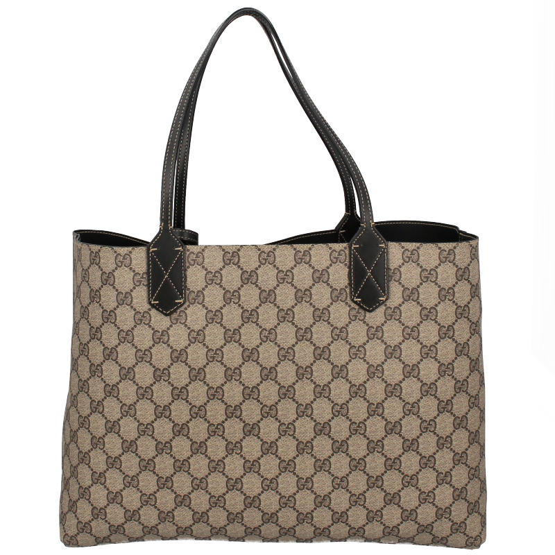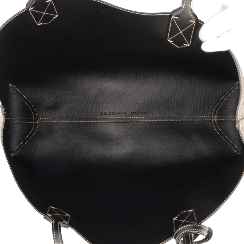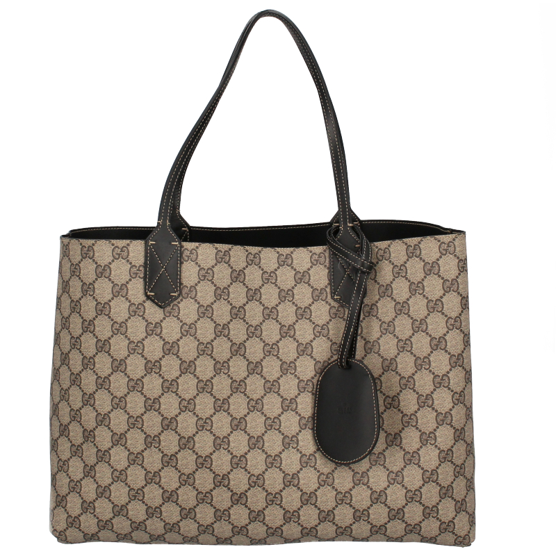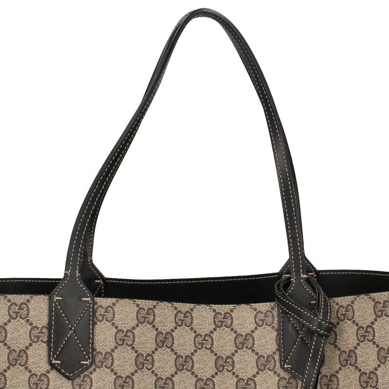 USED品。片面がグッチを象徴するGGレザー、反対面はコーティングキャンバスというリバーシブル素材を使用したラージサイズ トートバッグになっています。