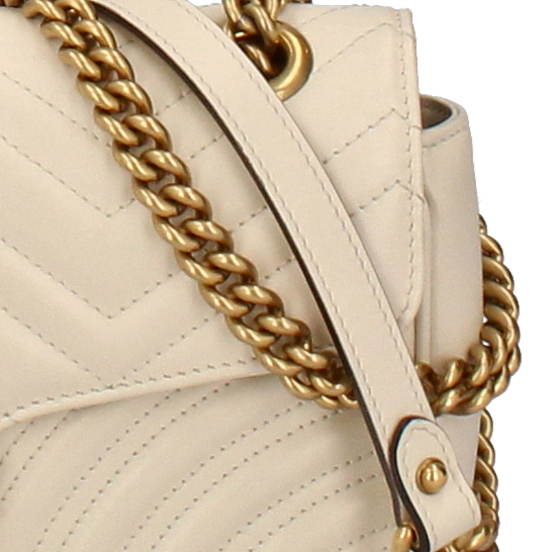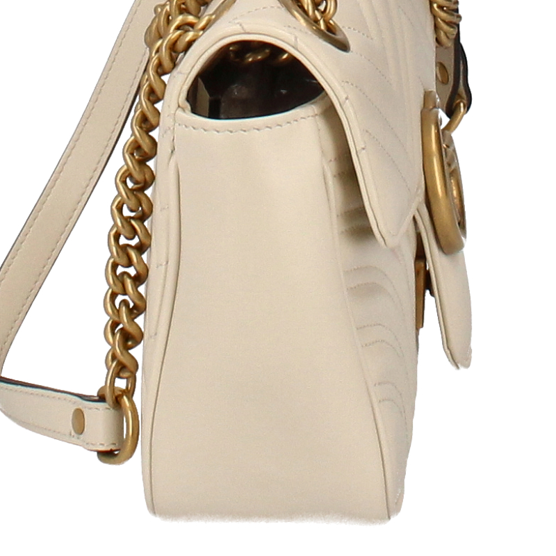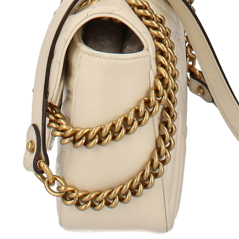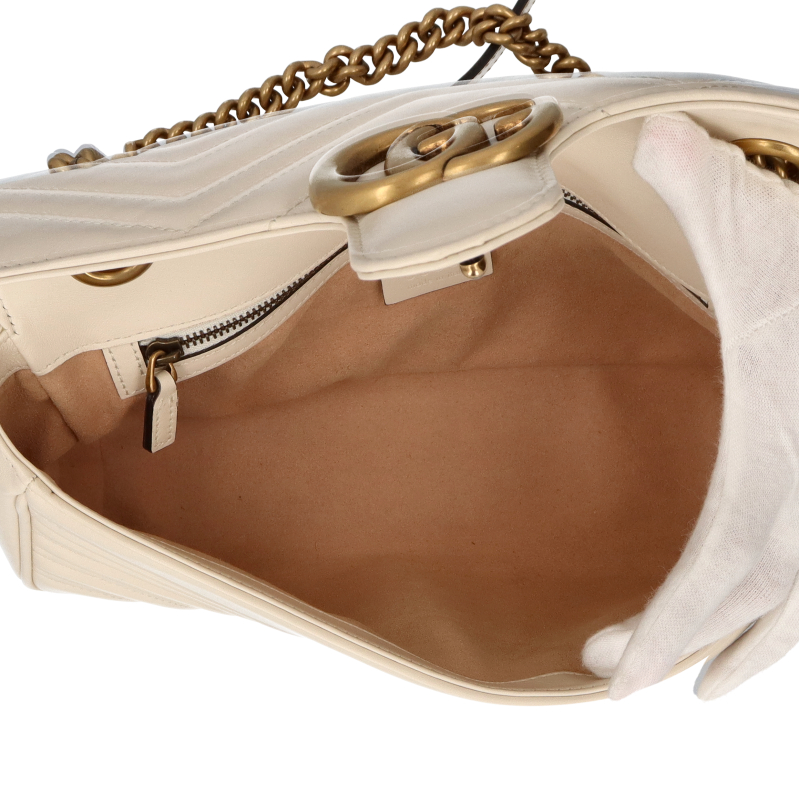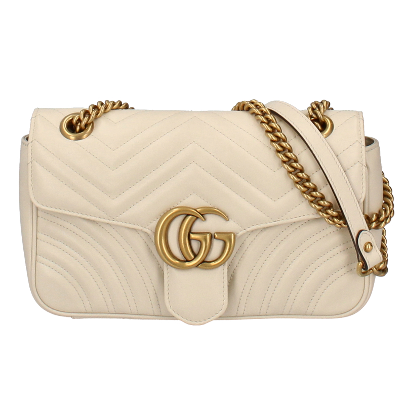 USED品。ソフトなストラクチャードシェイプが特徴的なスモールサイズの〔GGマーモント〕 チェーンショルダーバッグ。オーバーサイズのフラップ クロージャーにダブルG ハードウェアがあしらわれています。