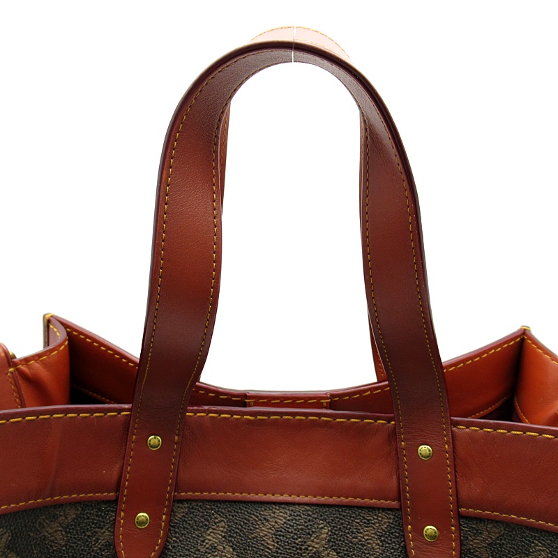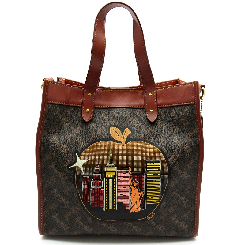USED品。可愛らしい馬車モチーフにアップル柄がアクセントになった2WAYバッグ。内側にポケットもあり使いやすいデザインとなっています。付属のストラップをつけることでショルダーバッグとしてもご使用いただけます。