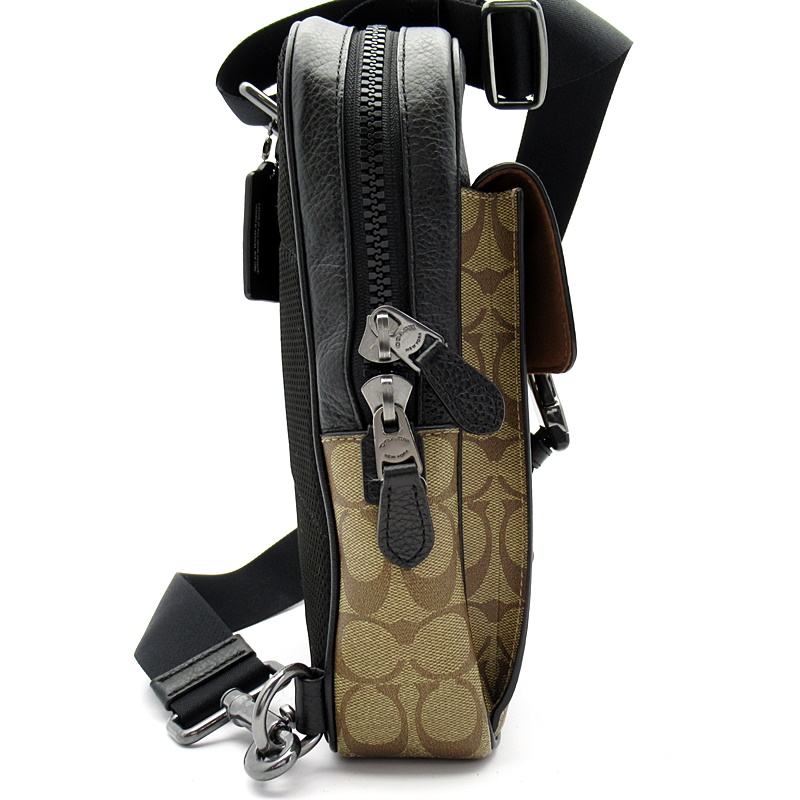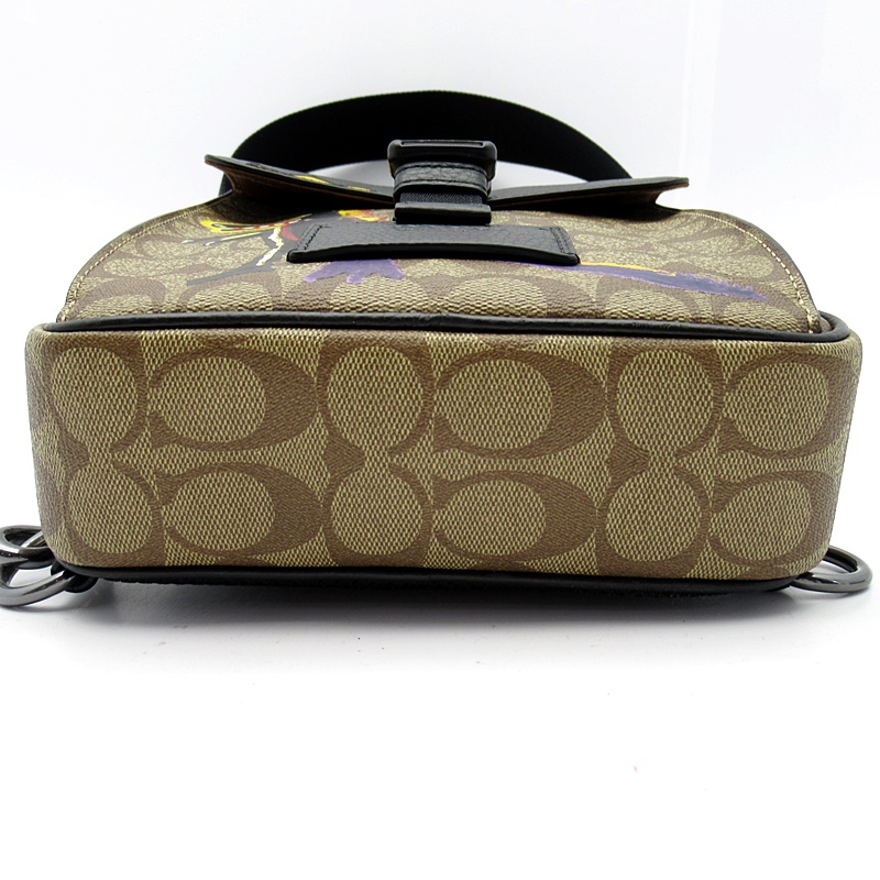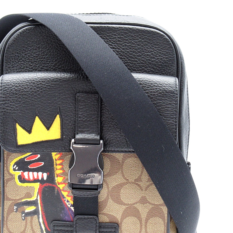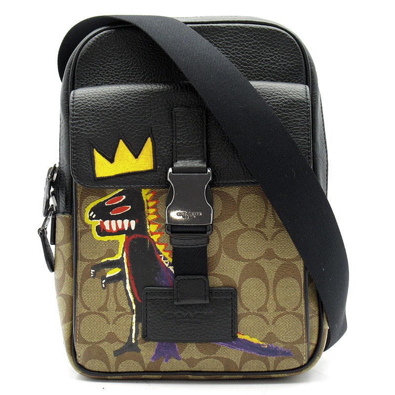 USED品。COACHとジャン・ミッシェル・バスキアのコラボレーションコレクション、スタイリッシュなボディバッグ。シグネチャーパターンが施されており、恐竜のイラストが目を引きます。ショルダーストラップは左右どちらでも付け替えて使用できるタイプです。