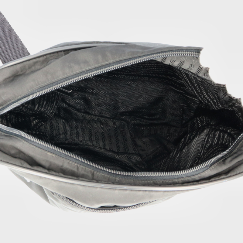 USED品。ナイロン素材のカジュアル感を保ちつつ、スクエアフォルムでカッチリとした印象を与えるショルダーバッグです。