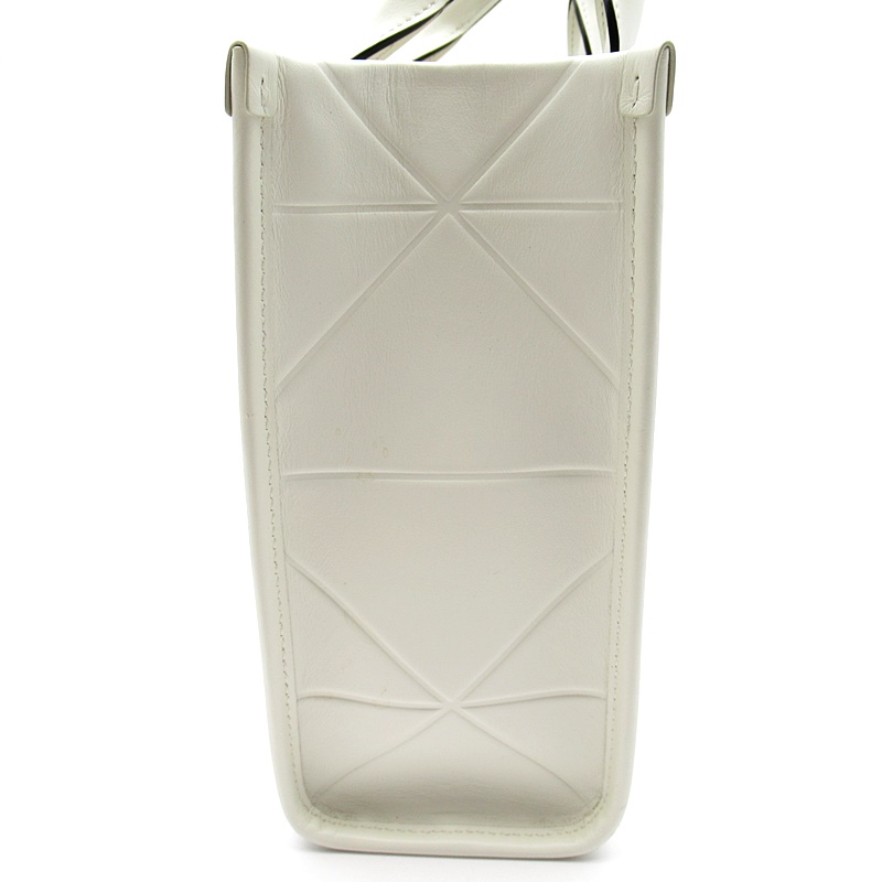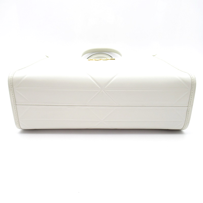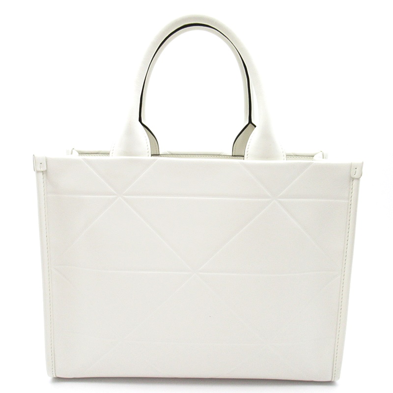 USED品。ダブルハンドルと内側にレザーのキーリングを備えた、エレガントでミニマルなデザインのレザーのハンドバッグ。ラダを象徴するトライアングルを想起させるモチーフが映え、現代的な魅力にあふれるアイテム。
