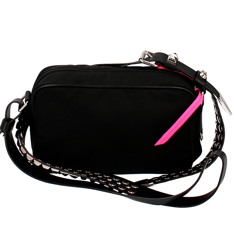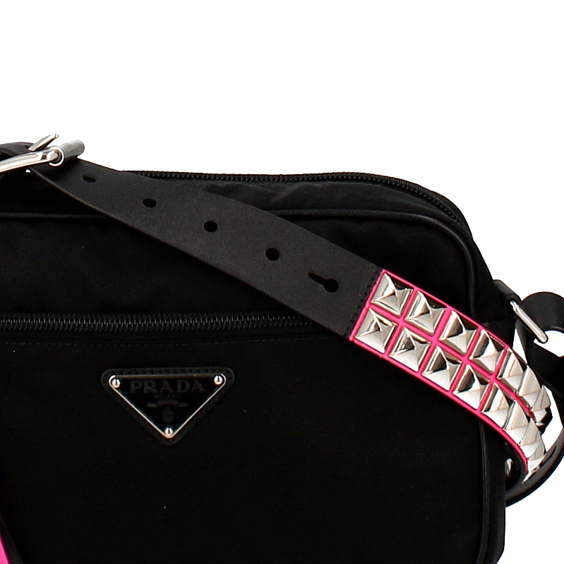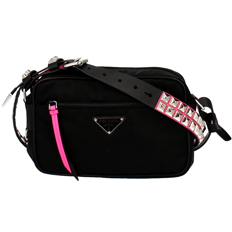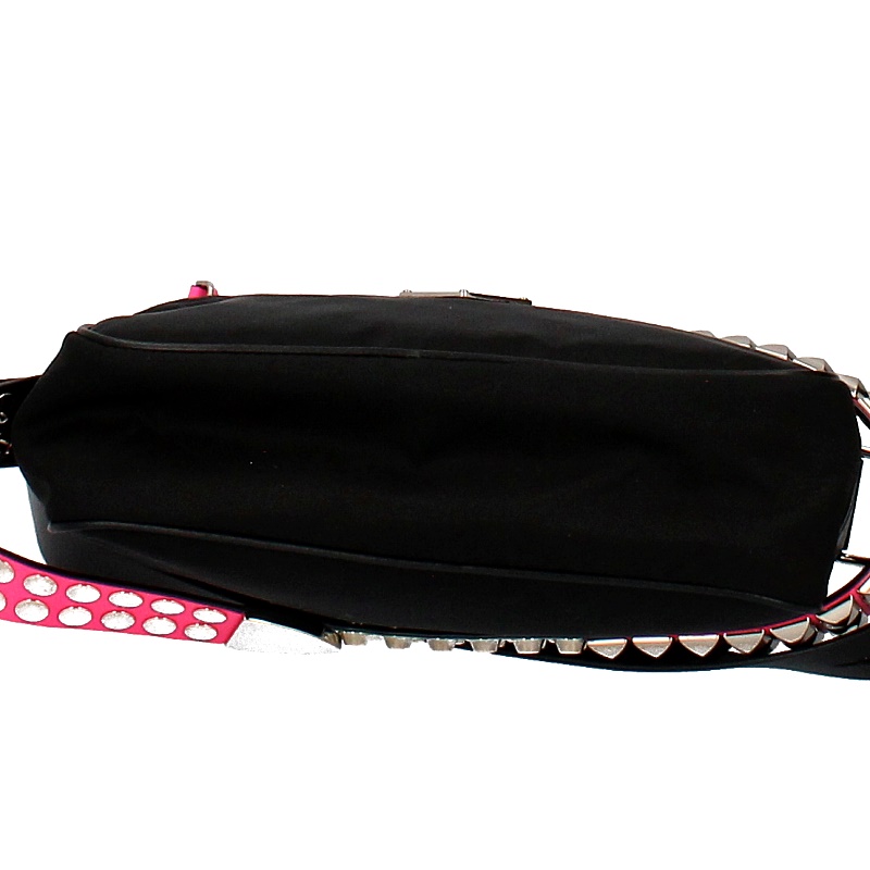USED品。プラダならではのシンプルなデザインにネオンカラーのピンクとスタッズがアクセントになったショルダーバッグです。程良い大きさの為ちょっとしたお出かけにも最適です。