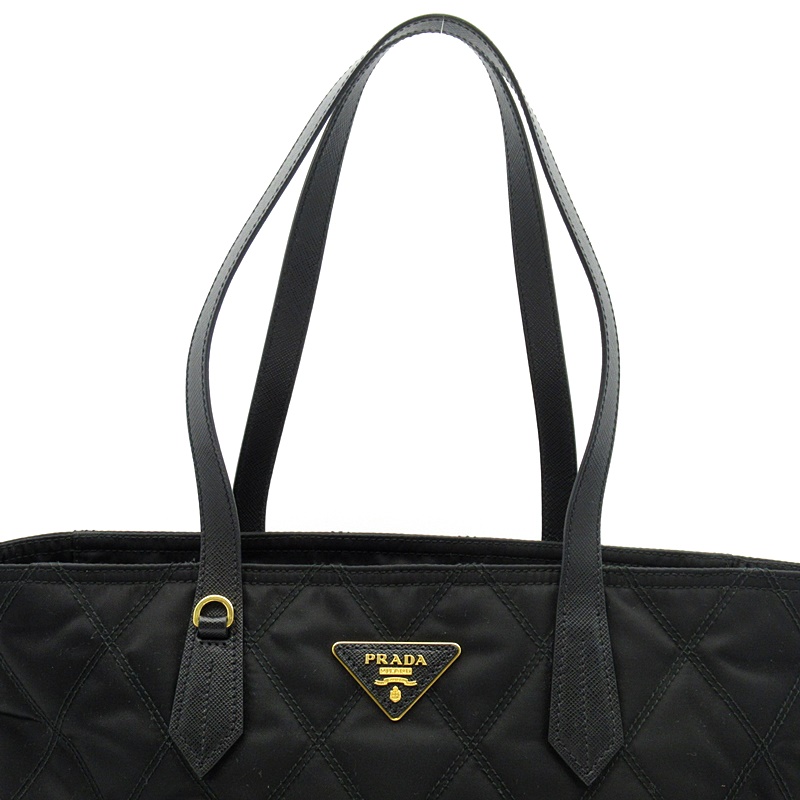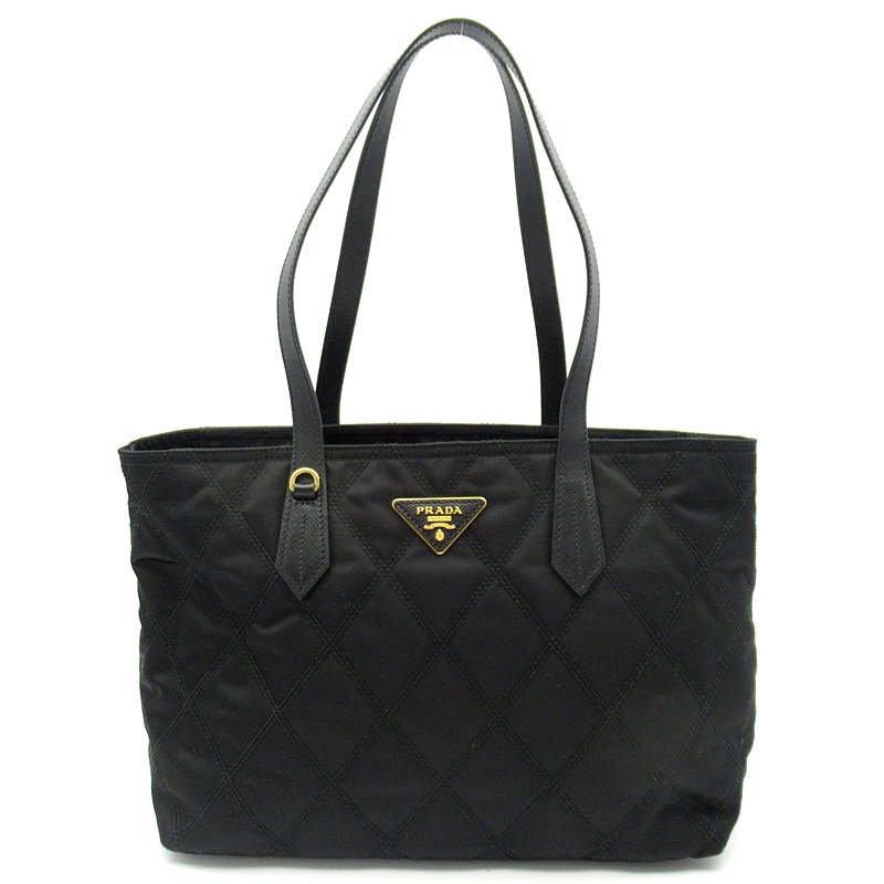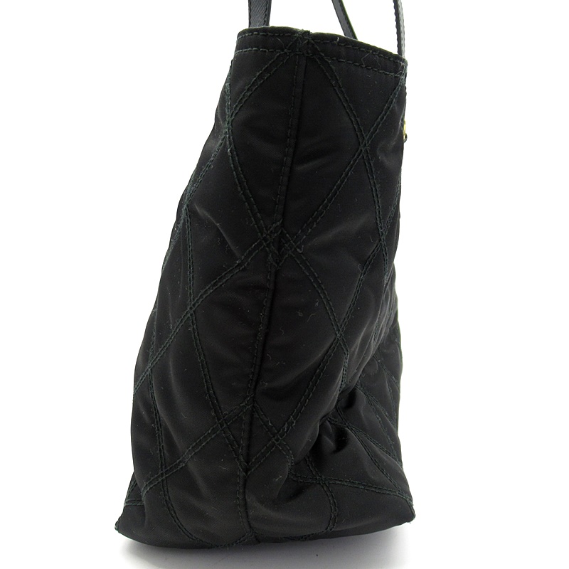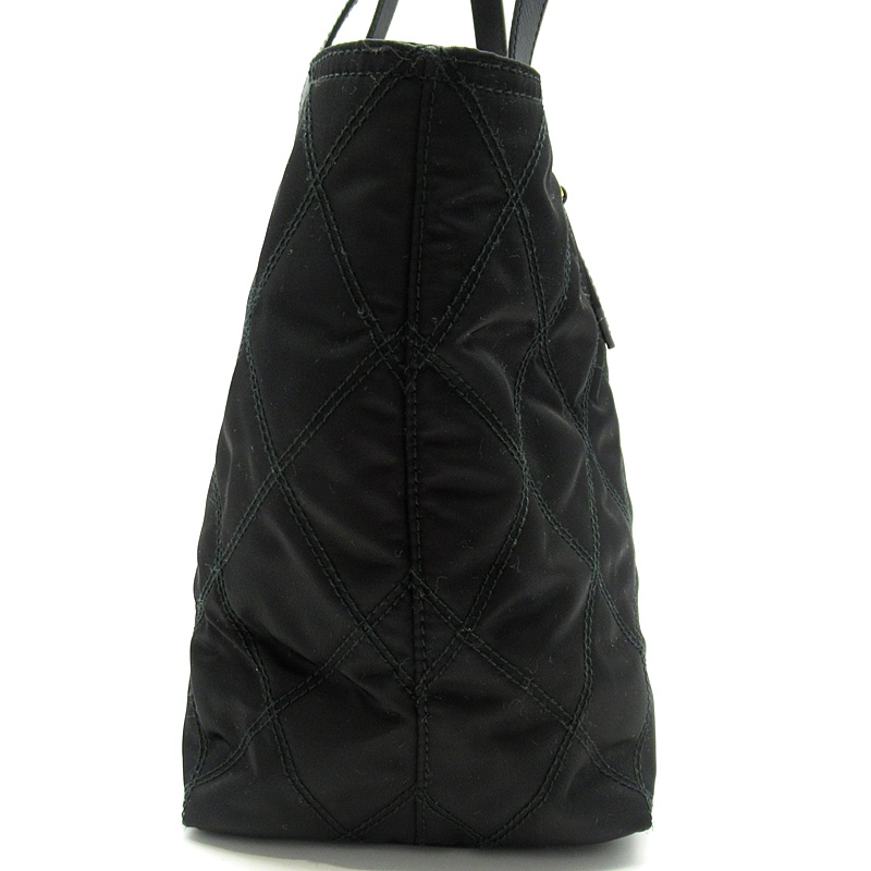 USED品。ブラックのキルティングにトレードマークのロゴプレートがオシャレなトートバッグです。軽量で水や汚れにも強く、普段使いに最適です。